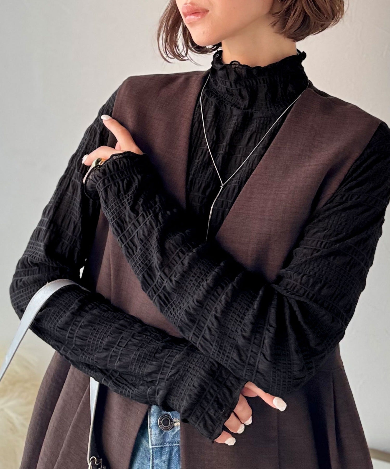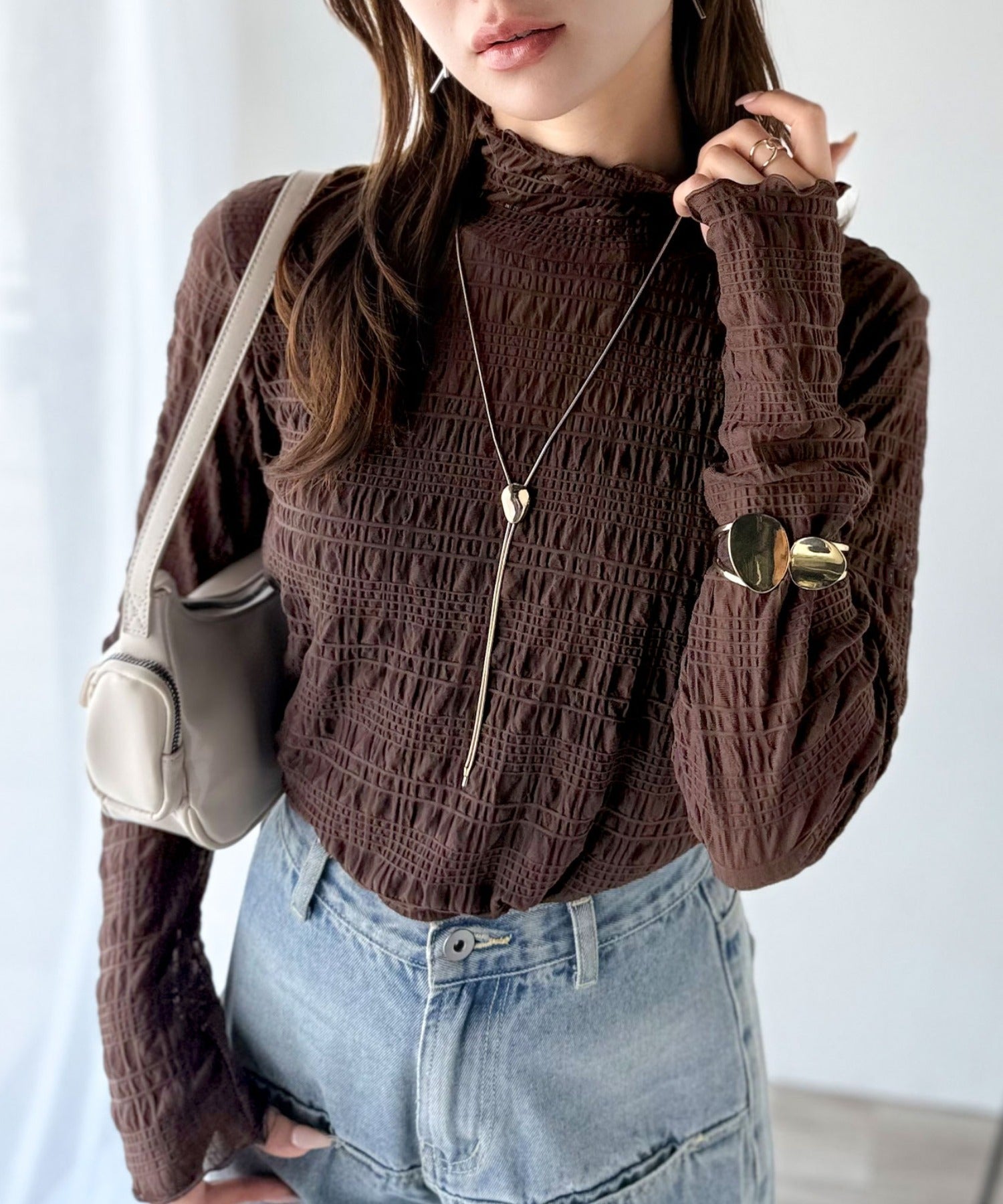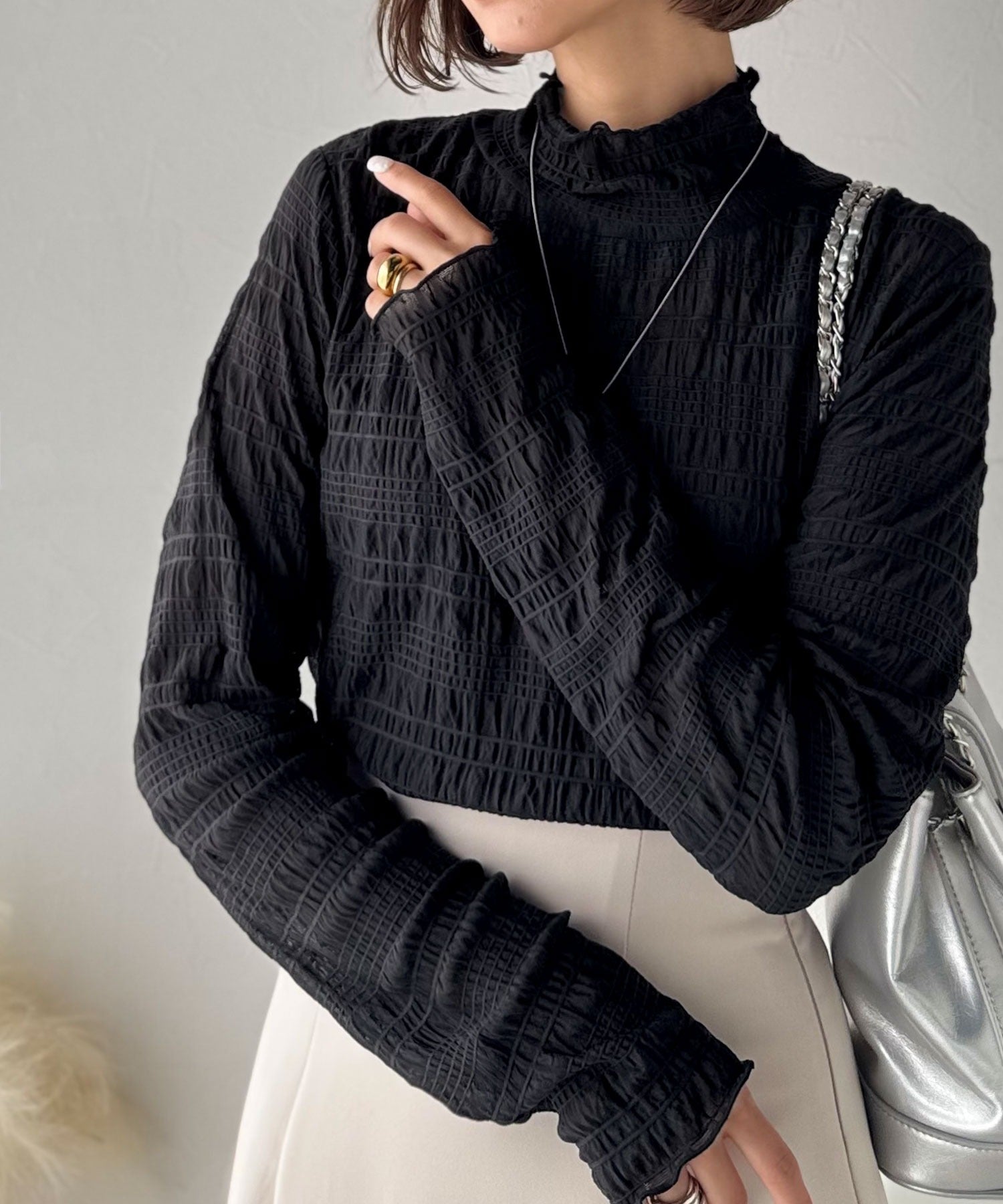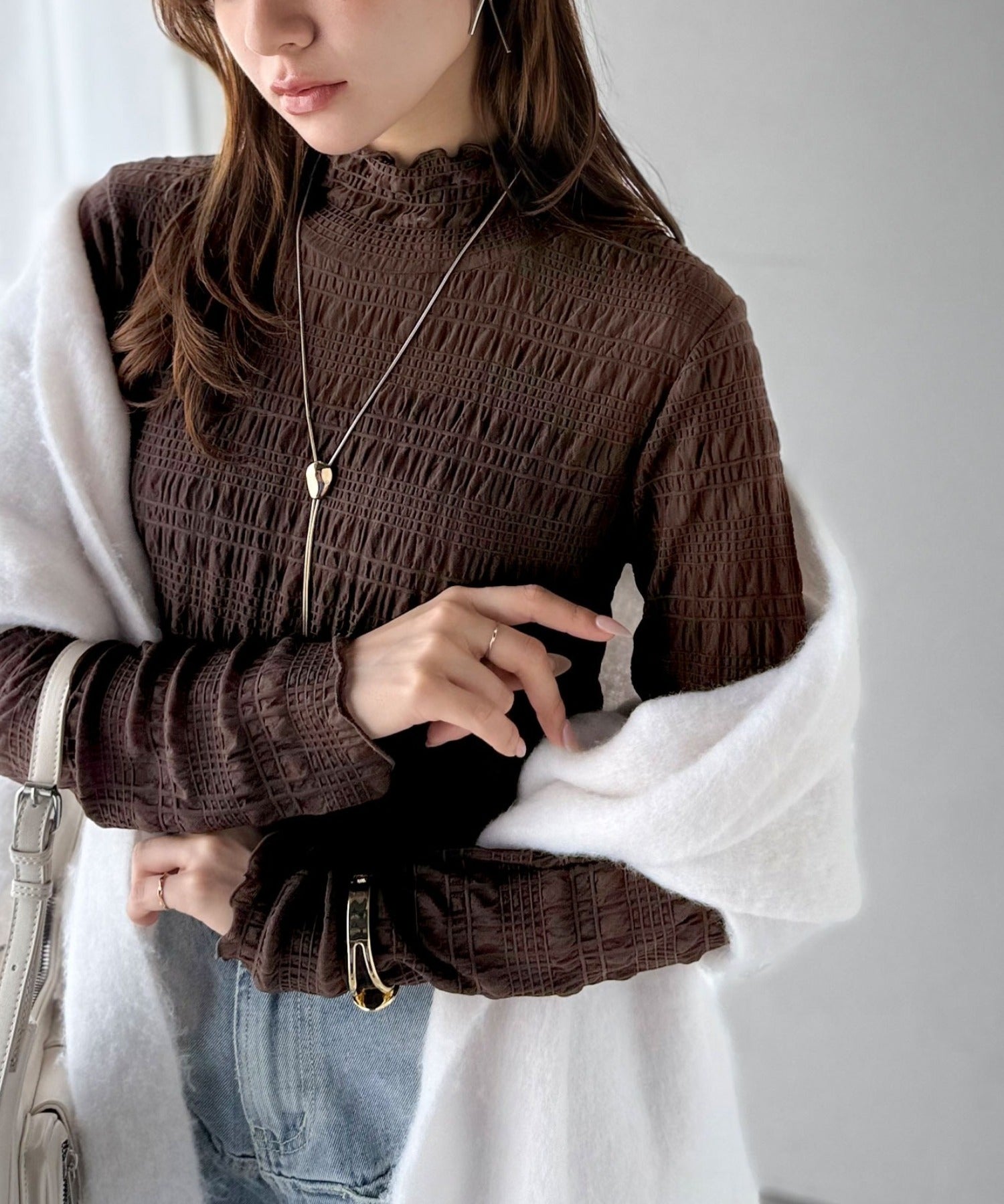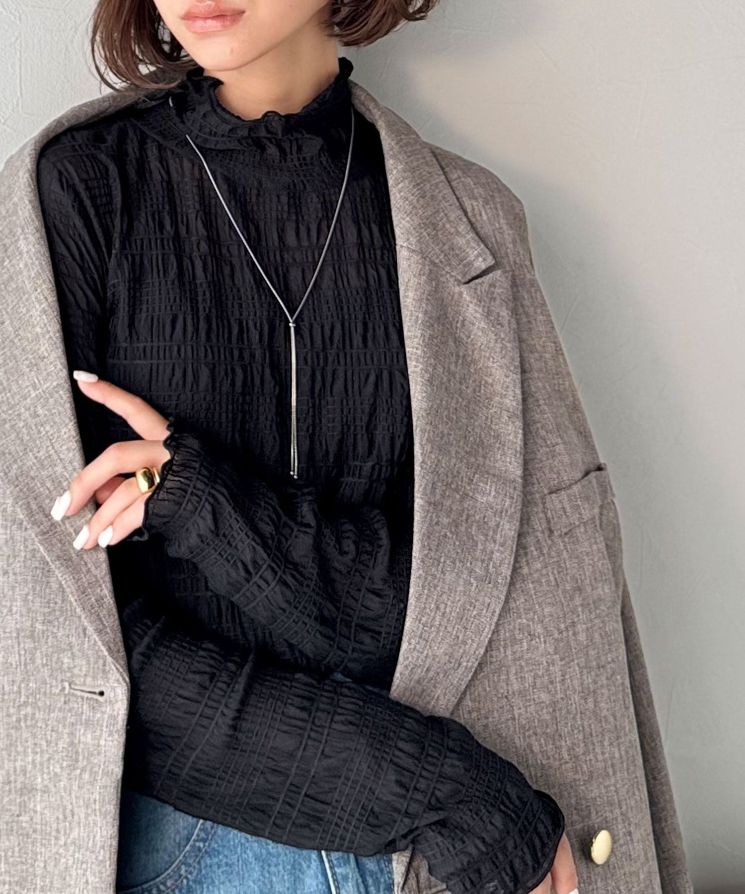 ほんのり透け感、シアー感で魅せる♪シャーリングシアーハイネックトップス(長袖) ce1010474