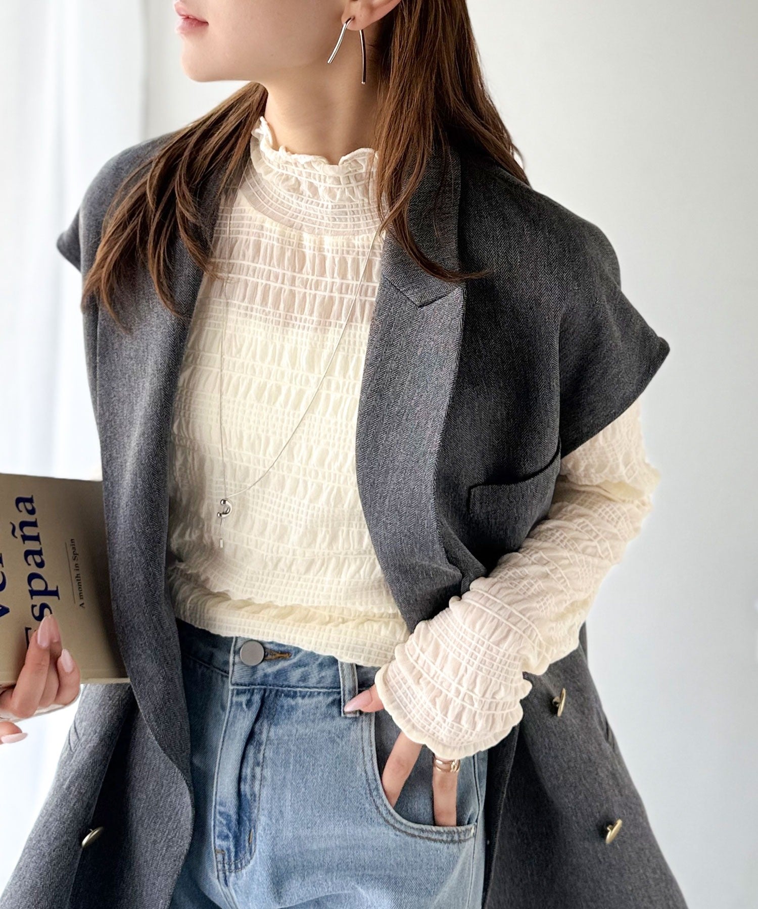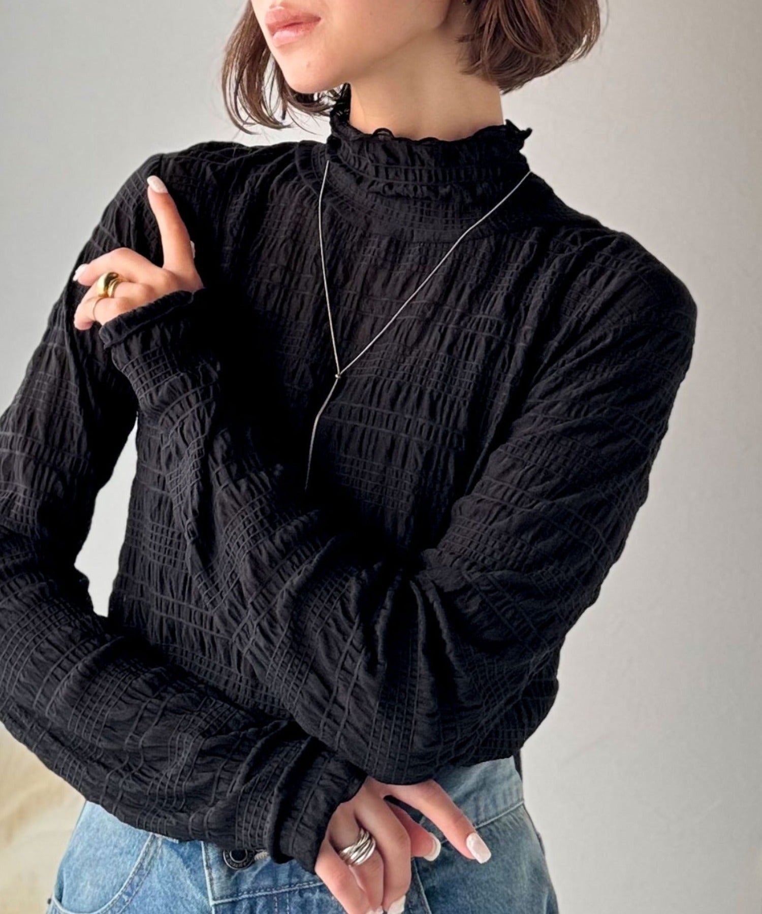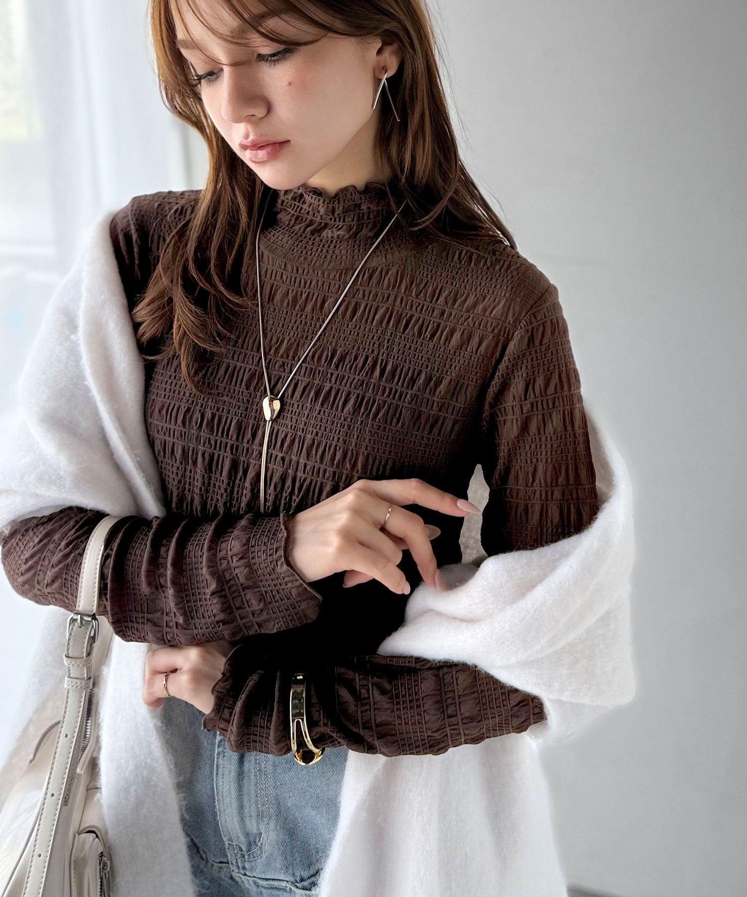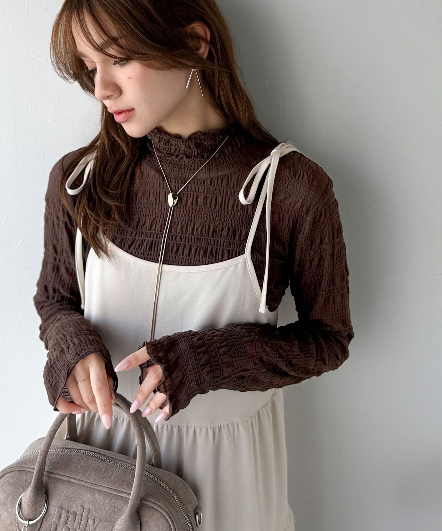 ほんのり透け感、シアー感で魅せる♪シャーリングシアーハイネックトップス(長袖) ce1010474