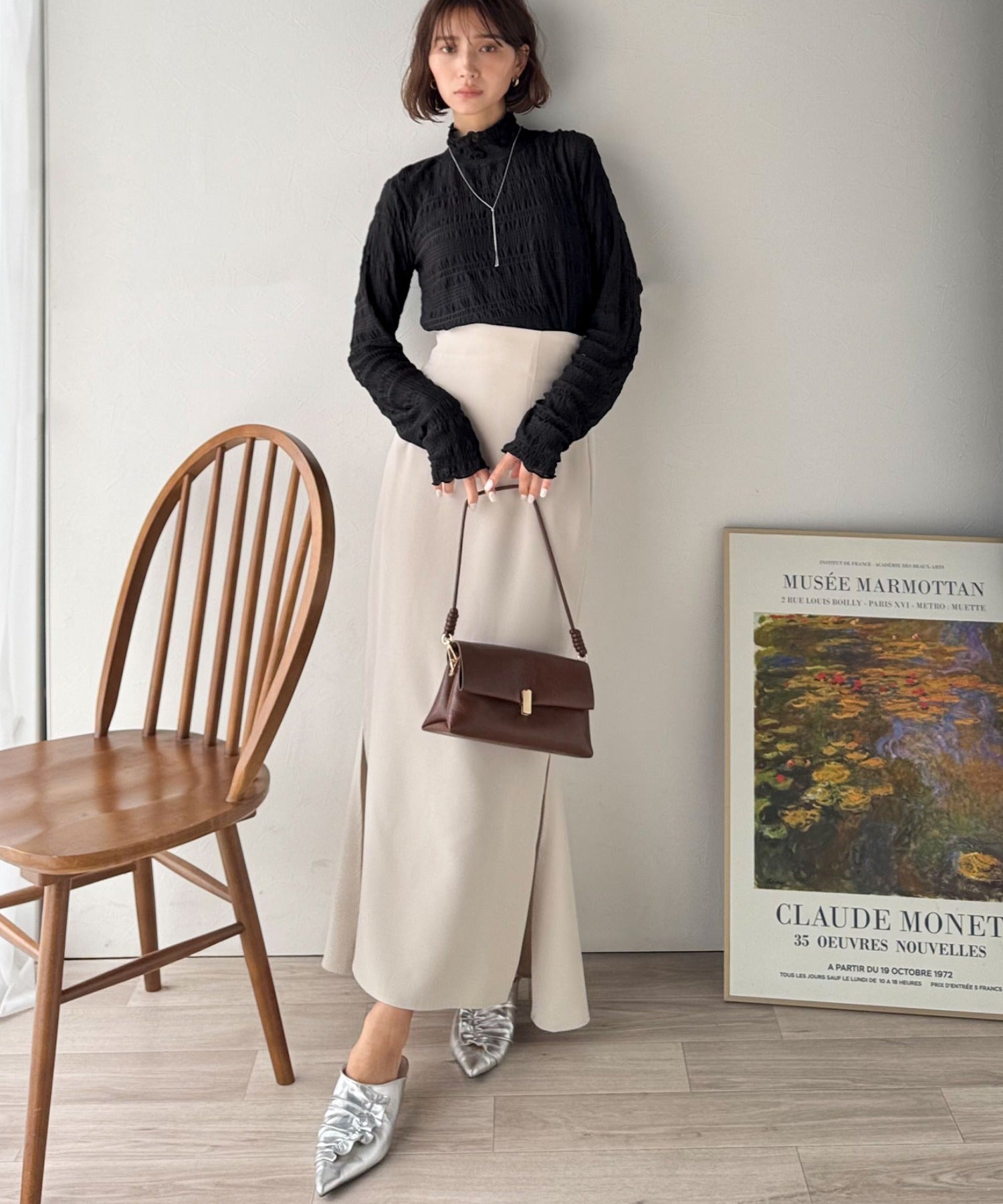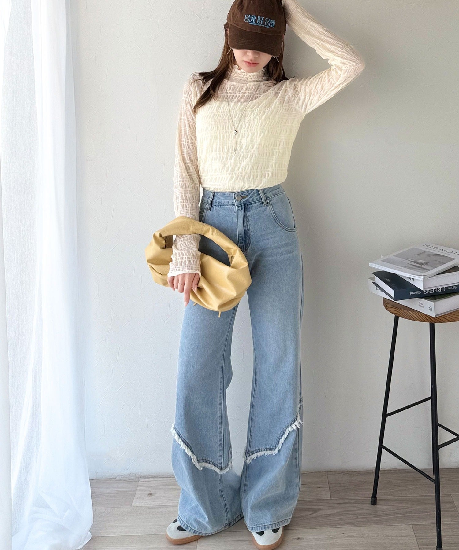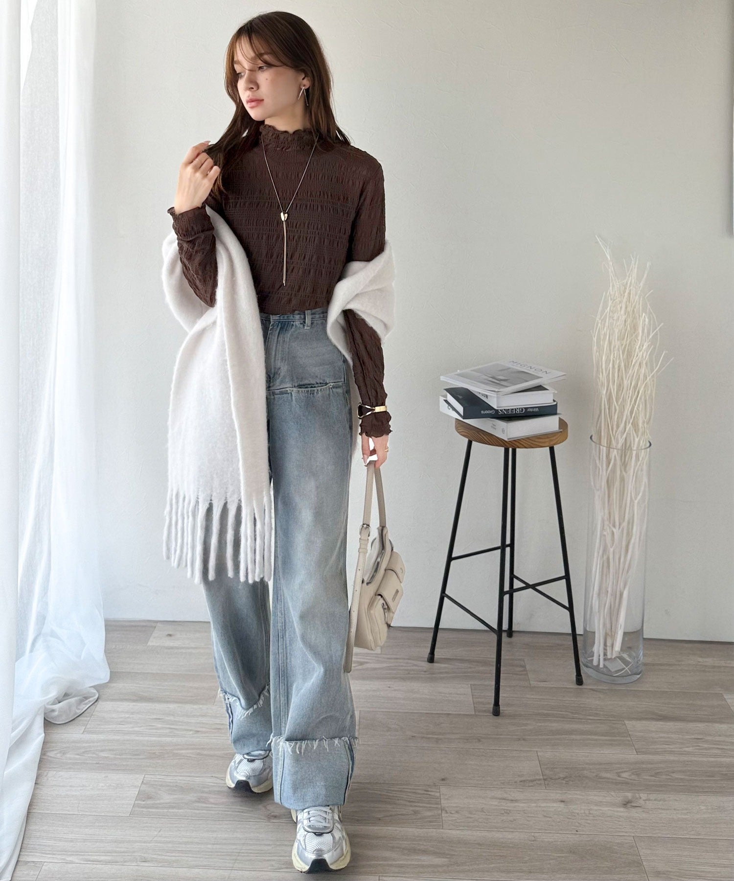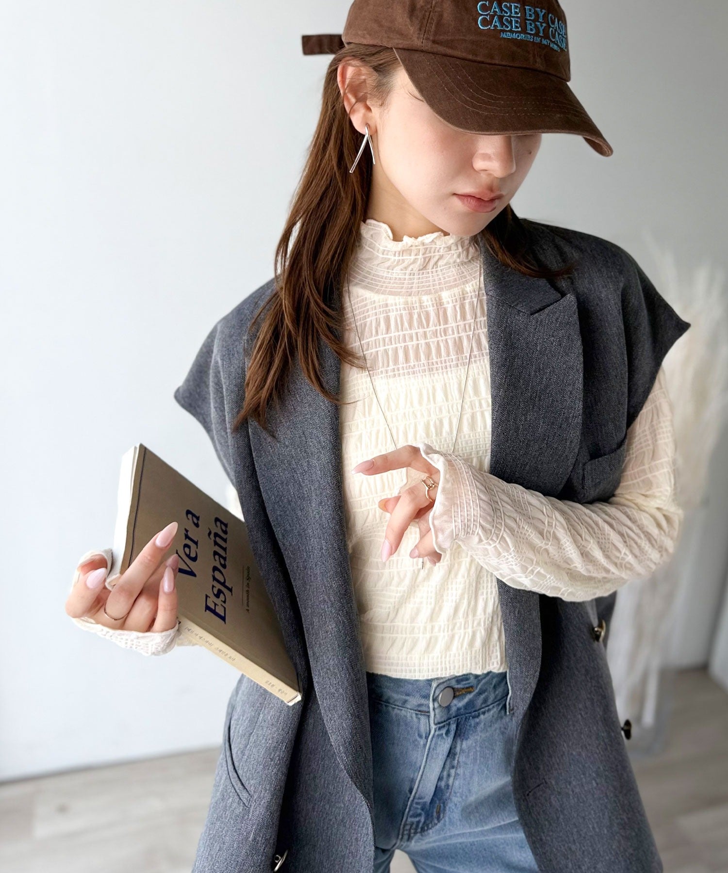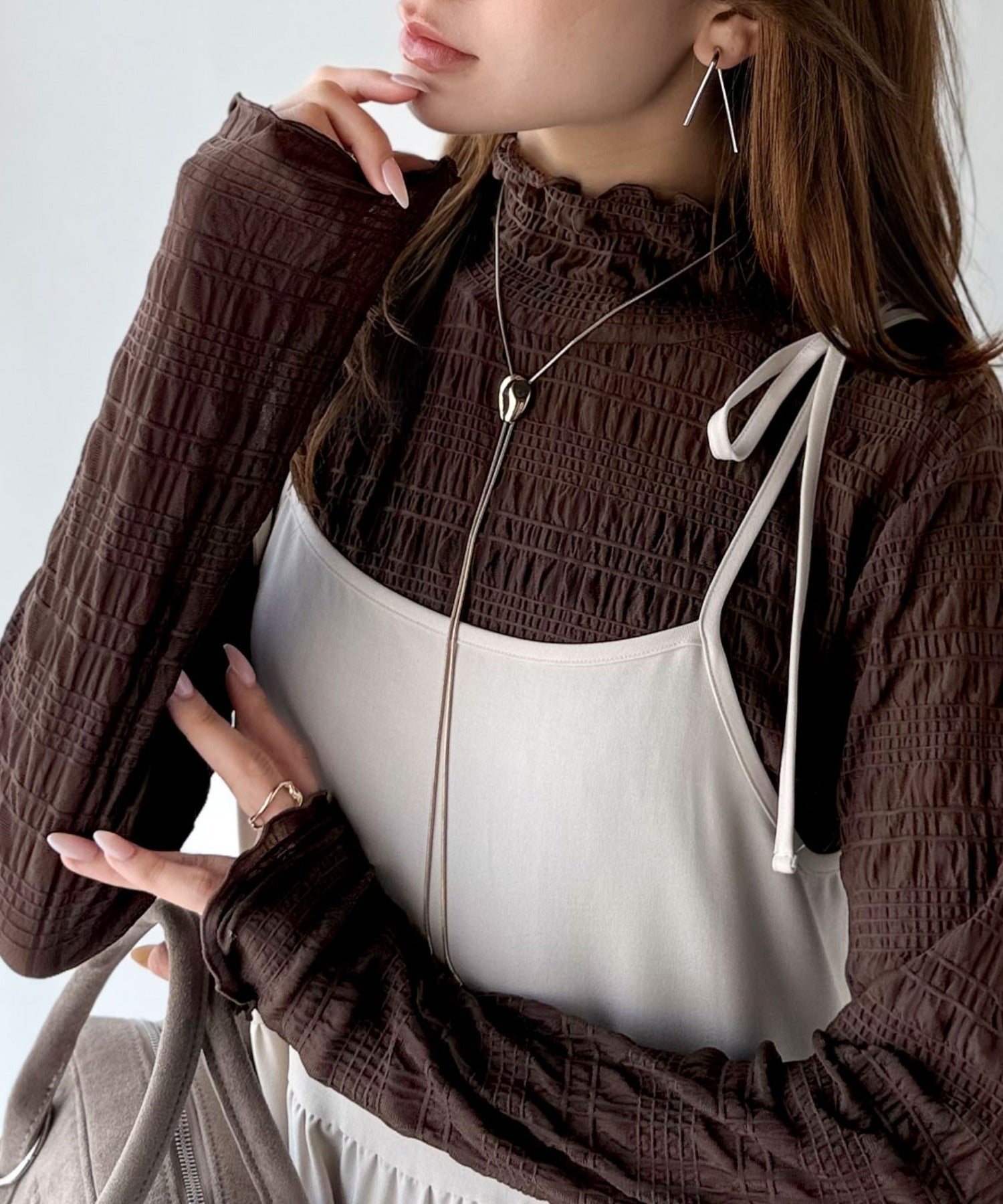 ほんのり透け感、シアー感で魅せる♪シャーリングシアーハイネックトップス(長袖) ce1010474