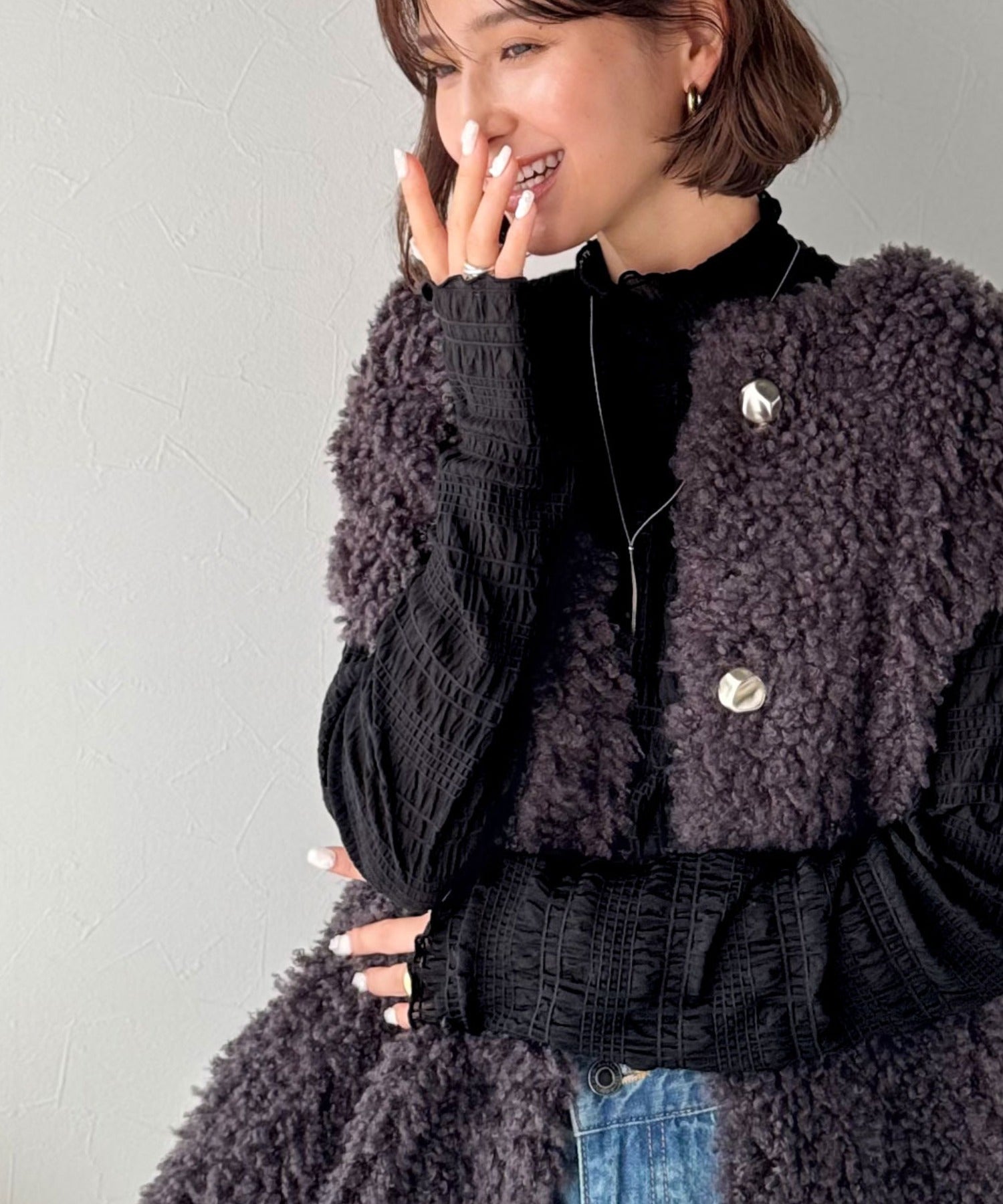 襟元・袖口・裾にはメローステッチを施し、シンプルな中にも女性らしい可愛さをプラス♪