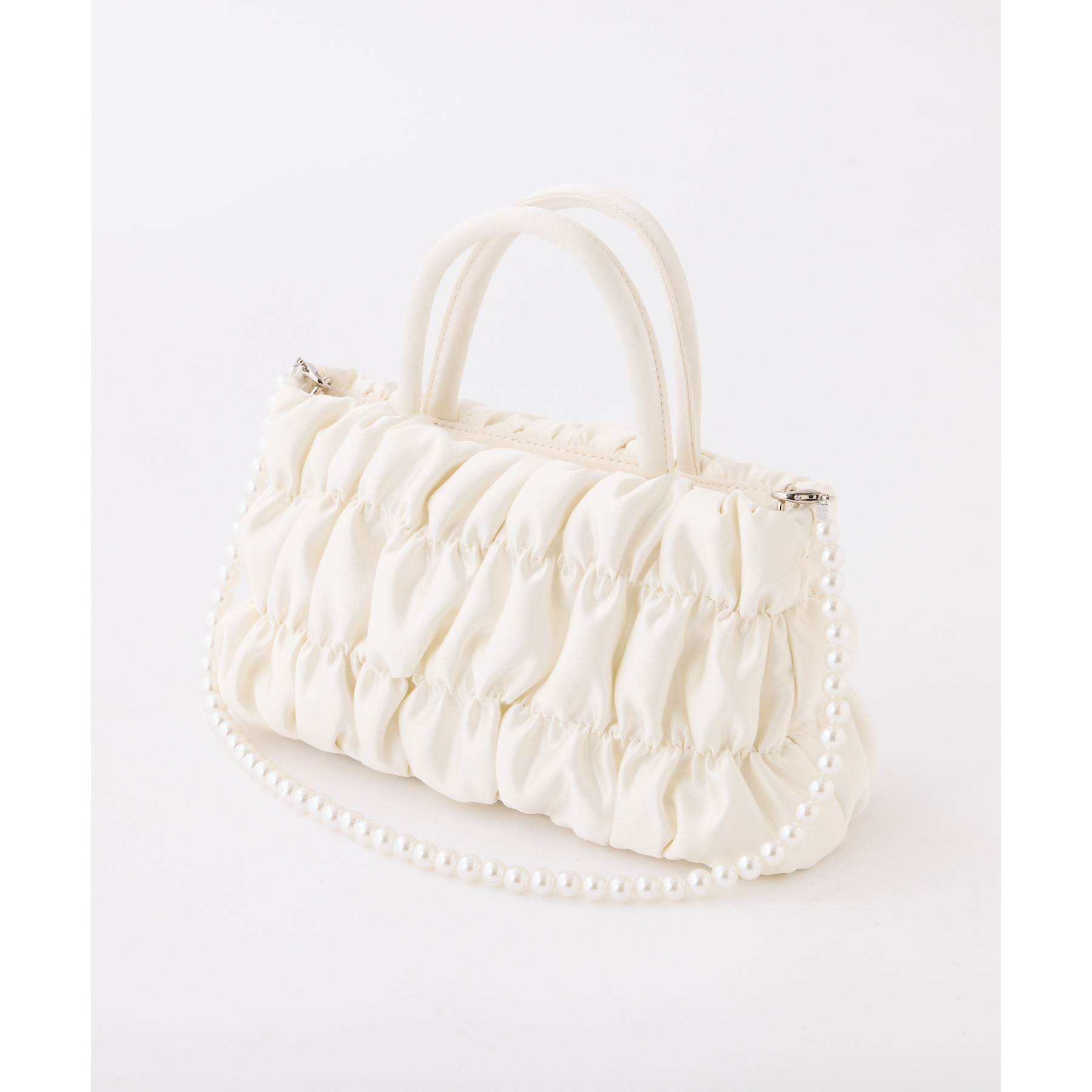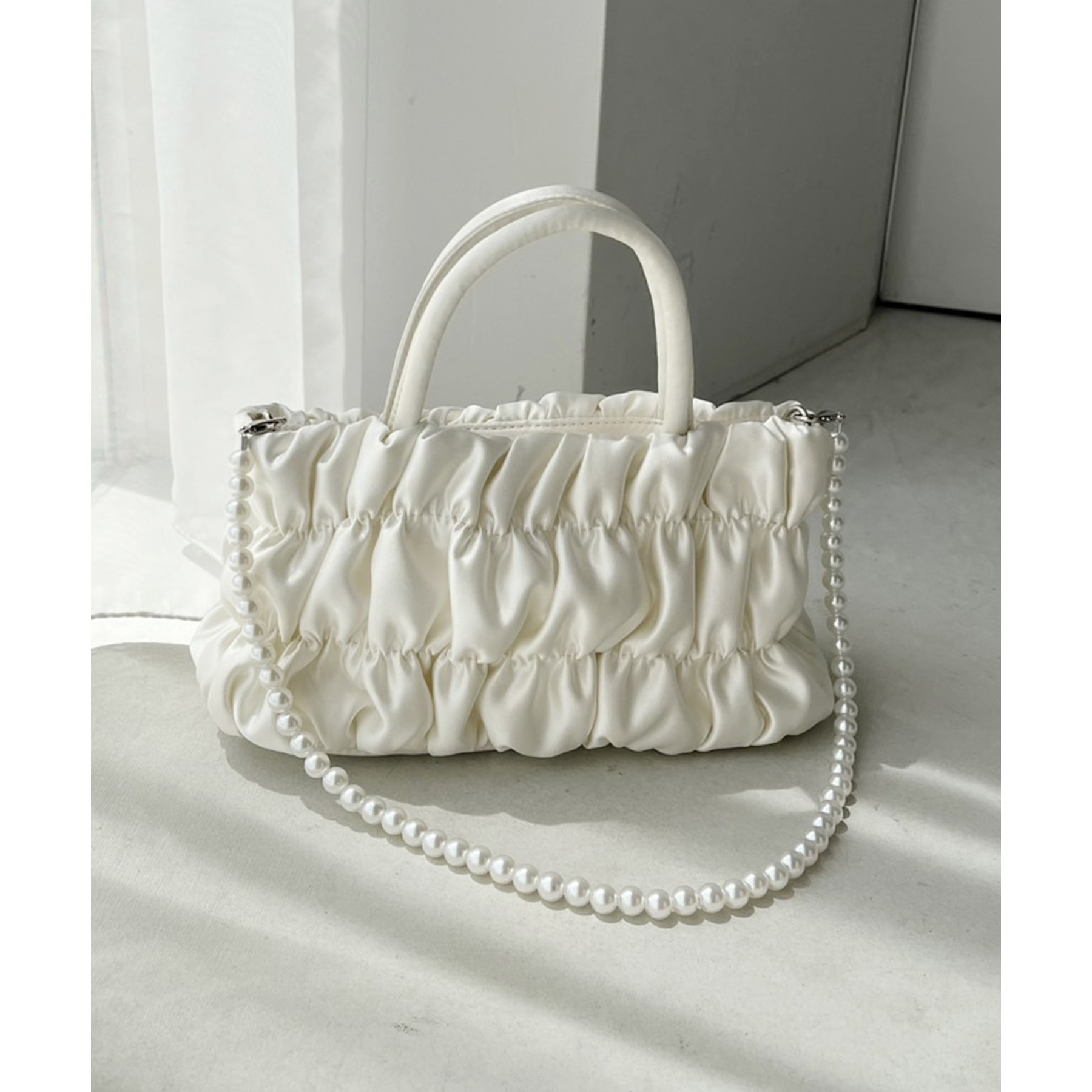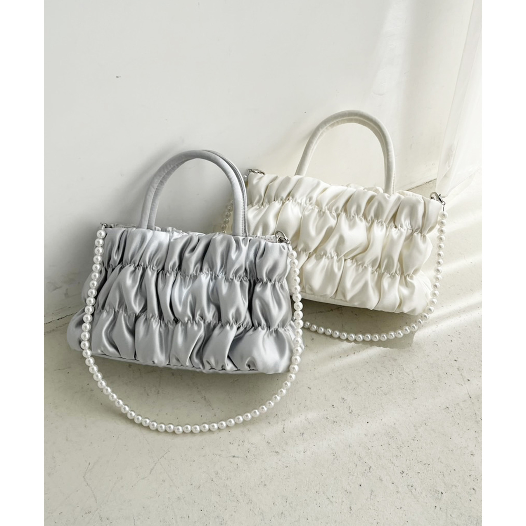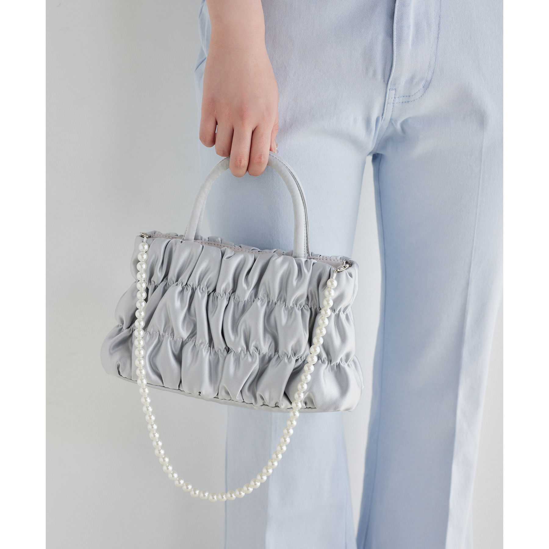 柔らかなシャーリングデザインに、華やかなパールショルダーがアクセントのバッグ