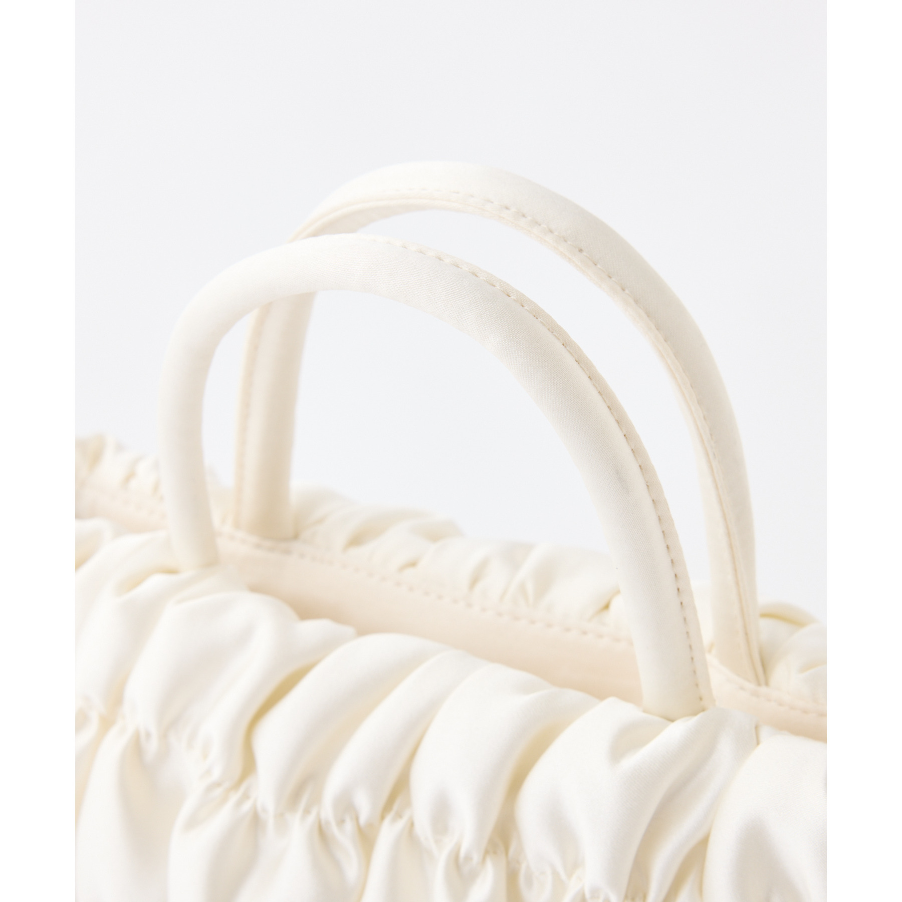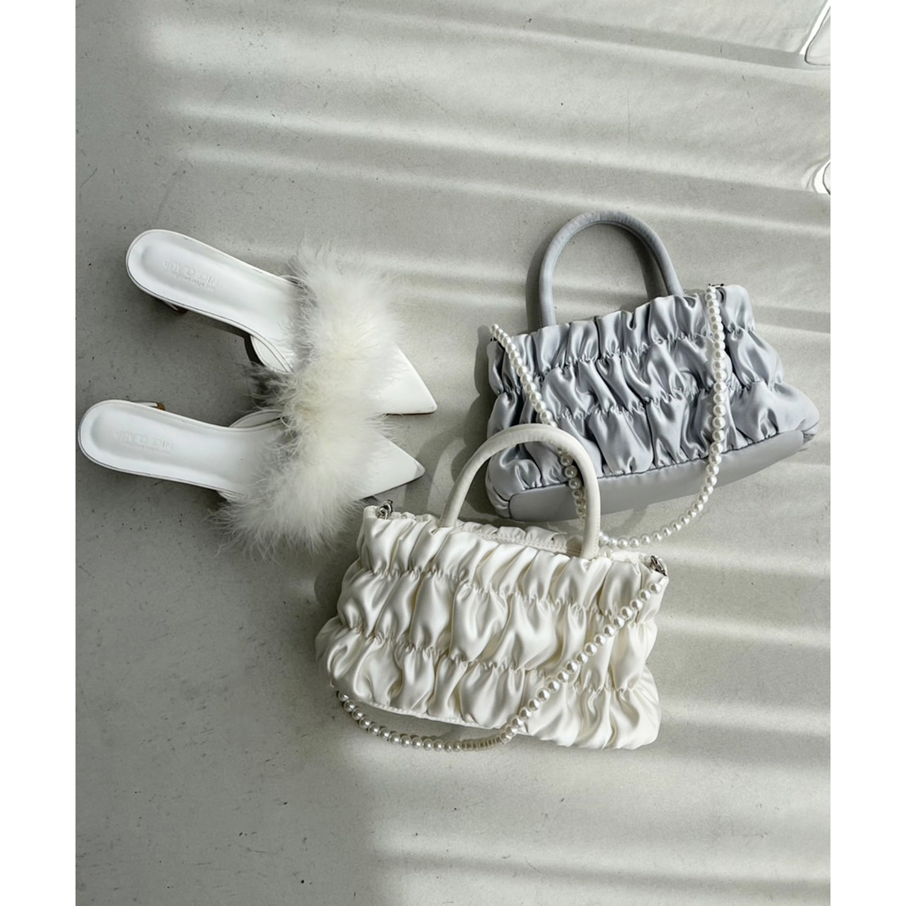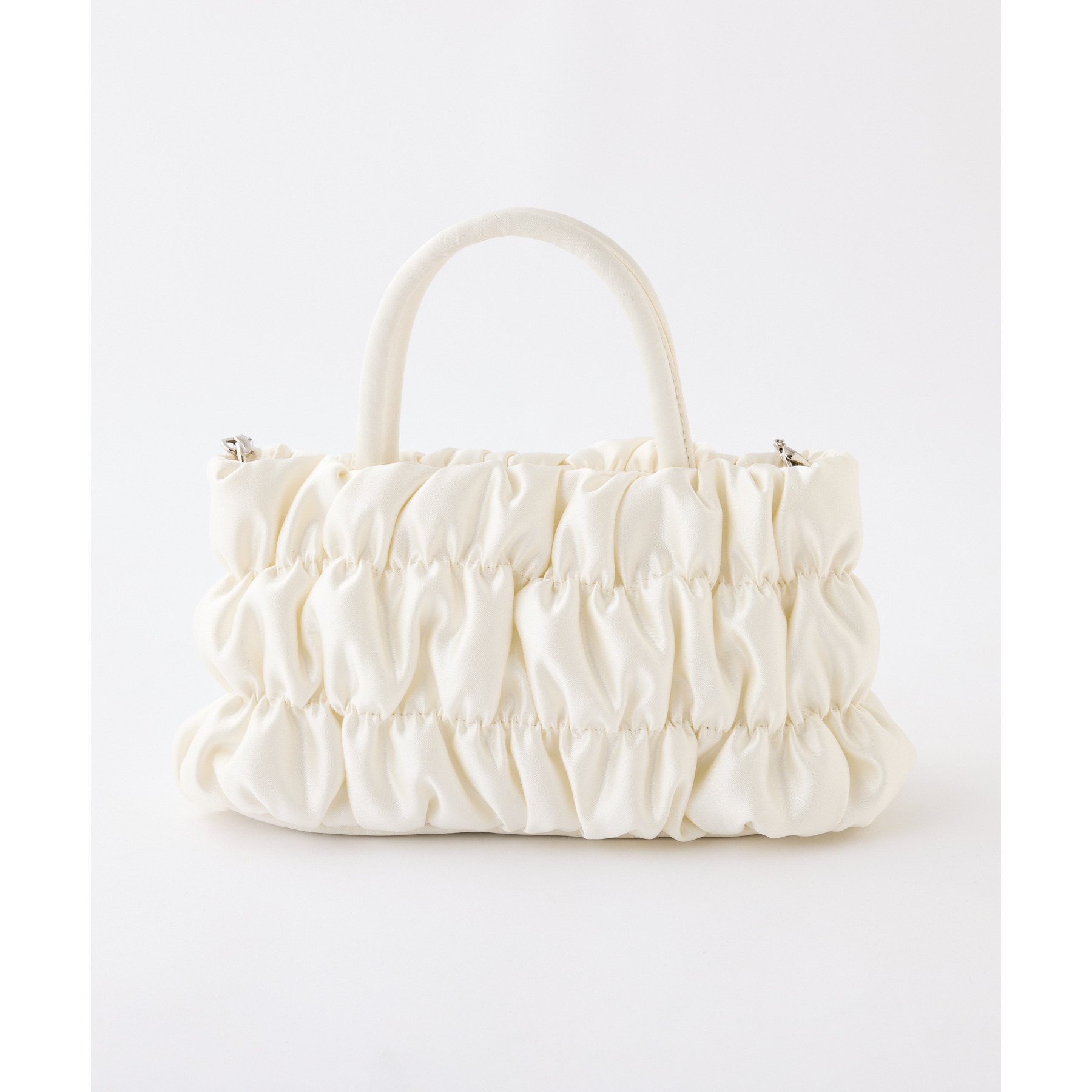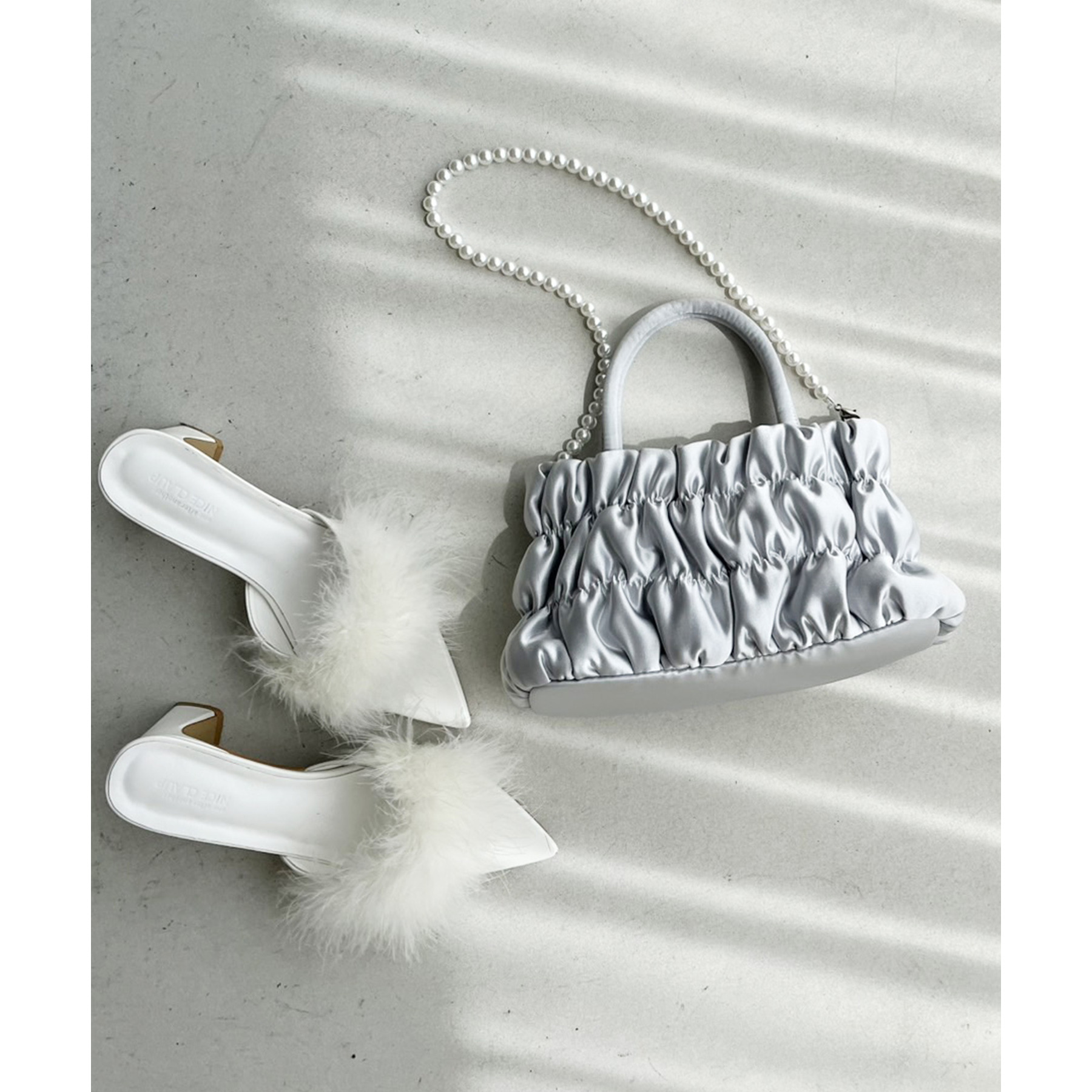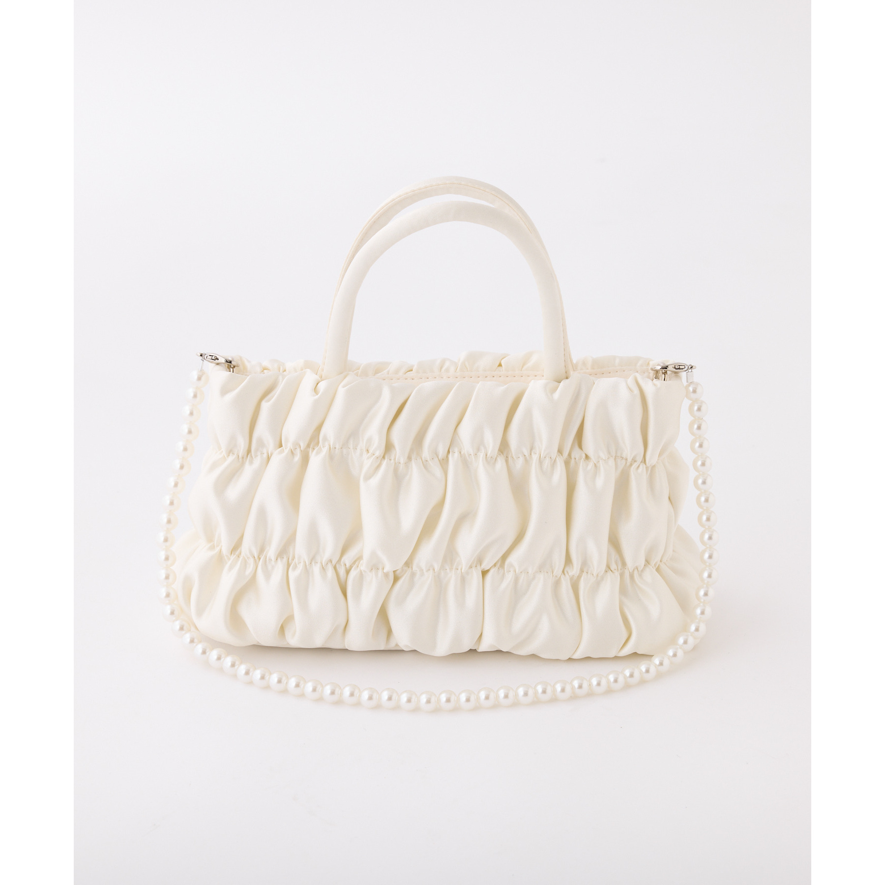 柔らかなシャーリングデザインに、華やかなパールショルダーがアクセントのバッグ