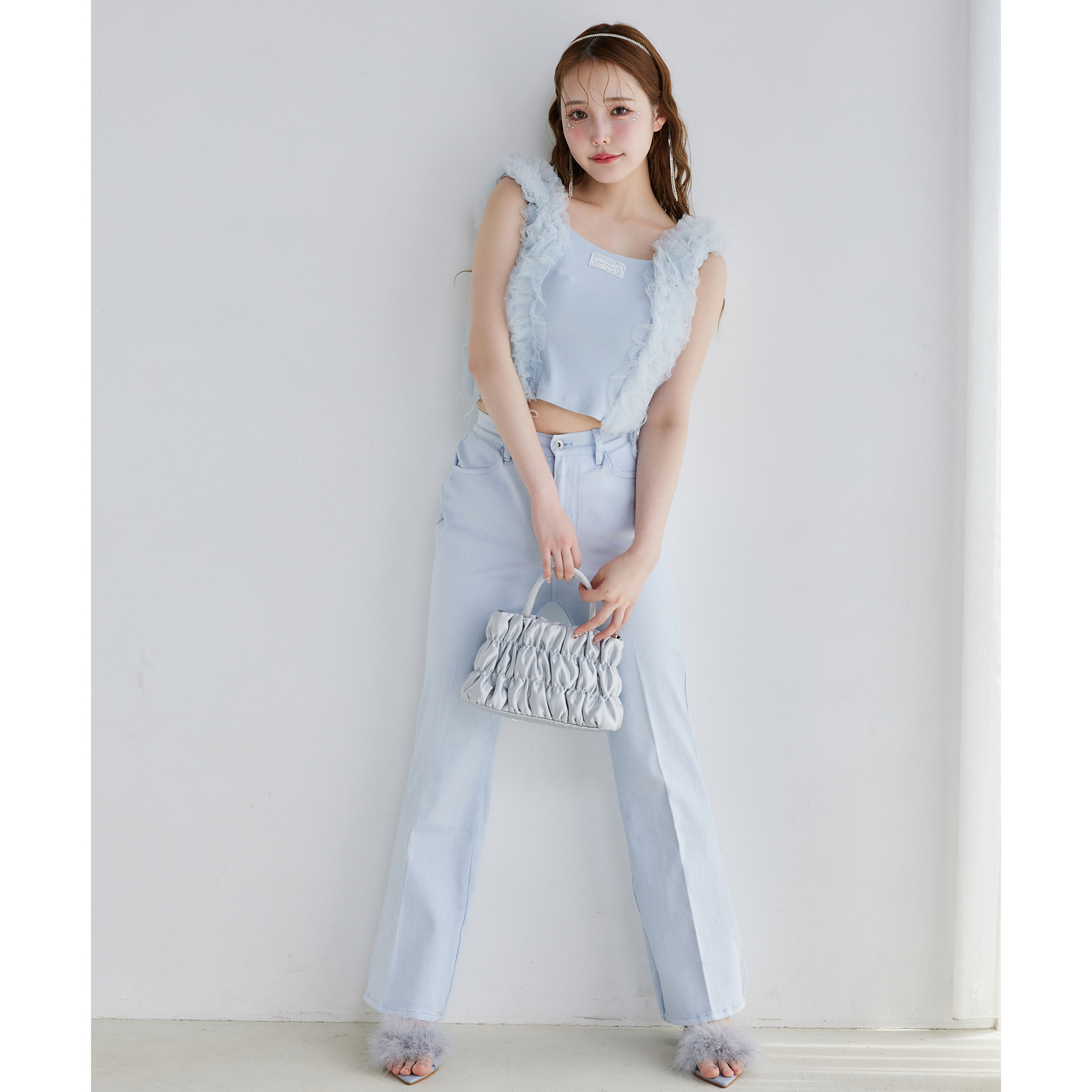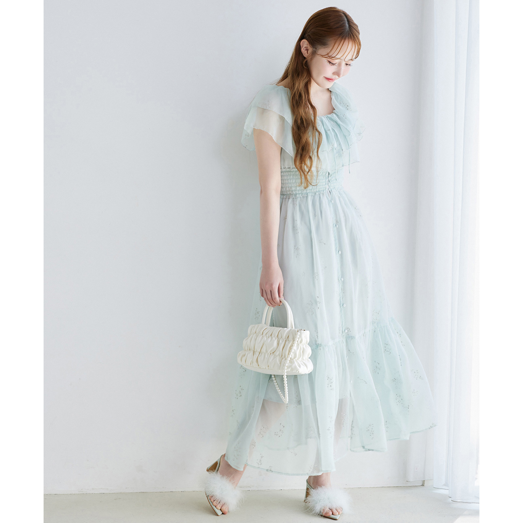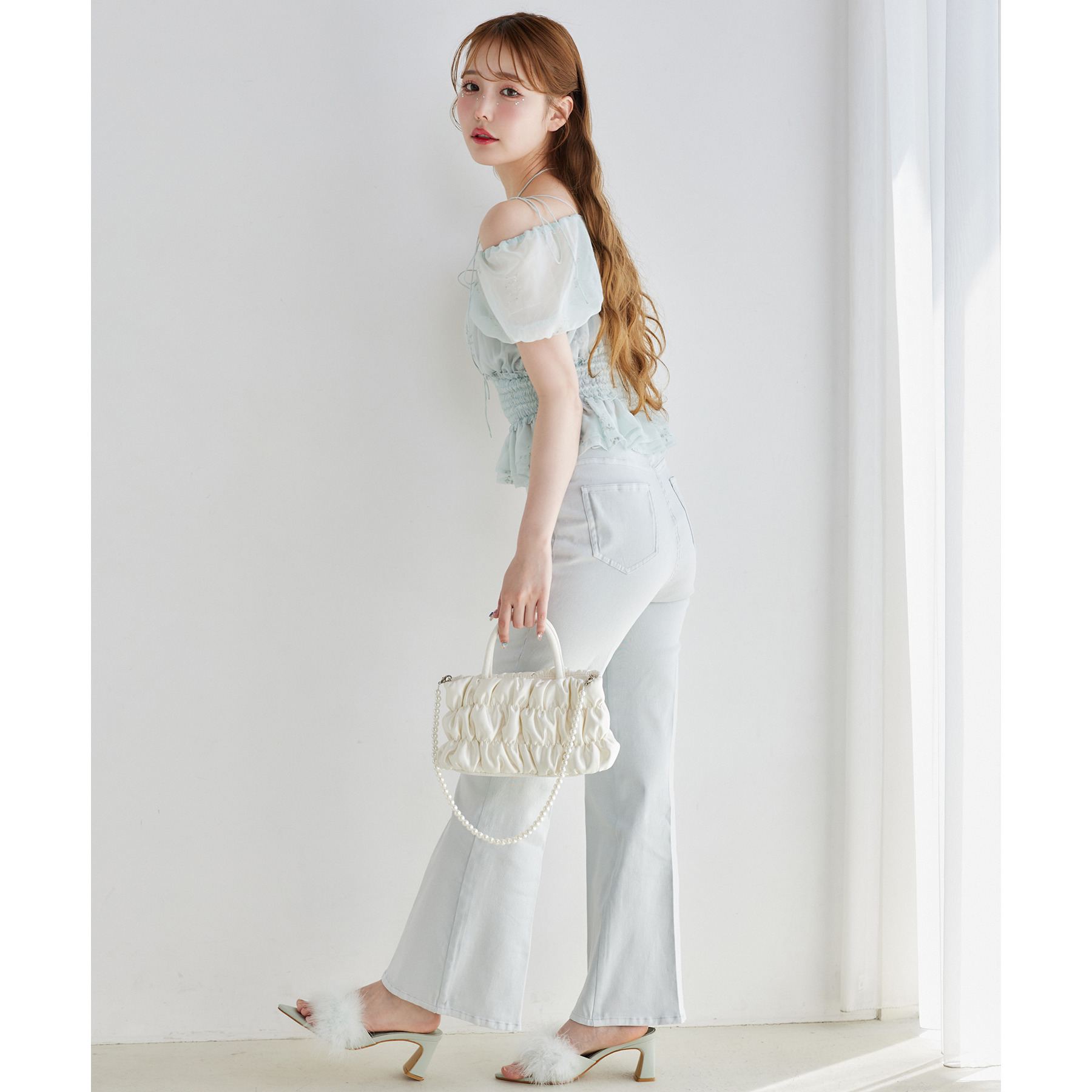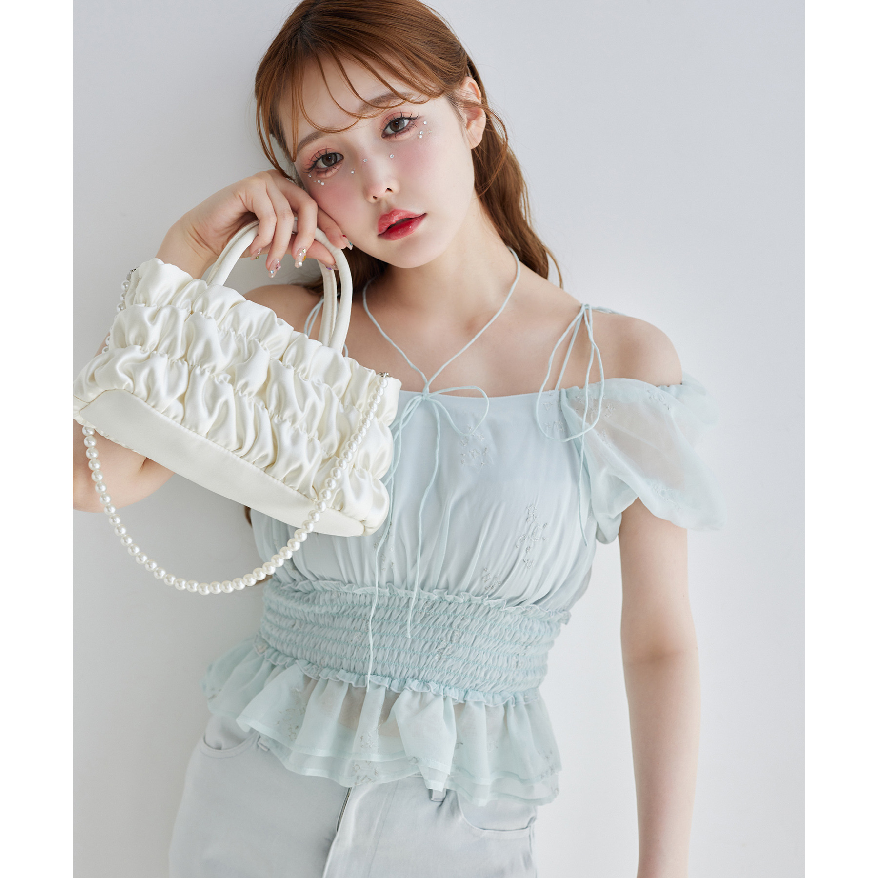 柔らかなシャーリングデザインに、華やかなパールショルダーがアクセントのバッグ