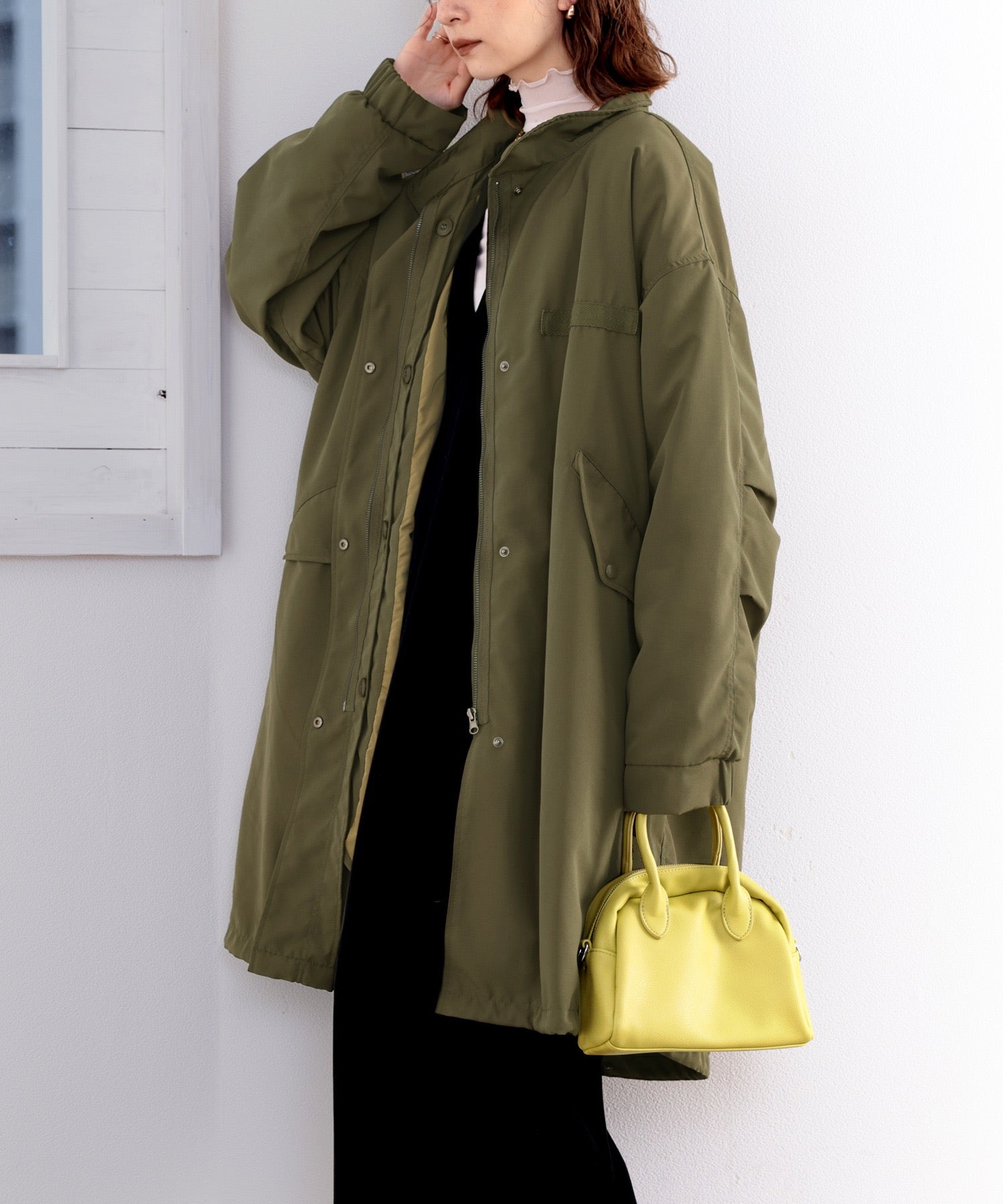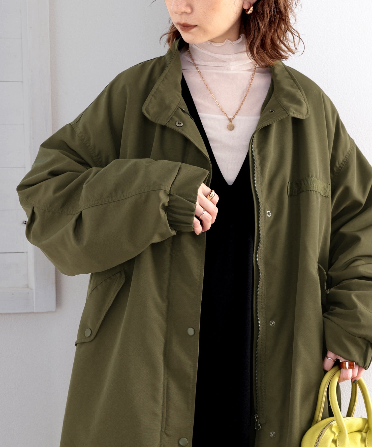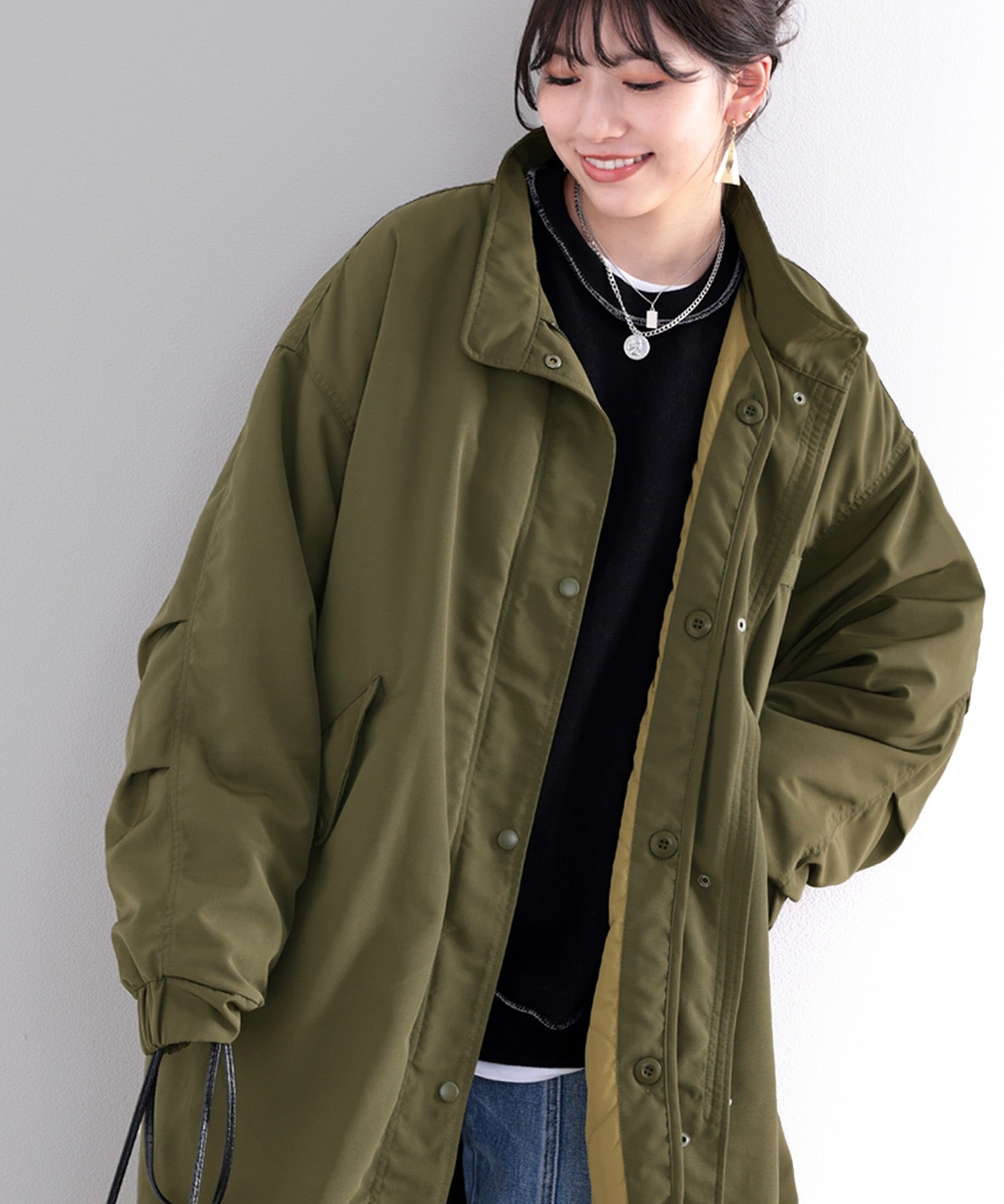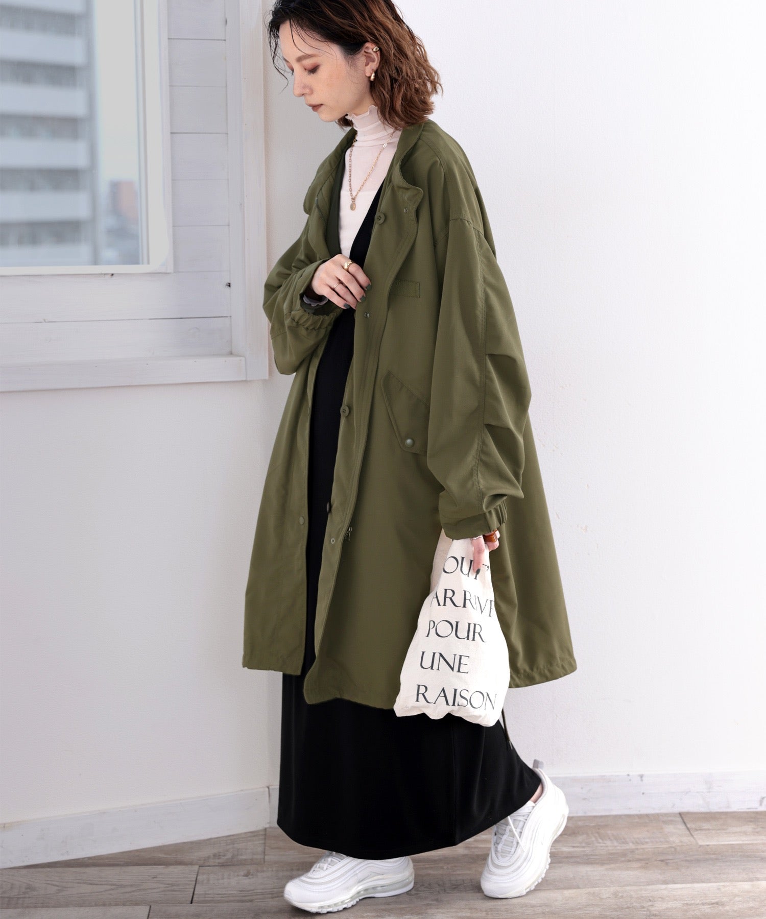 ミリタリーっぽさもありながら、女性らしい着こなしができる1着。