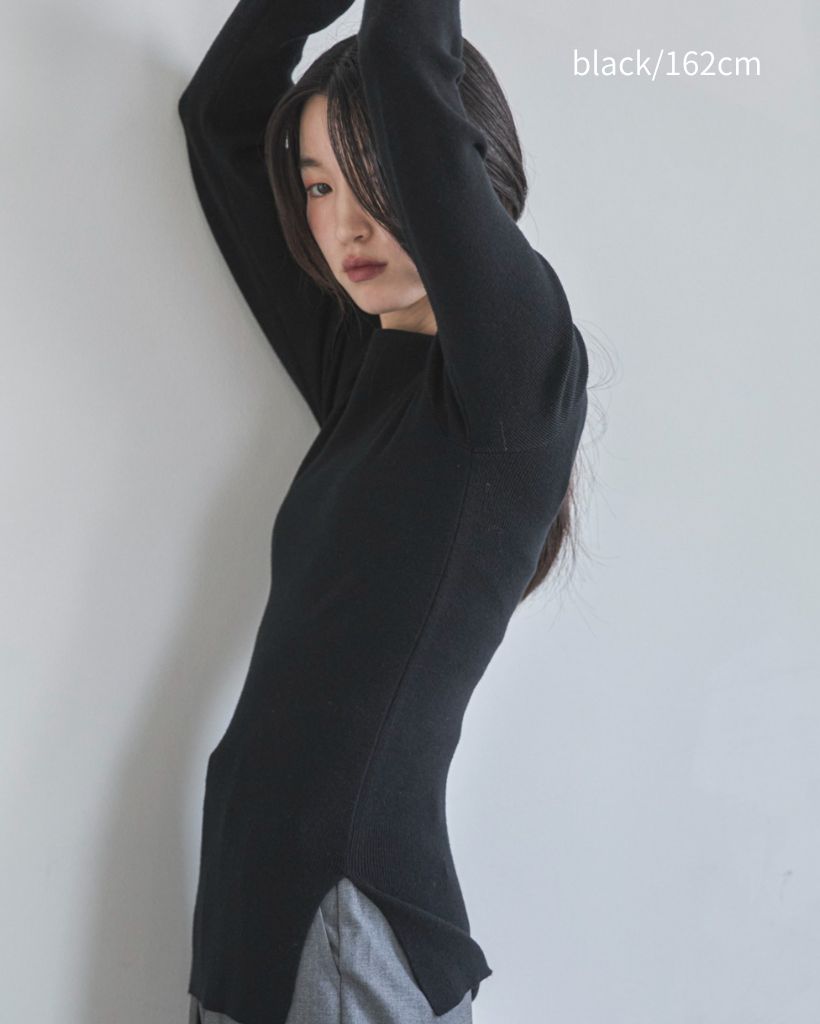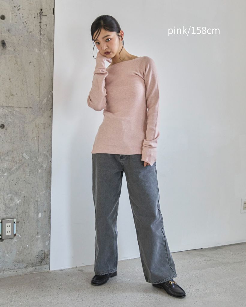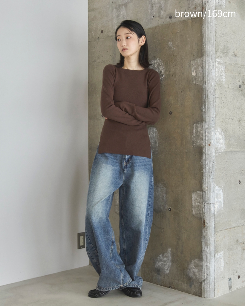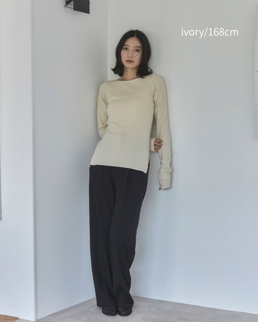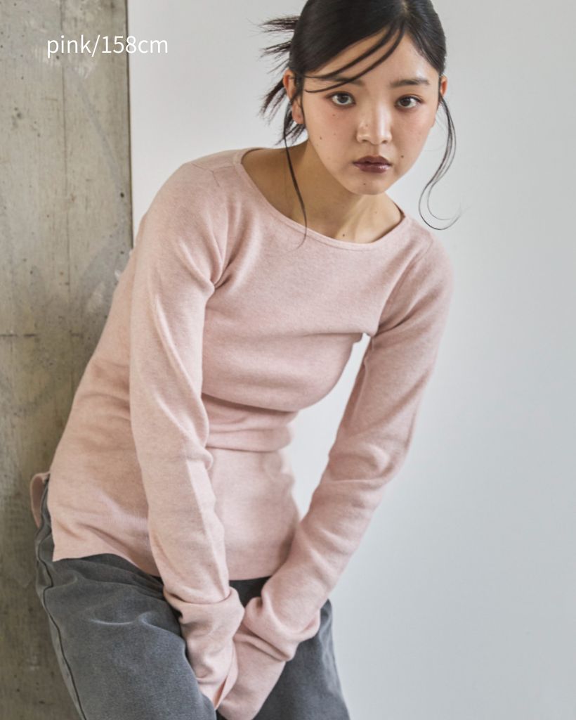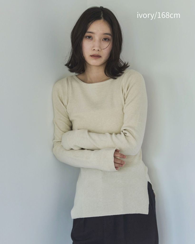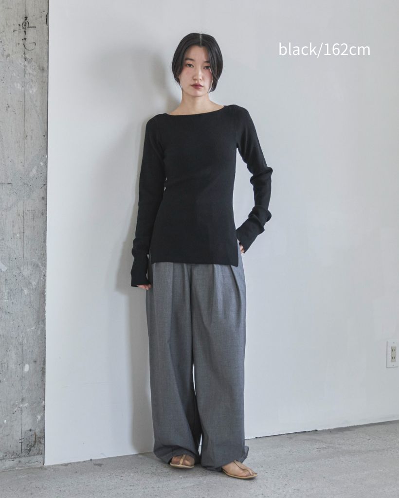 横に広めに開いた大人っぽいボートネックディティールで身幅もすっきりとしているため一枚着としてはもちろんレイヤードアイテムとしても活躍します。