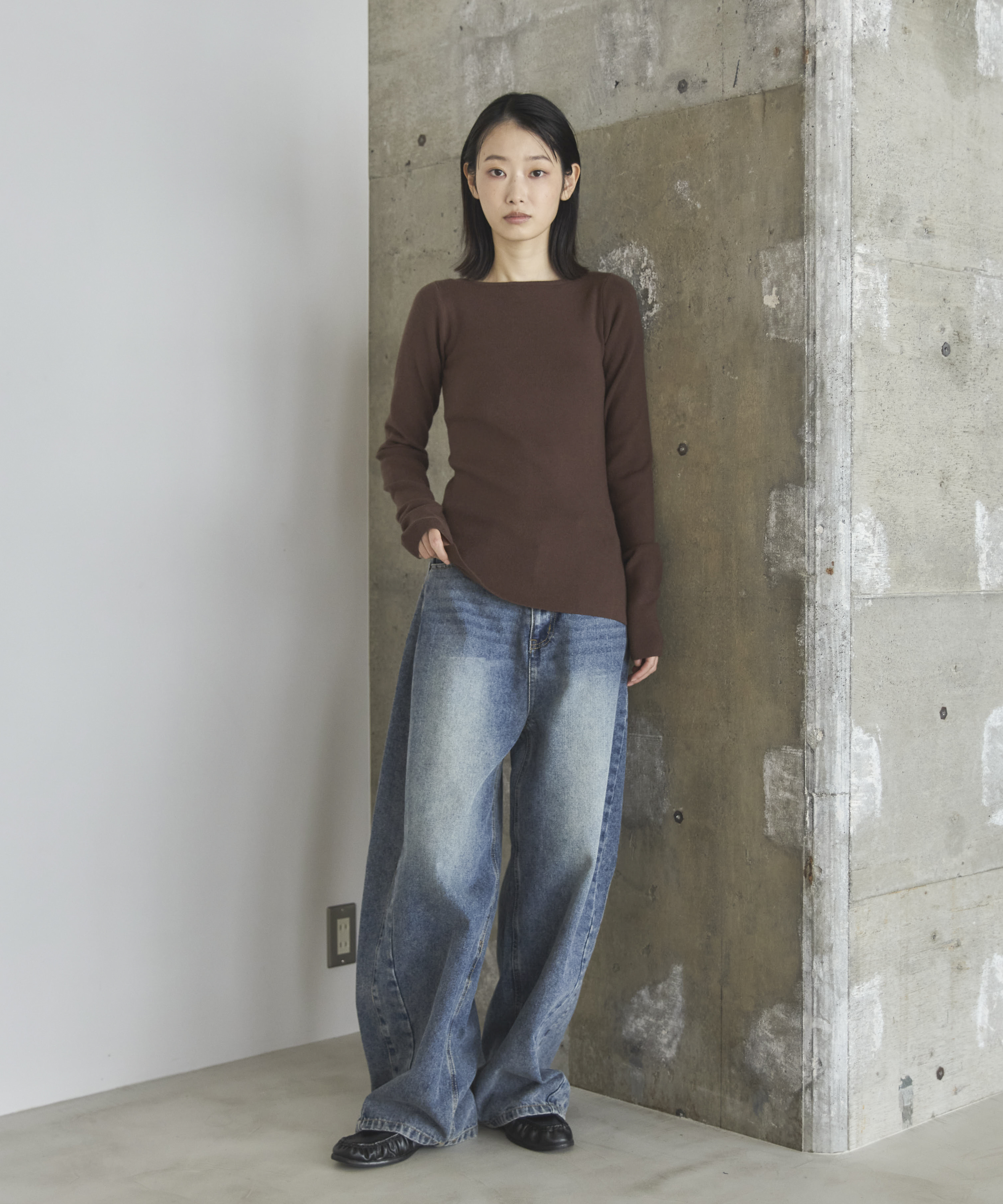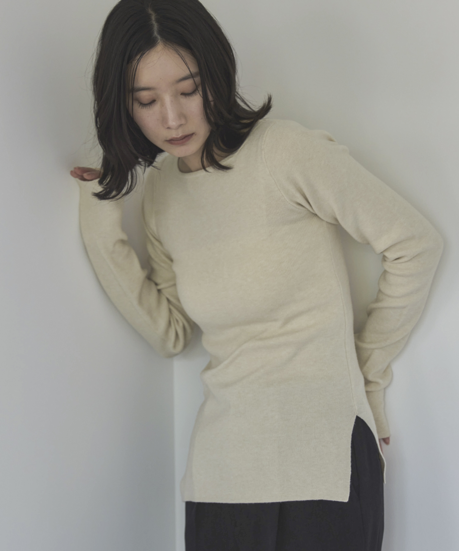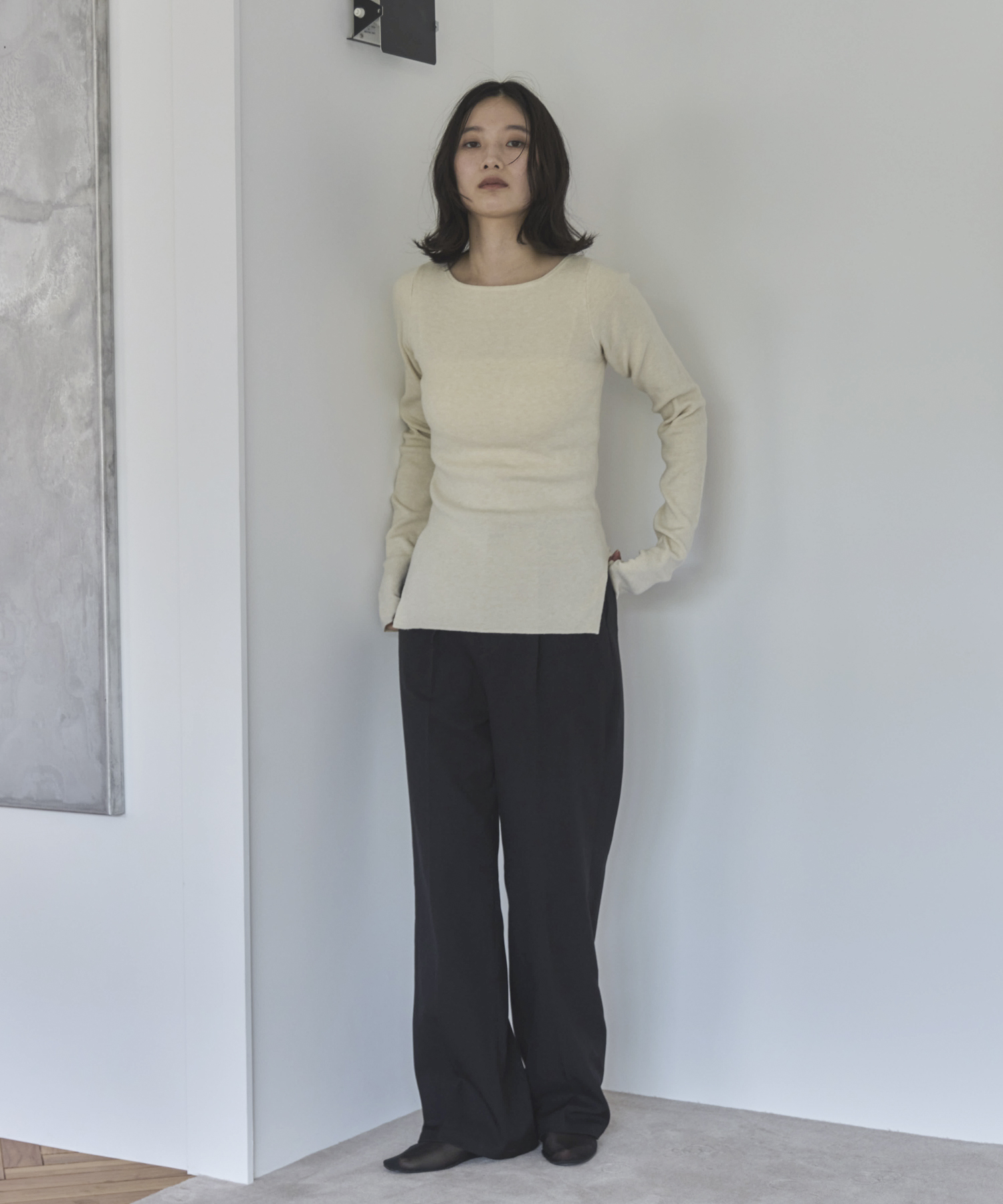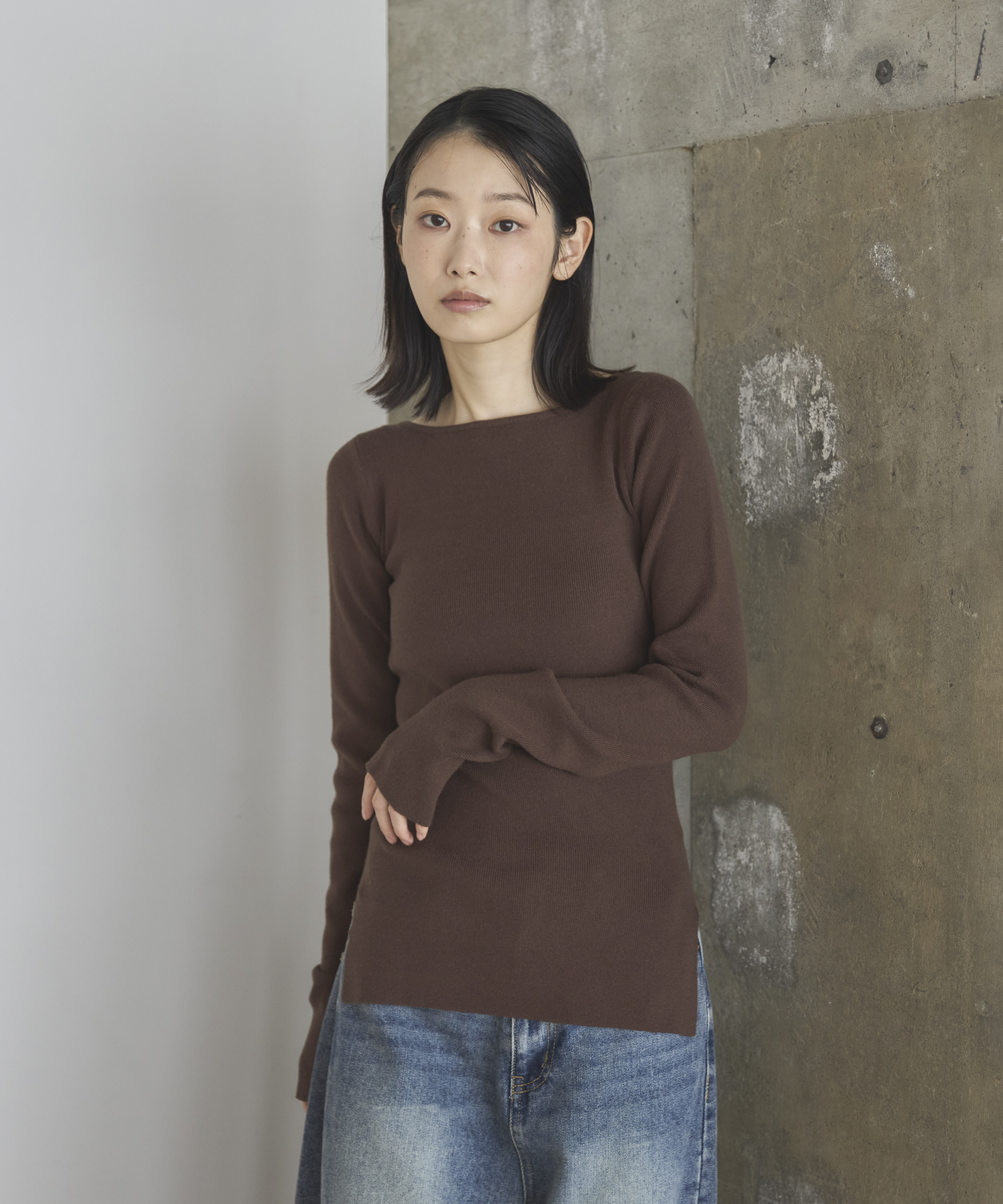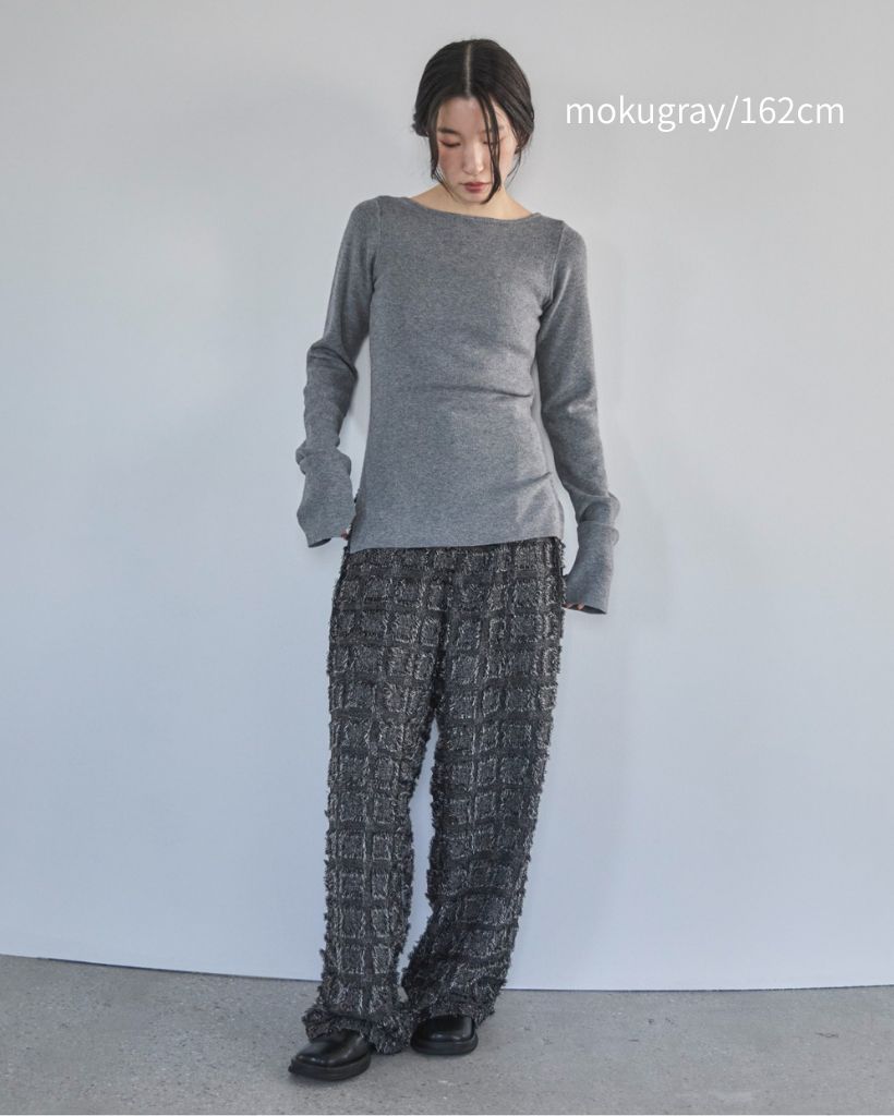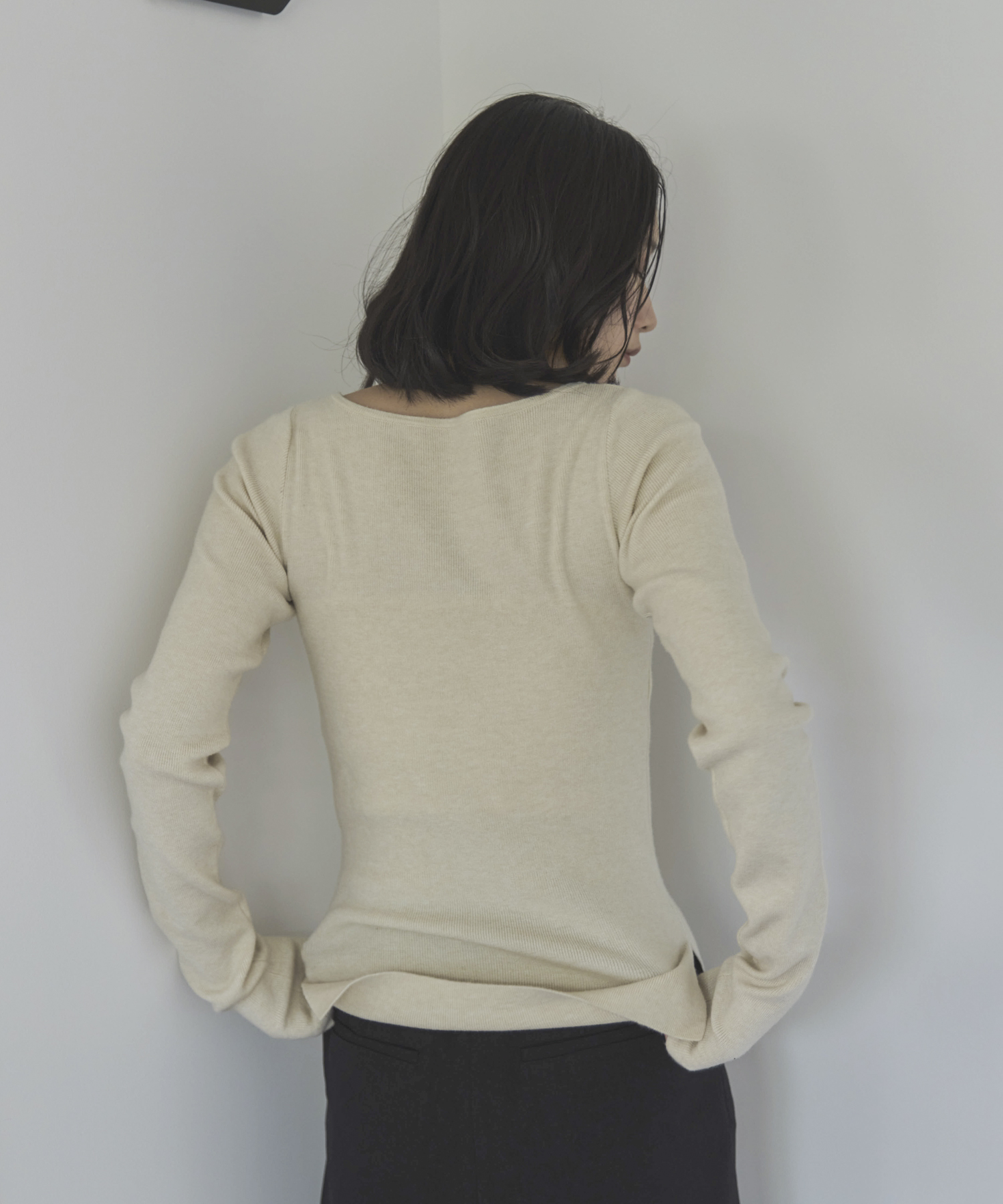 横に広めに開いた大人っぽいボートネックディティールで身幅もすっきりとしているため一枚着としてはもちろんレイヤードアイテムとしても活躍します。