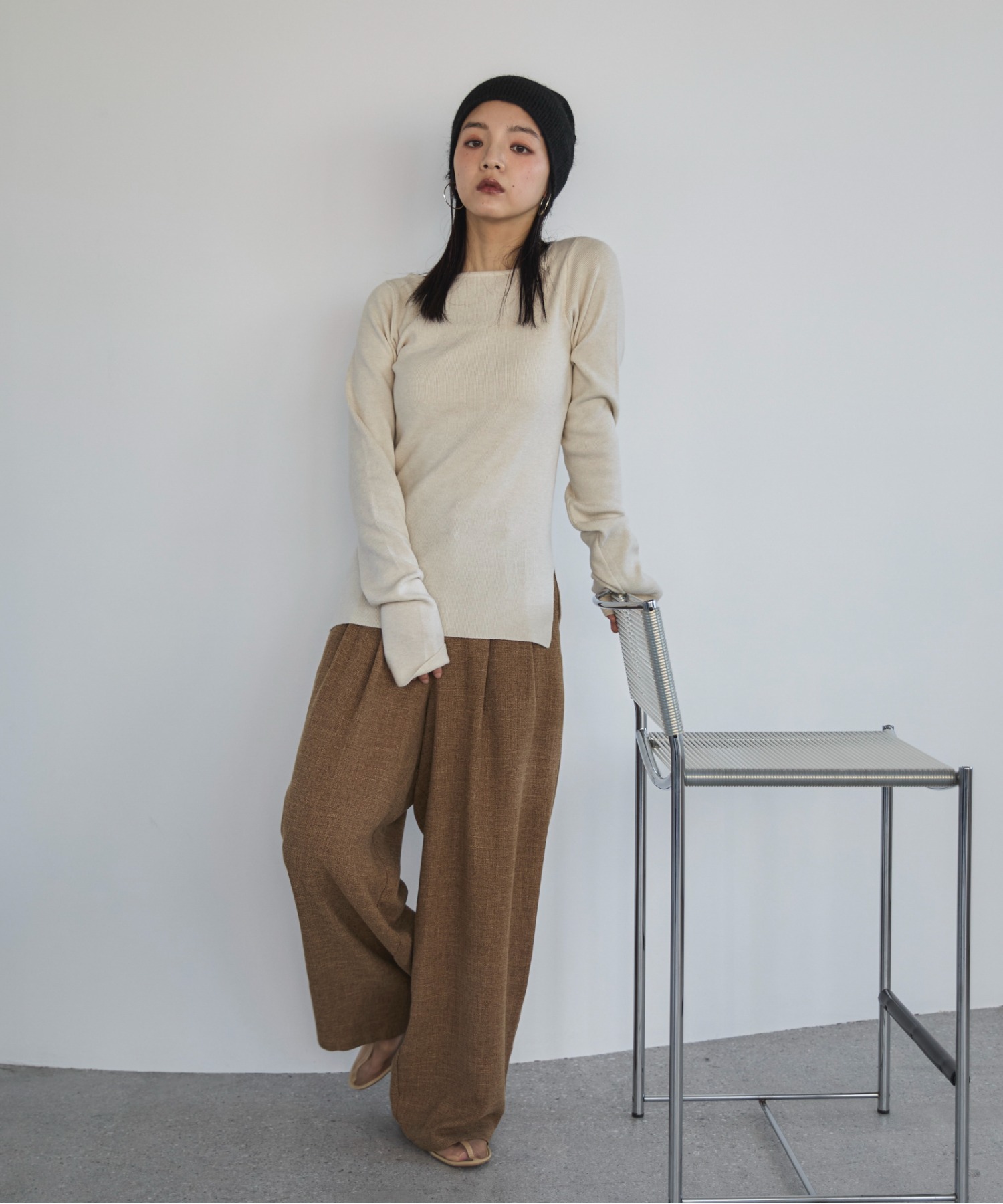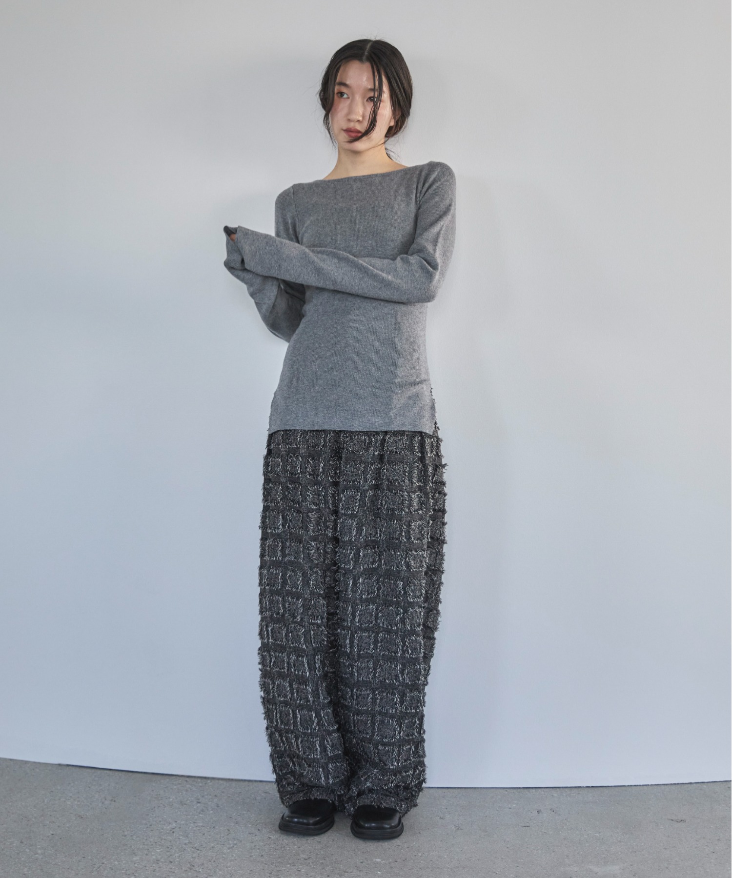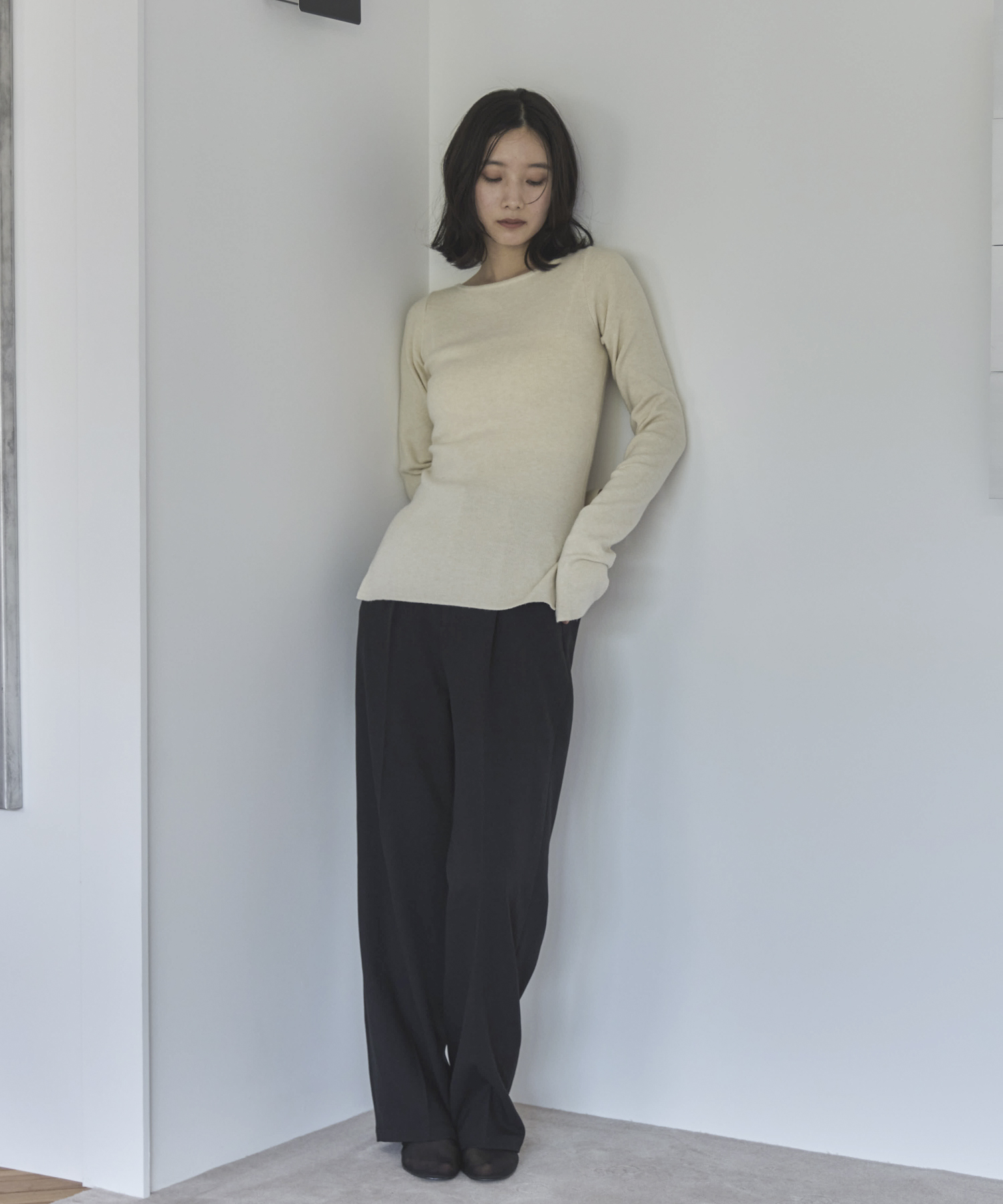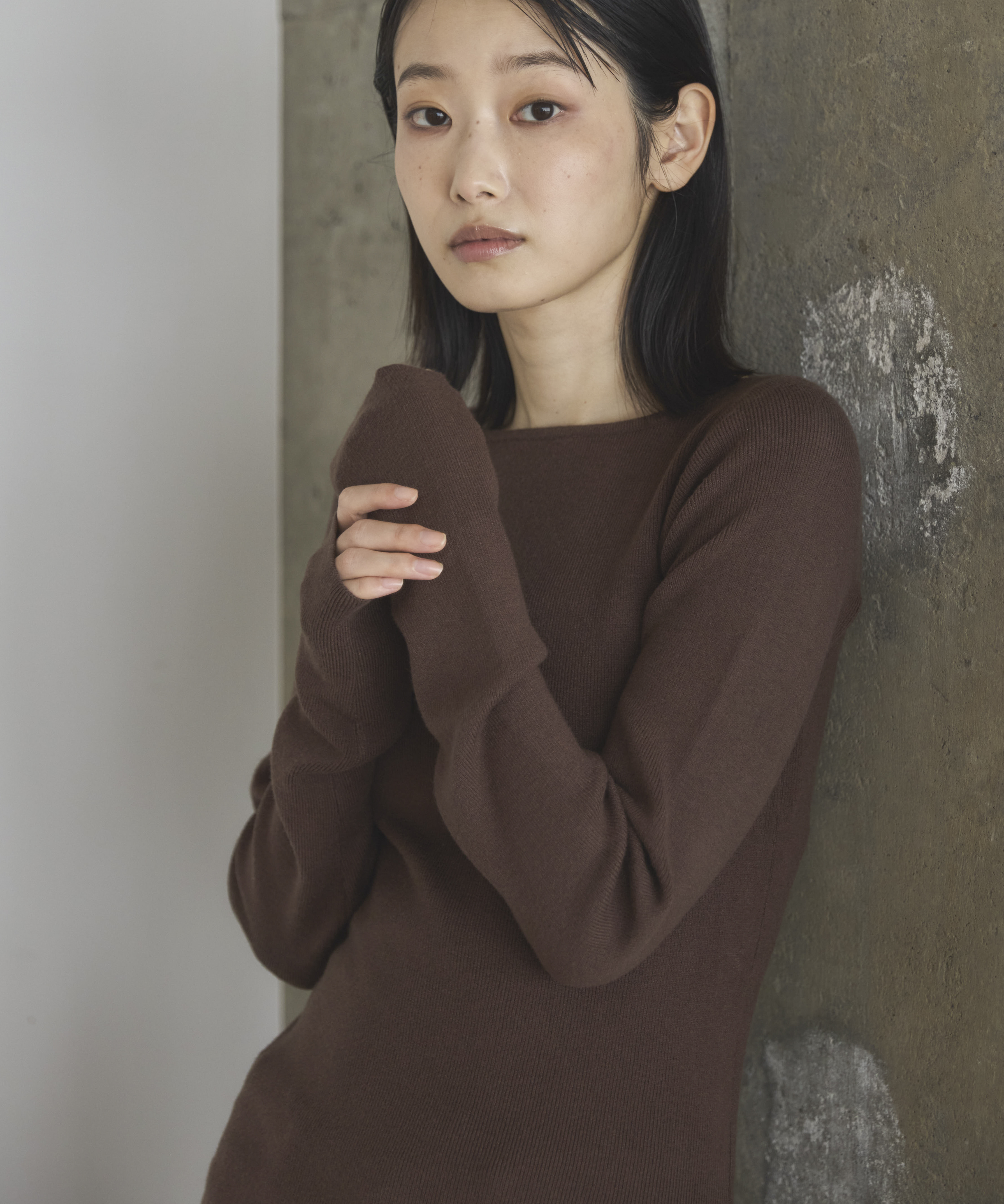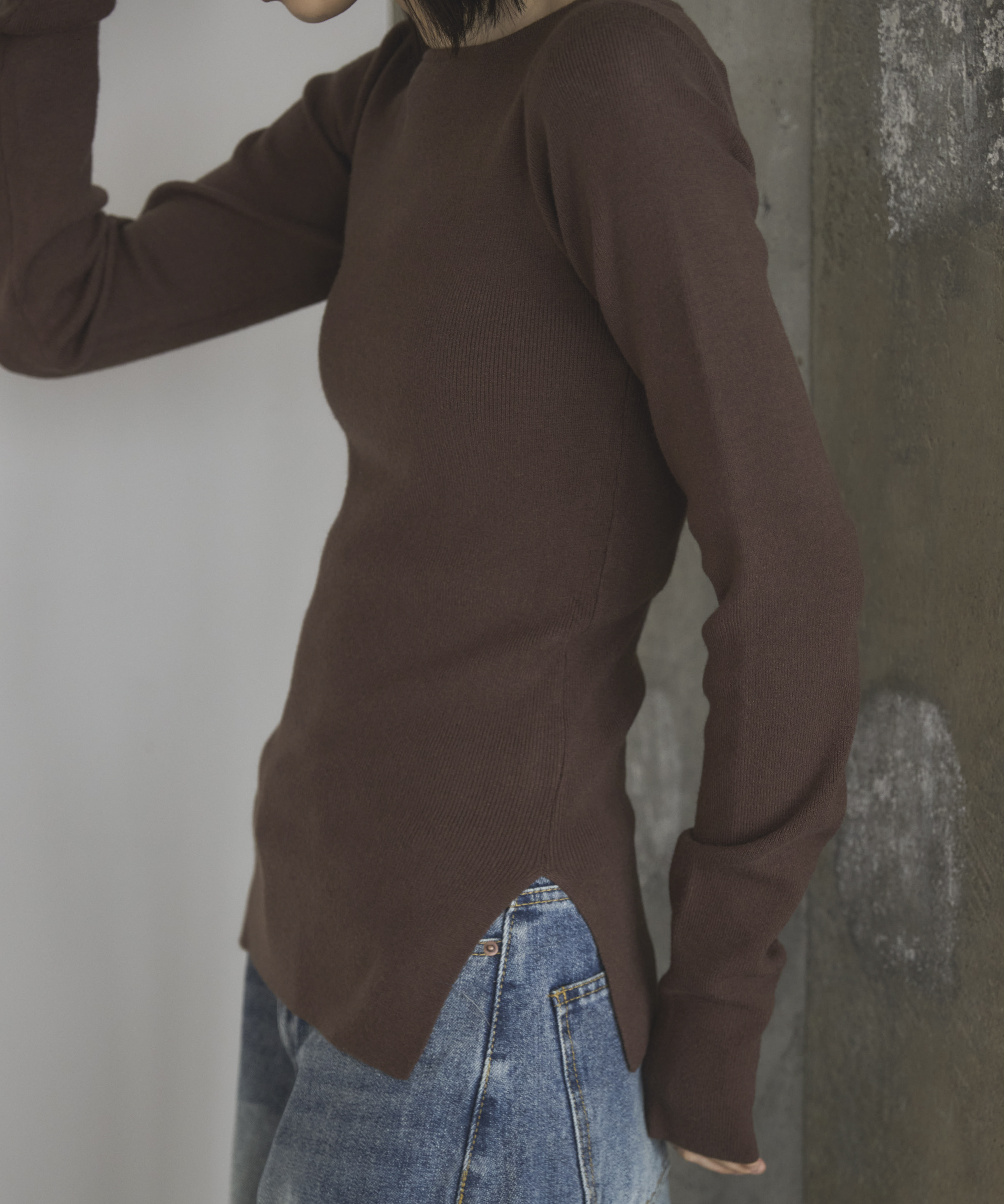横に広めに開いた大人っぽいボートネックディティールで身幅もすっきりとしているため一枚着としてはもちろんレイヤードアイテムとしても活躍します。