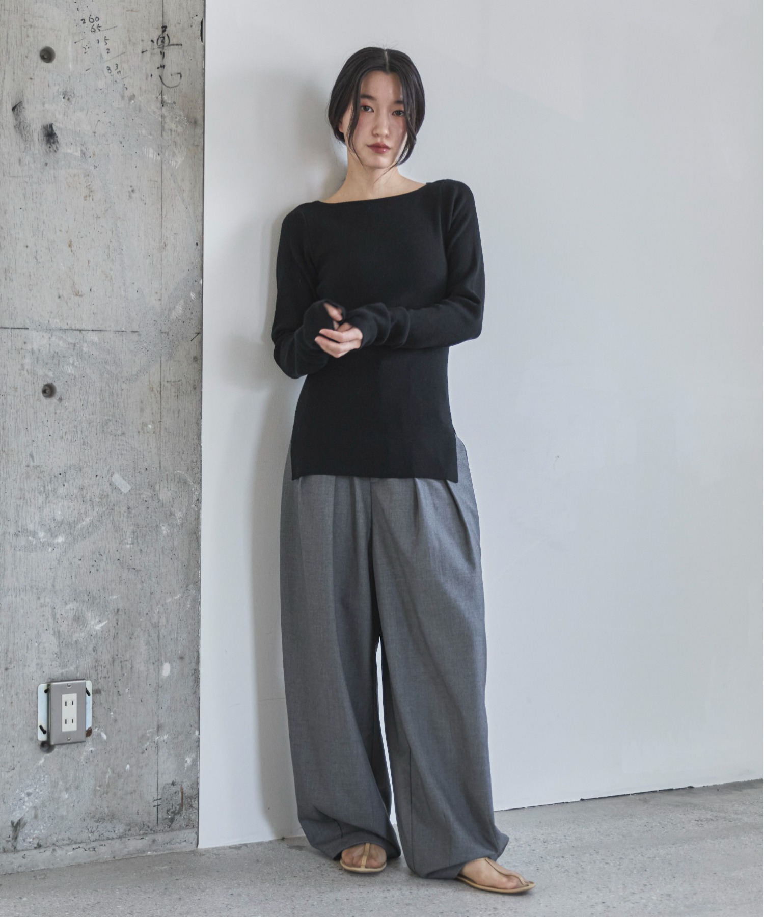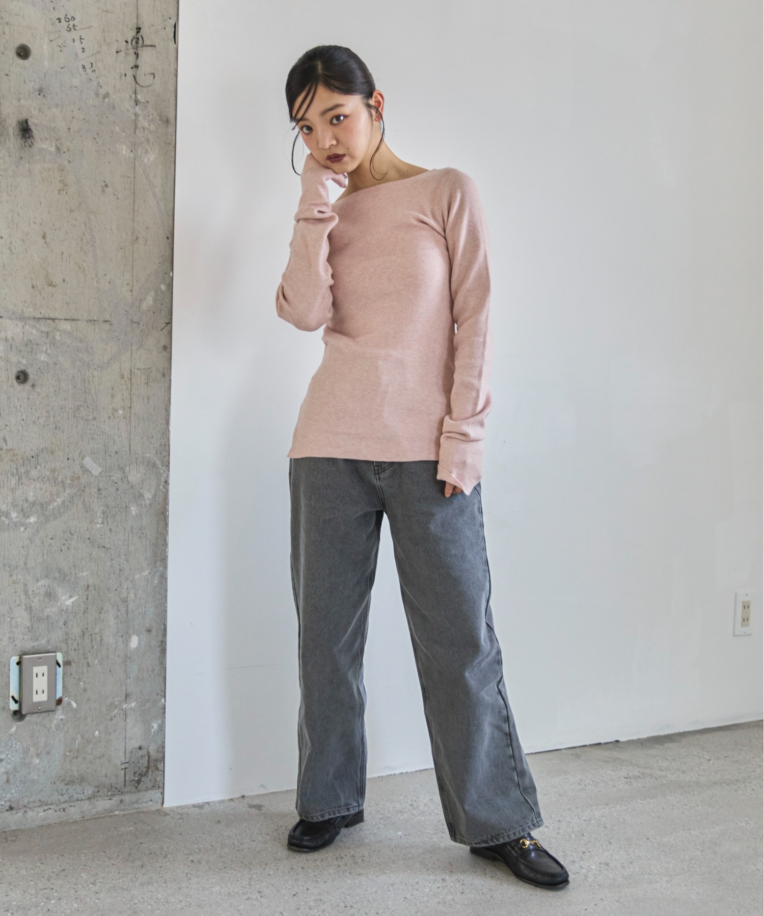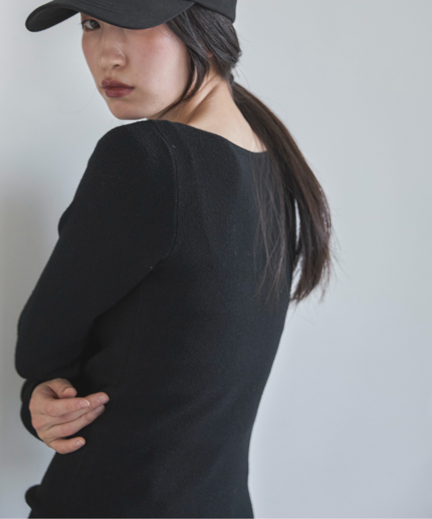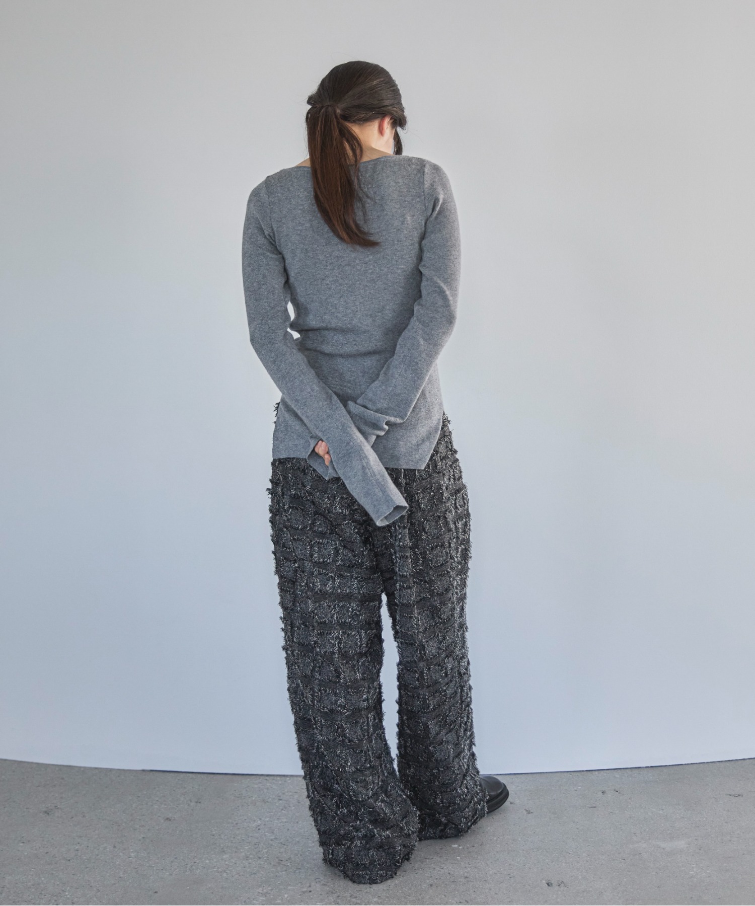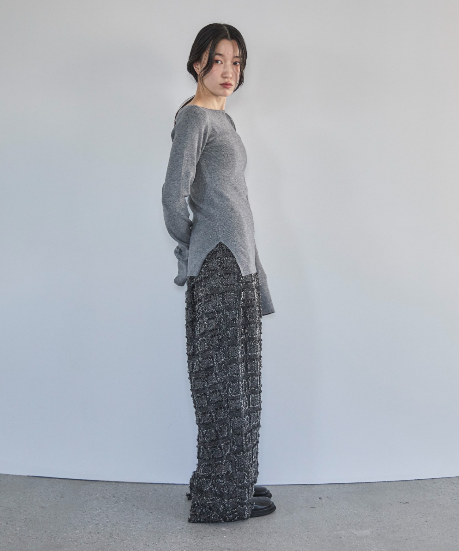 横に広めに開いた大人っぽいボートネックディティールで身幅もすっきりとしているため一枚着としてはもちろんレイヤードアイテムとしても活躍します。