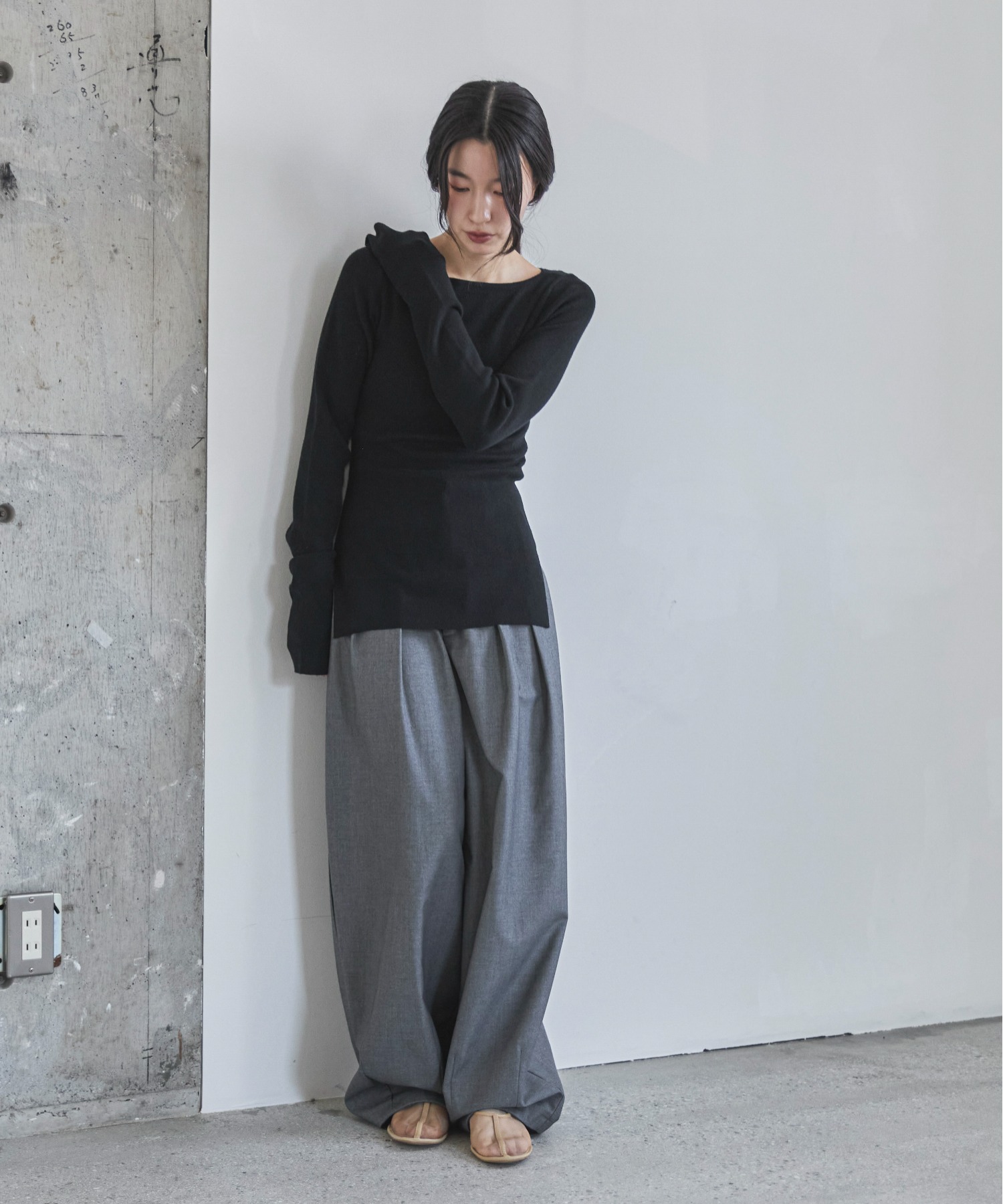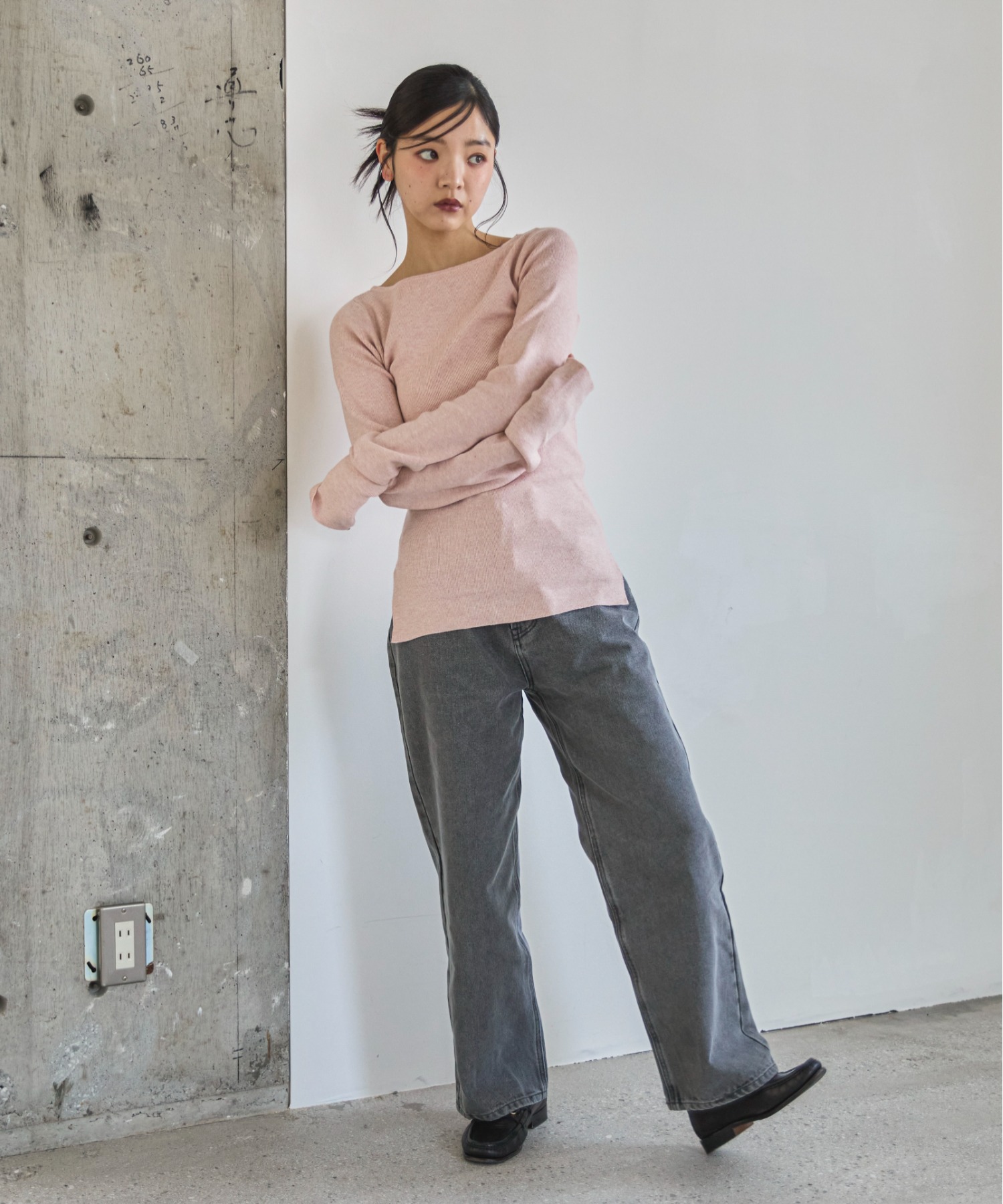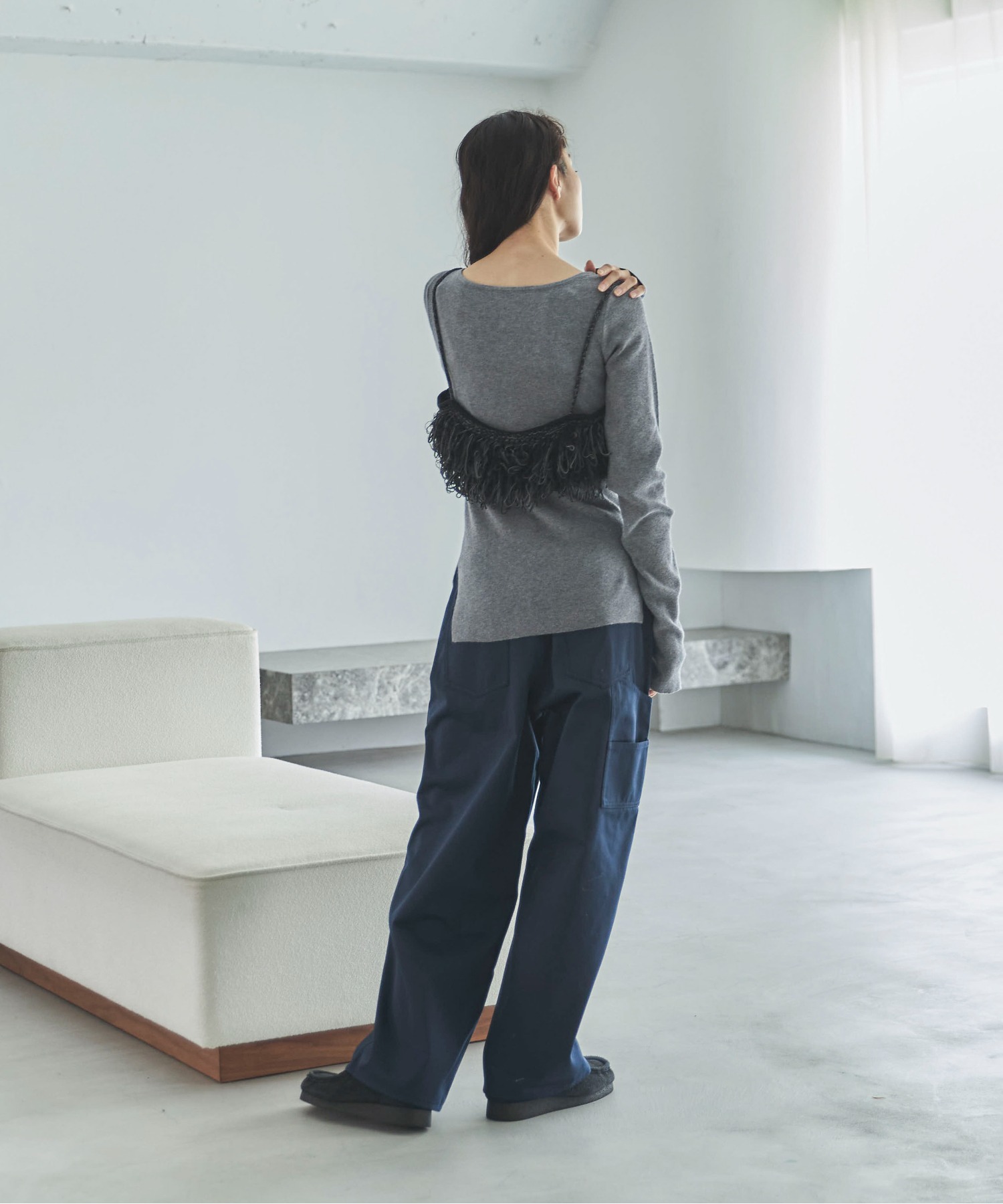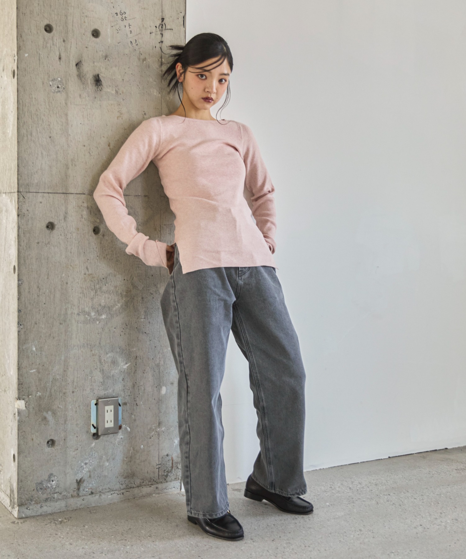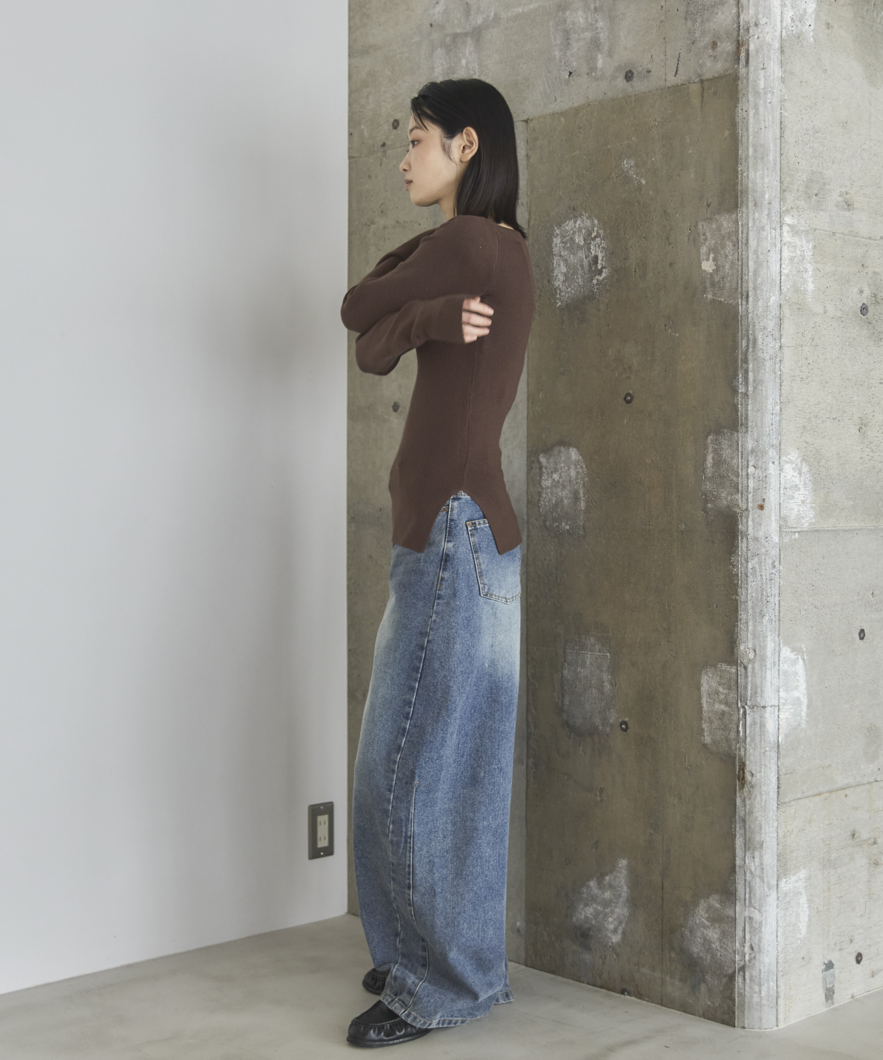 横に広めに開いた大人っぽいボートネックディティールで身幅もすっきりとしているため一枚着としてはもちろんレイヤードアイテムとしても活躍します。