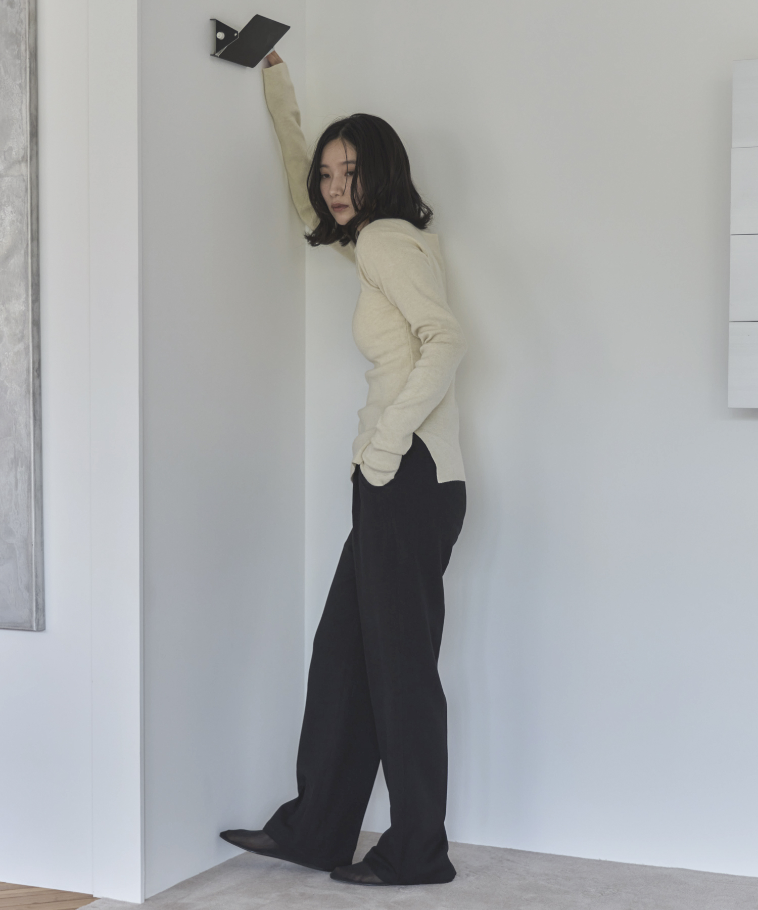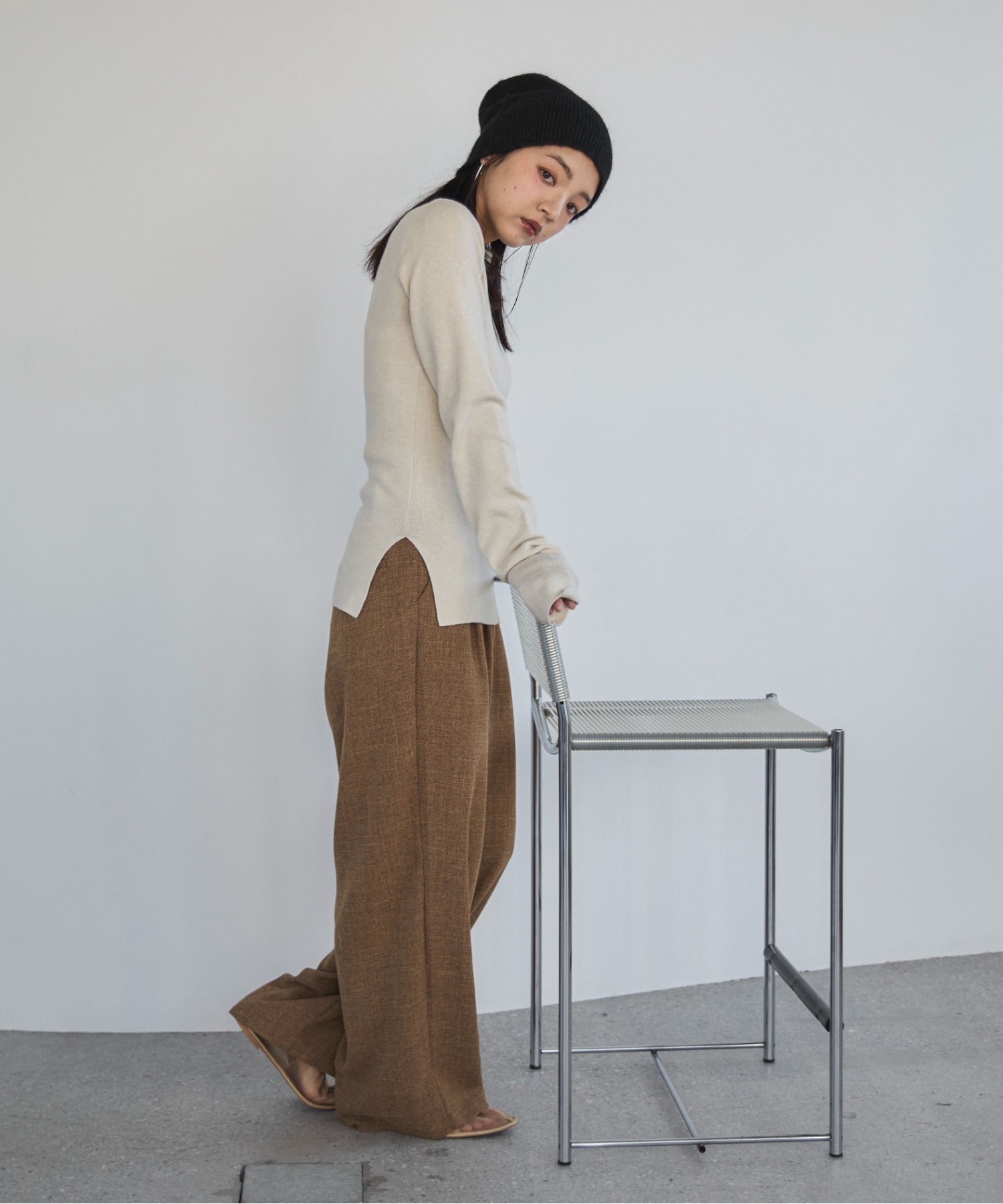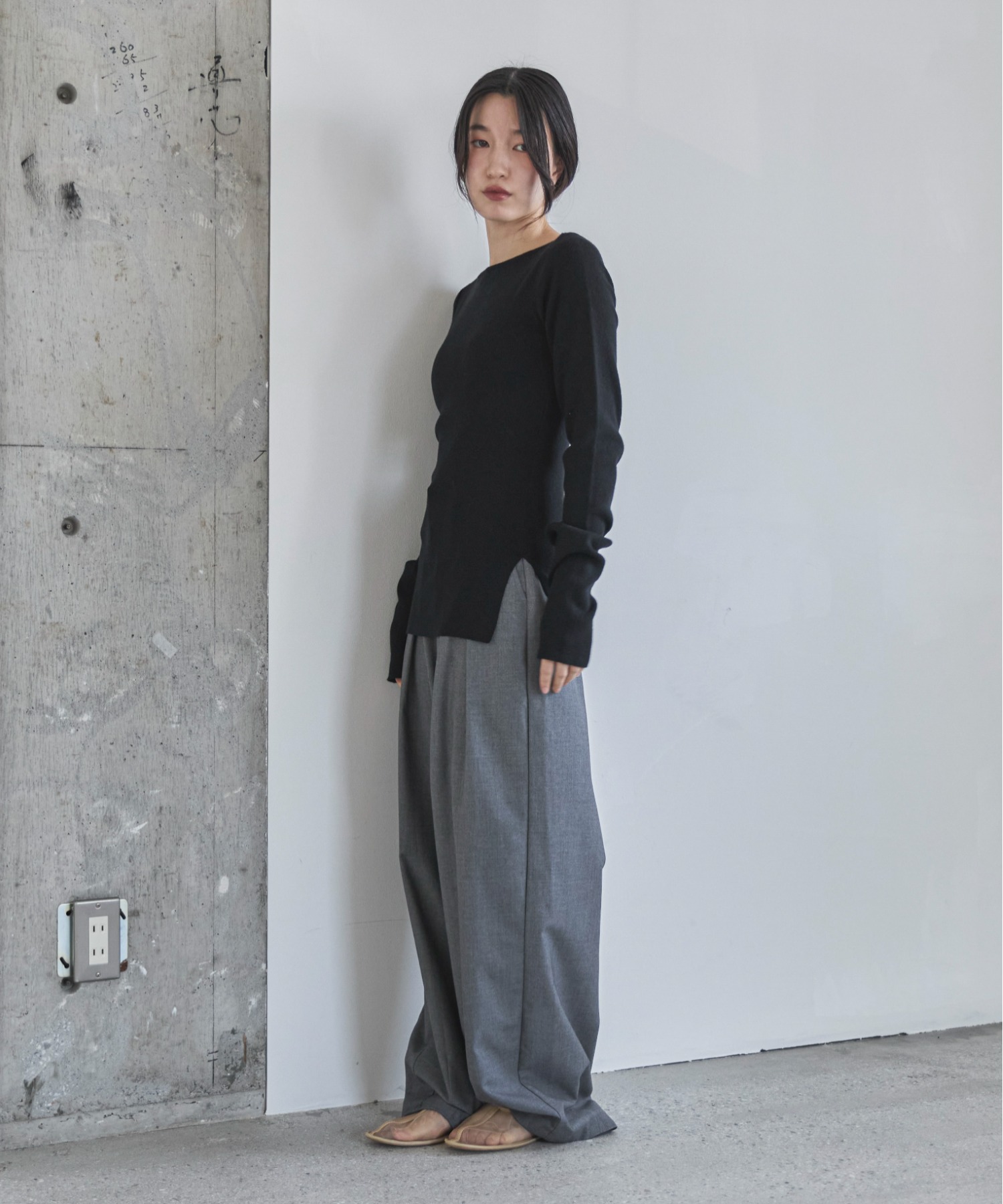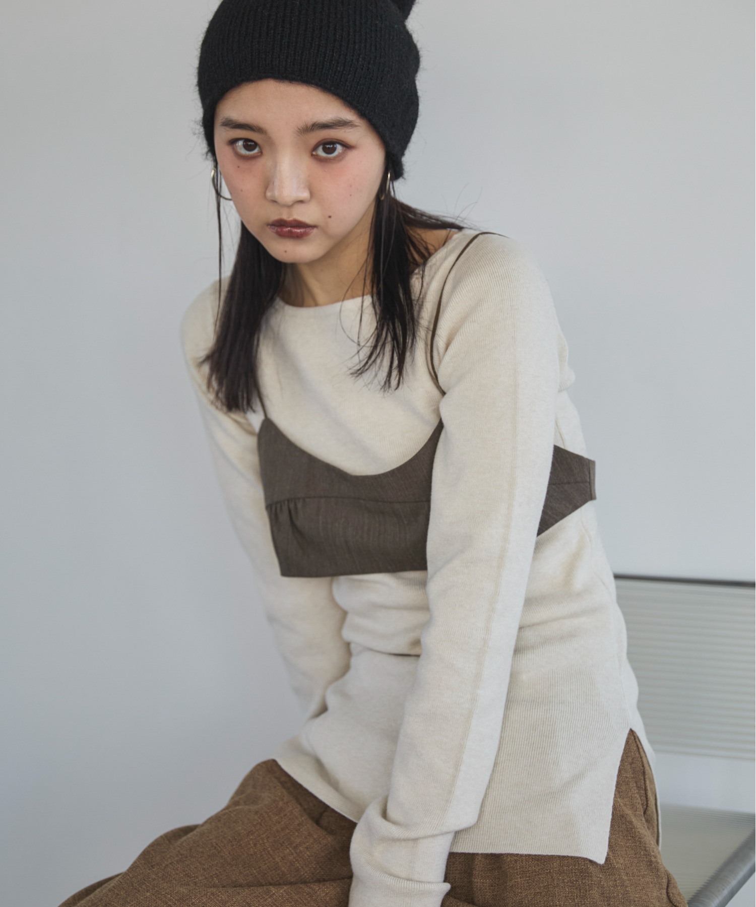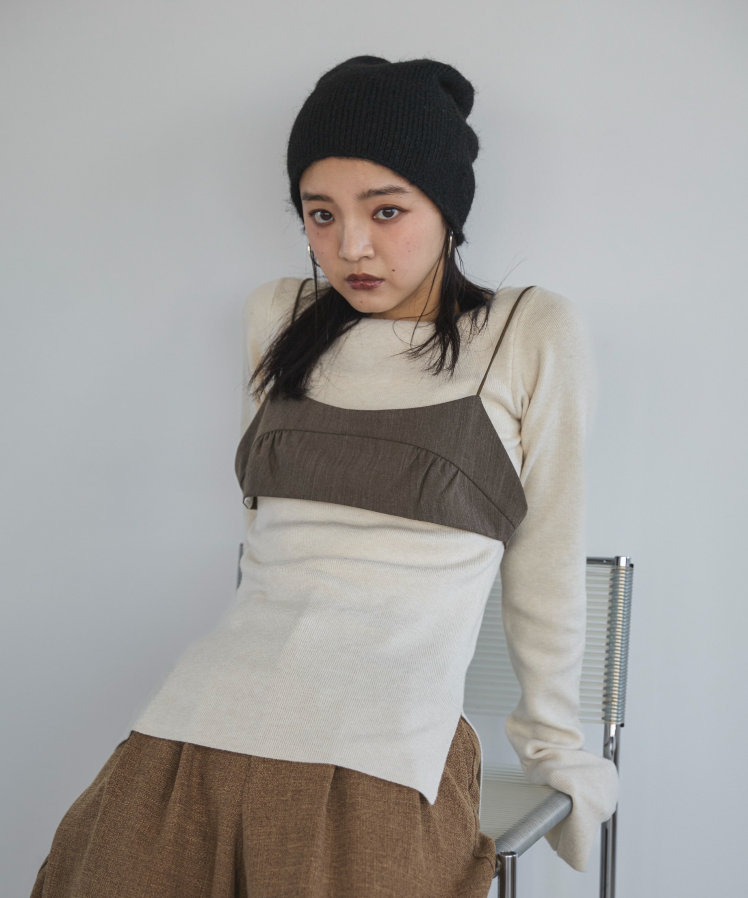 横に広めに開いた大人っぽいボートネックディティールで身幅もすっきりとしているため一枚着としてはもちろんレイヤードアイテムとしても活躍します。