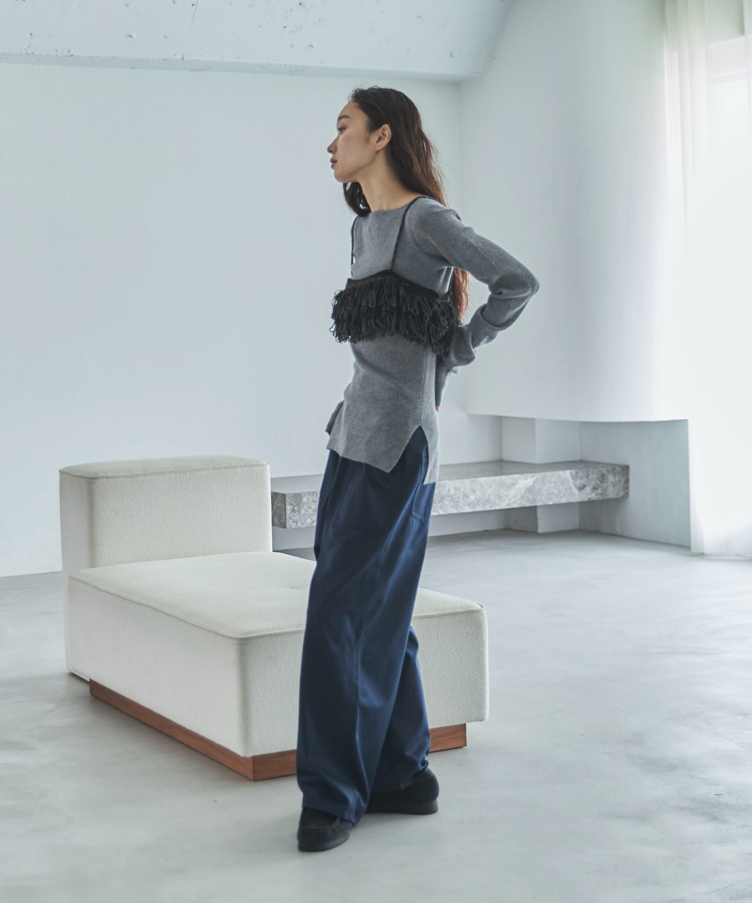 袖丈はあえてずるっと長めにとり、裾も深めのスリット入りでアウトでお召しいただくのもおすすめです。