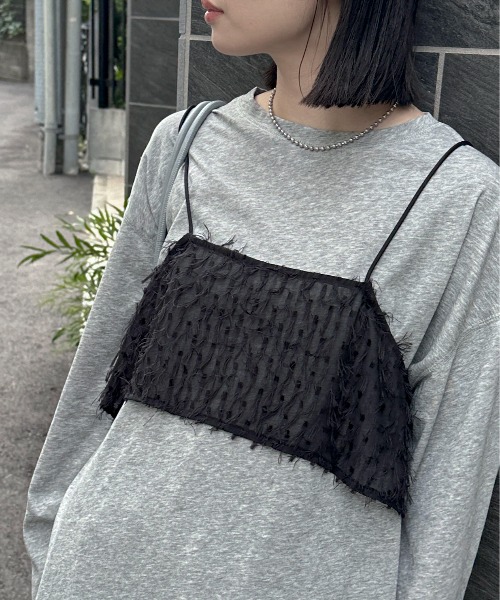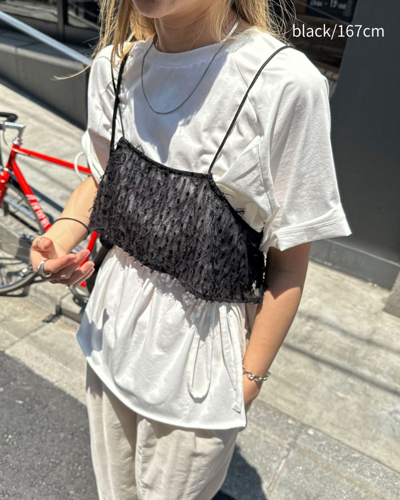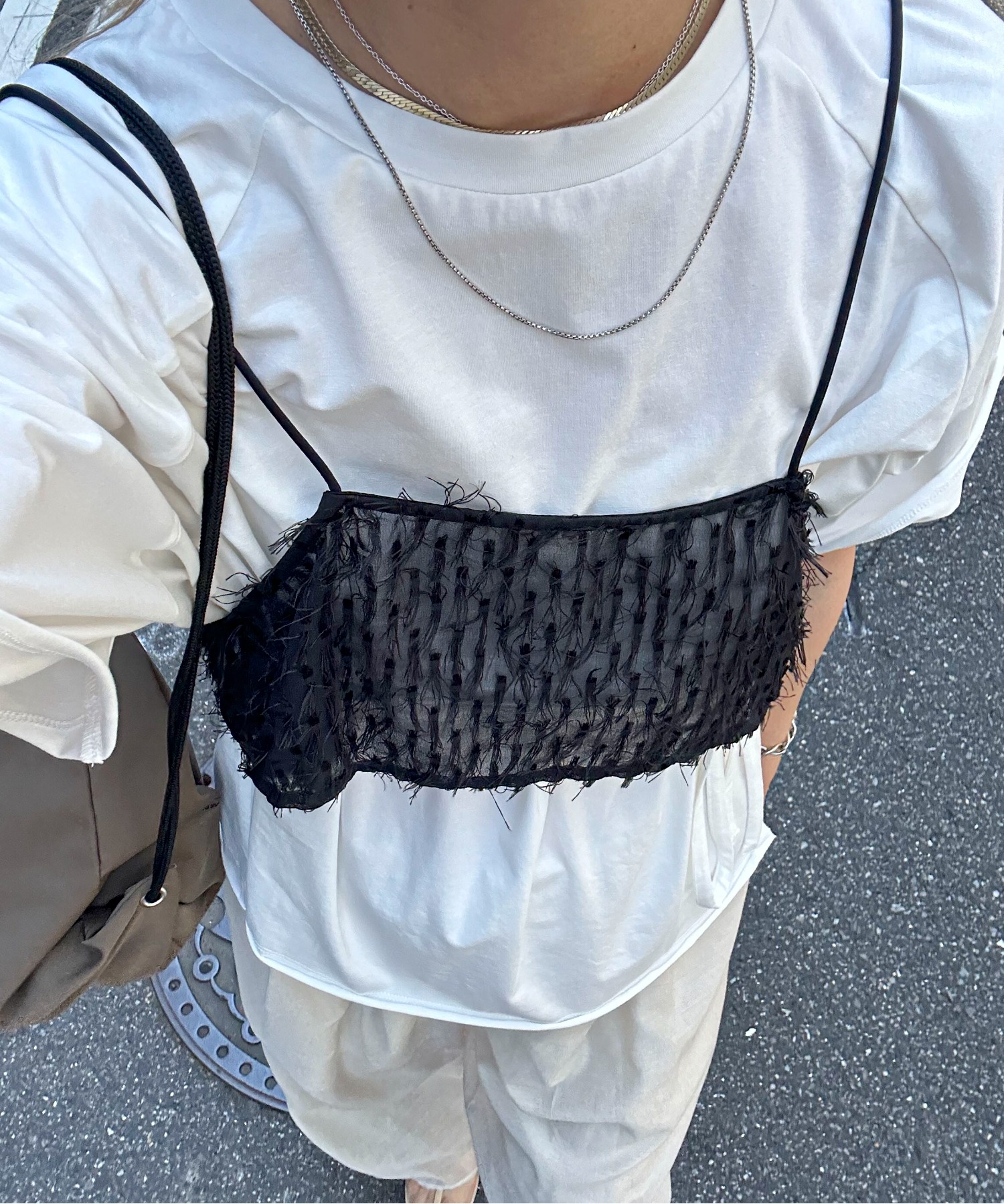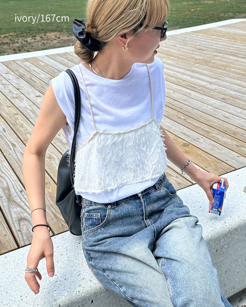 シンプルなディティールながらも特徴的な羽のようなフリンジデザインが着映えるビスチェ。