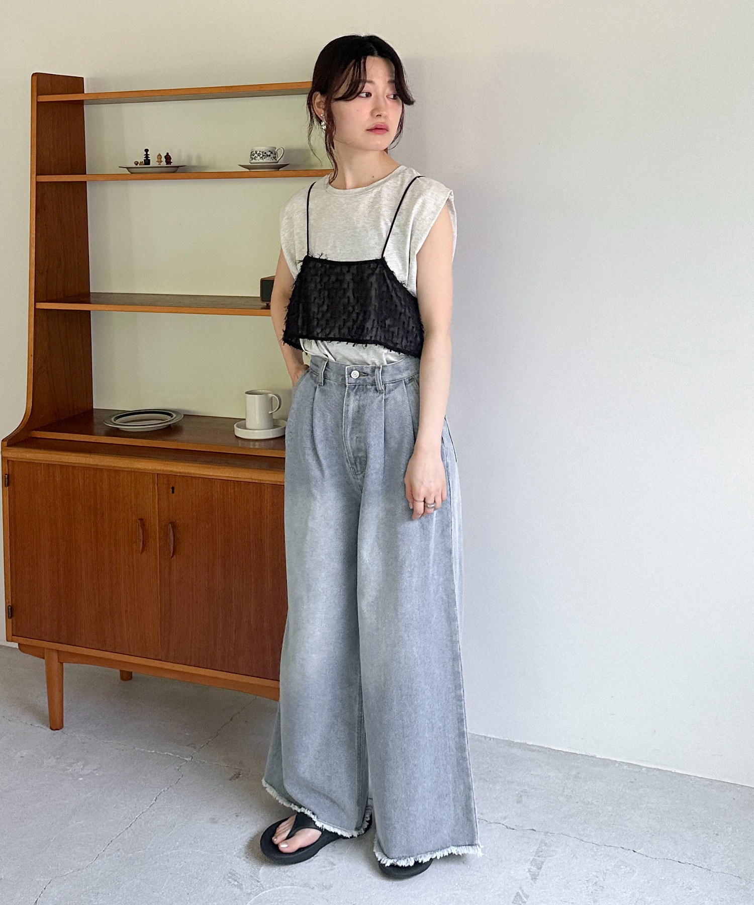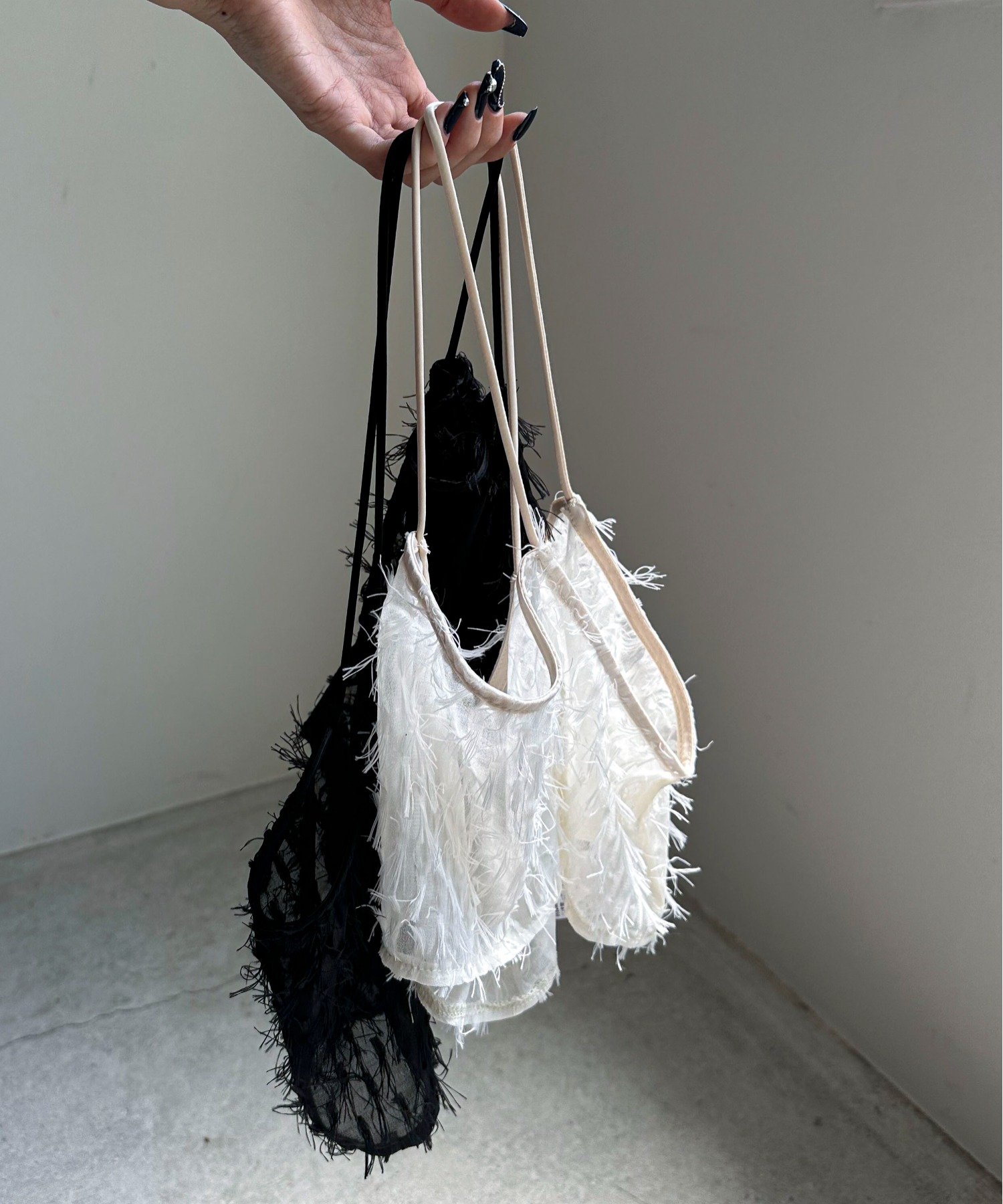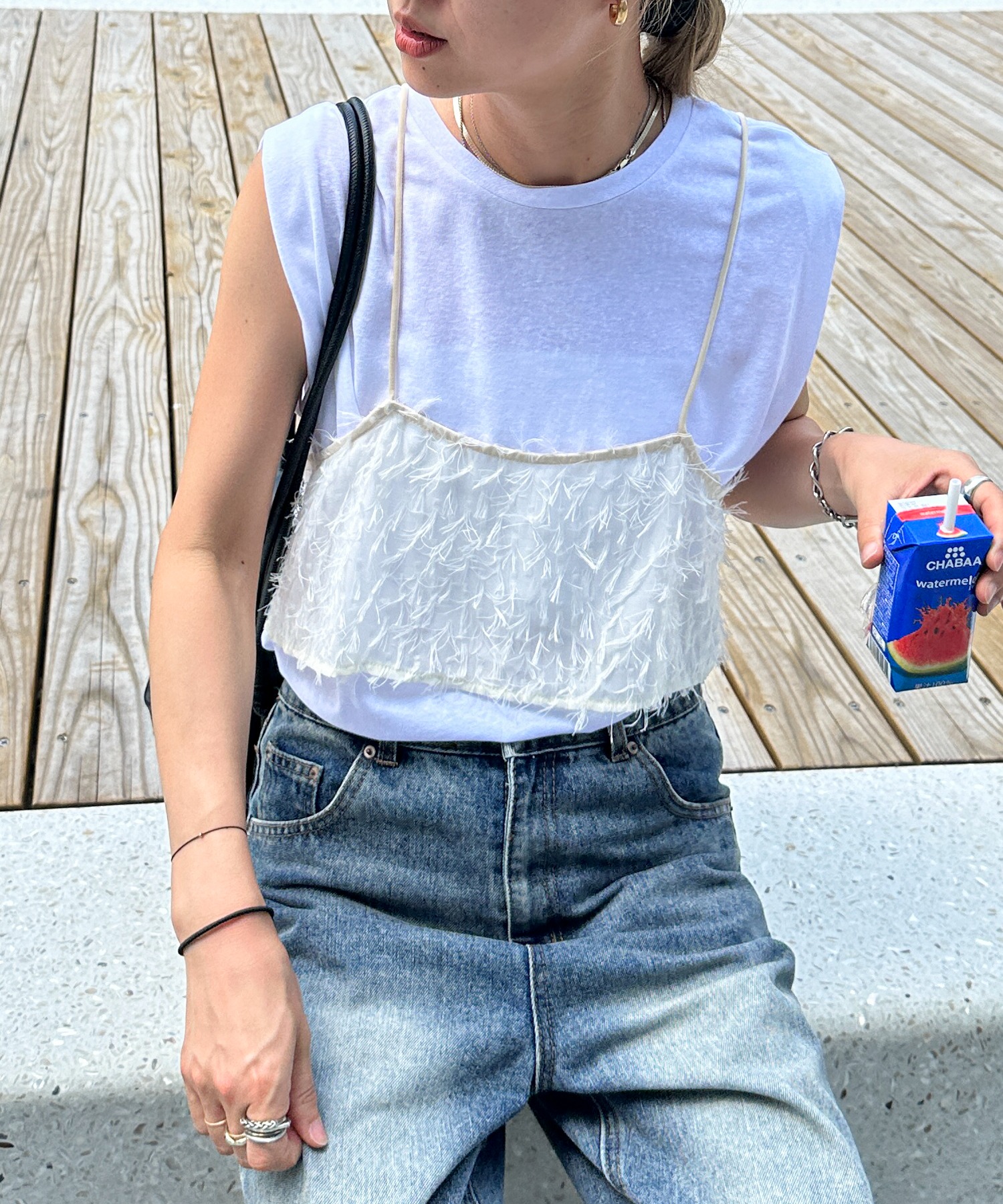 シンプルなディティールながらも特徴的な羽のようなフリンジデザインが着映えるビスチェ。
