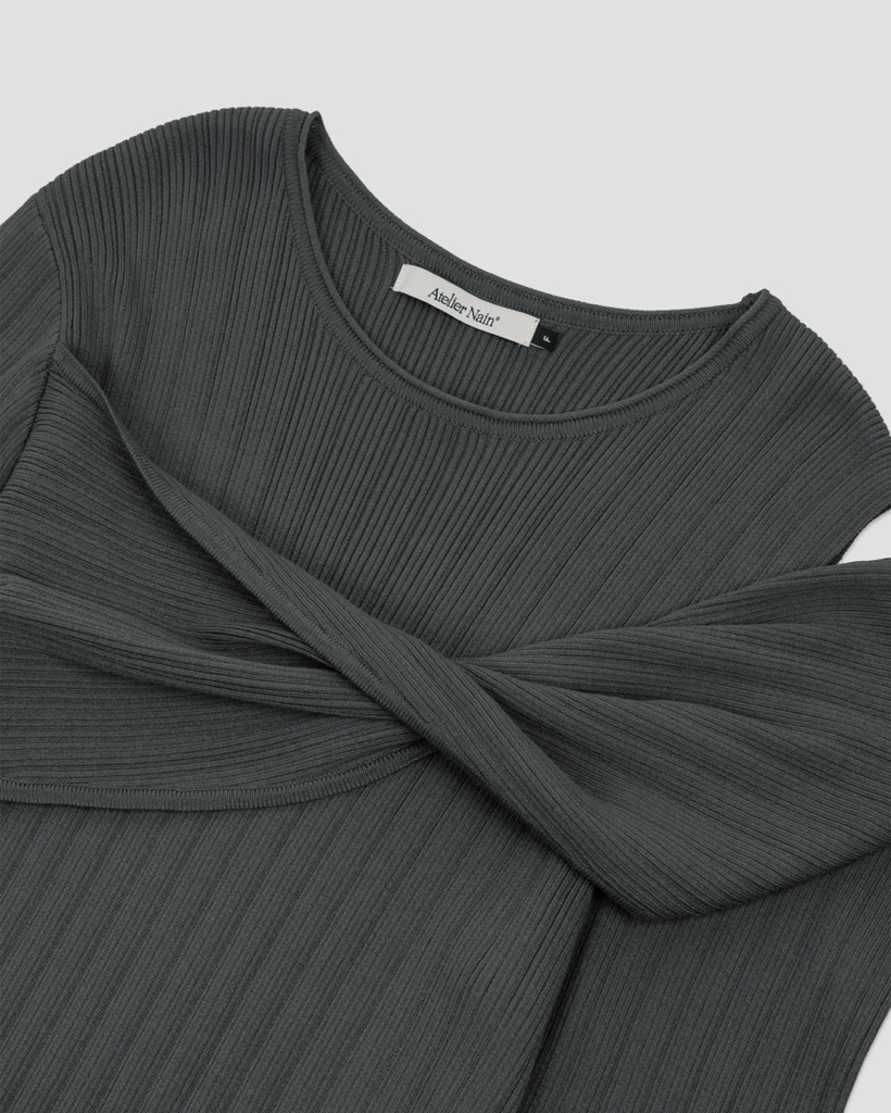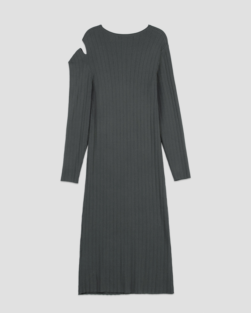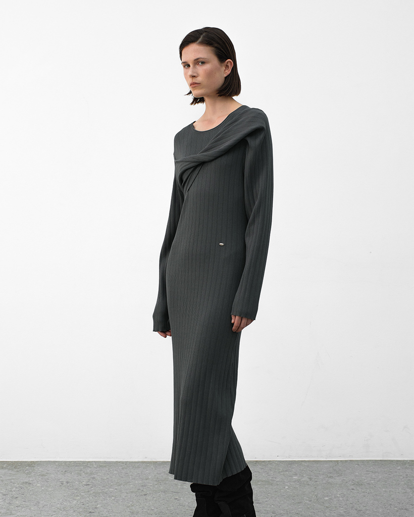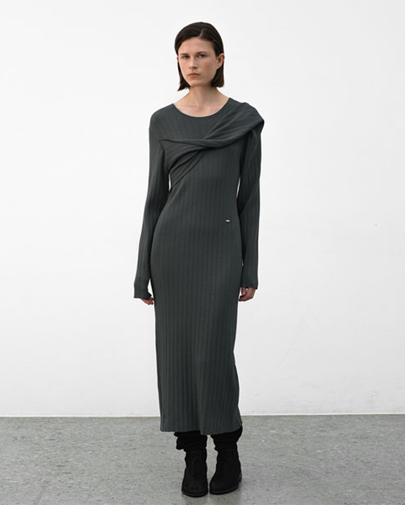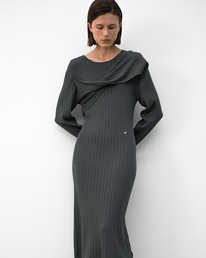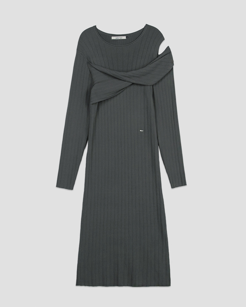 片方のショルダーが見えるカットアウトディテールが、センシュアルな雰囲気を漂わせます。