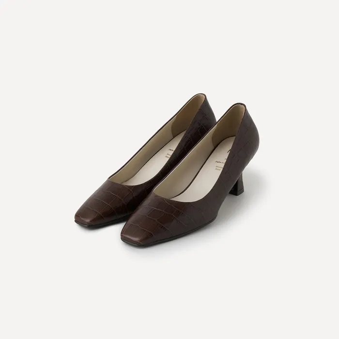 過度でない厚みのヒールは一歩ごとに安定感を与え、自然に続くラストラインが甲をいっそう美しく見せます。