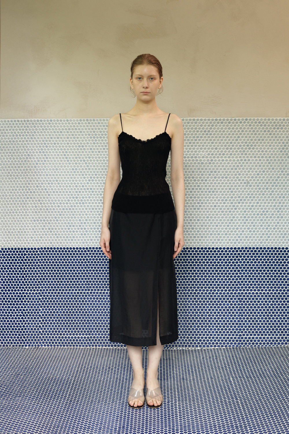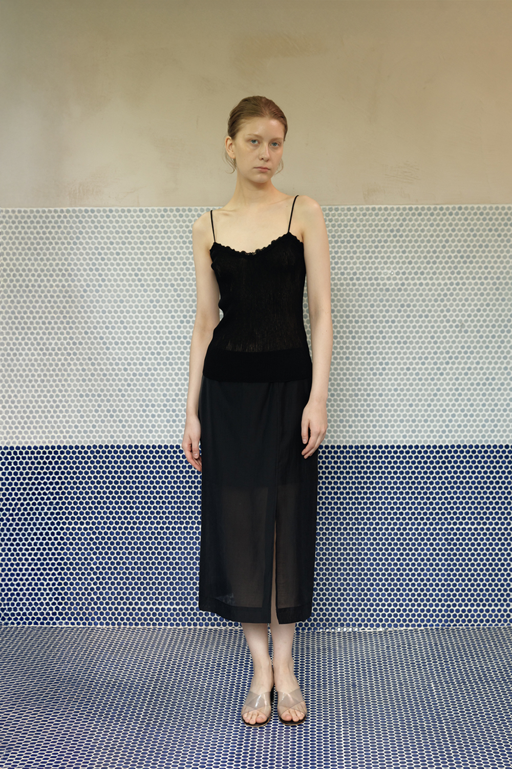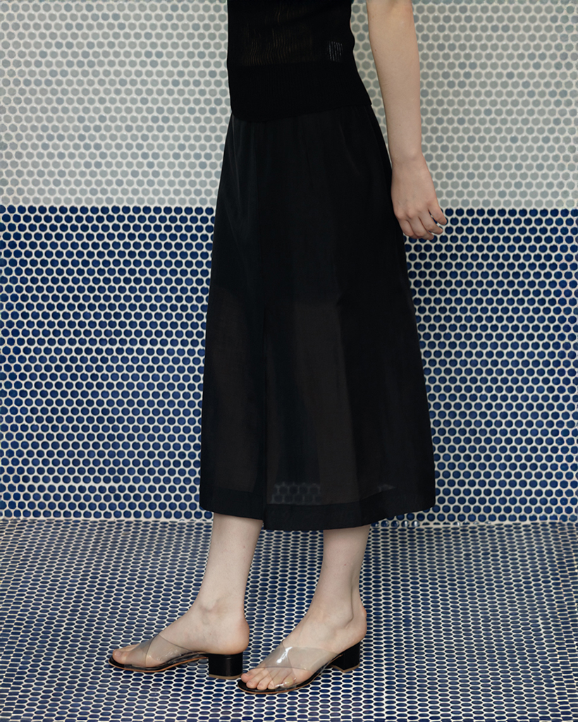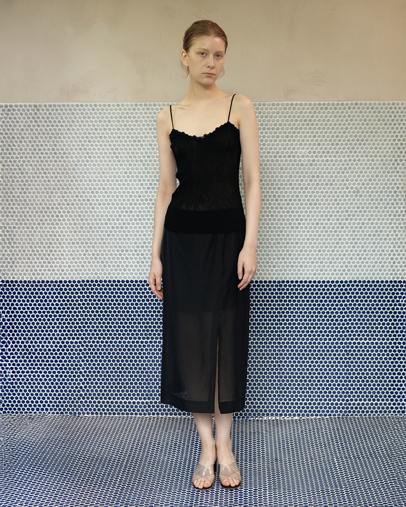 柔らかく落ちるシルエットとスリットが調和し、シアー素材特有の上品な魅力を引き立てる一着です。