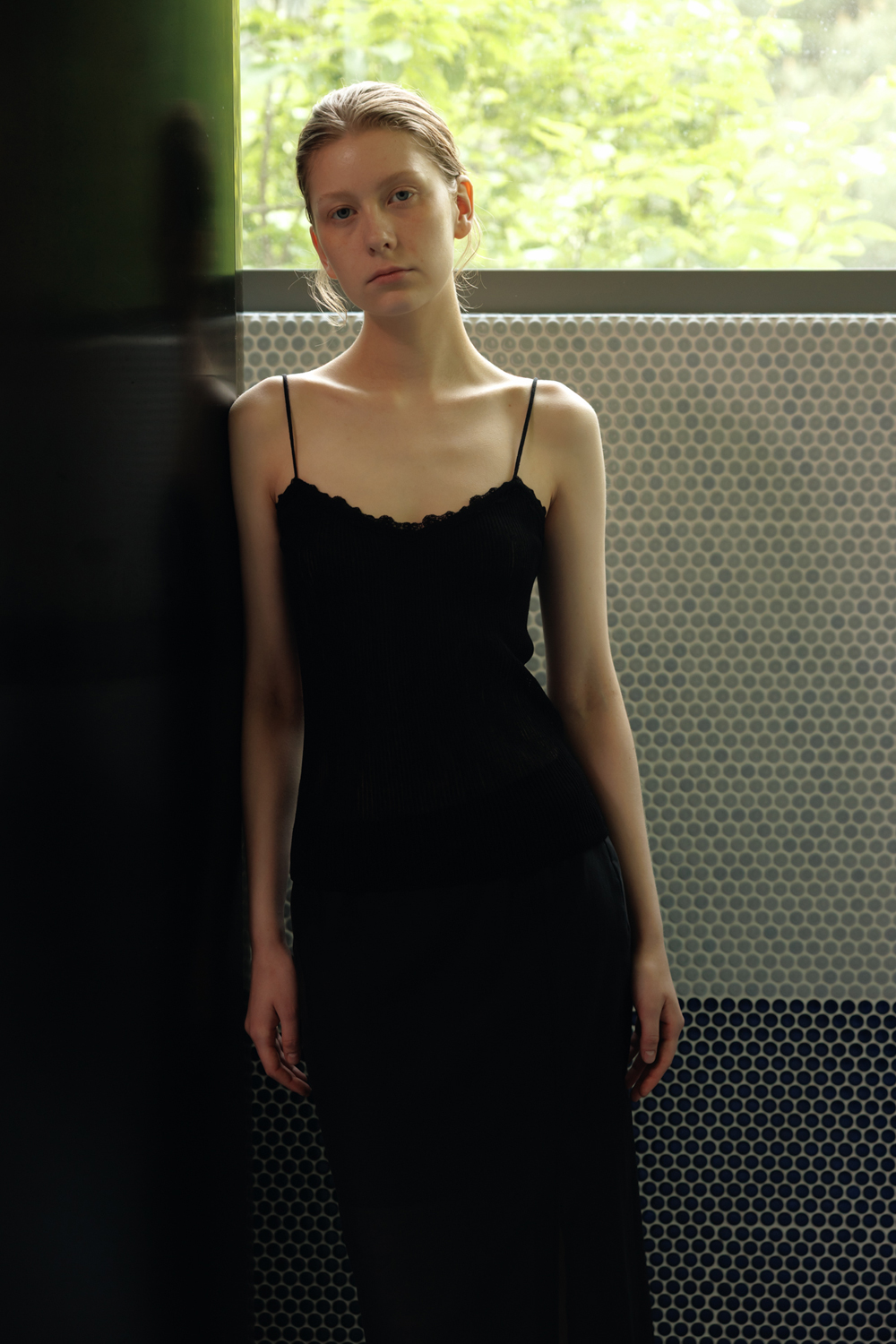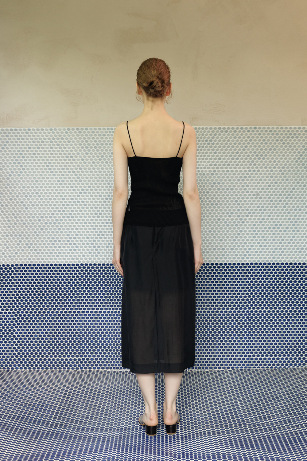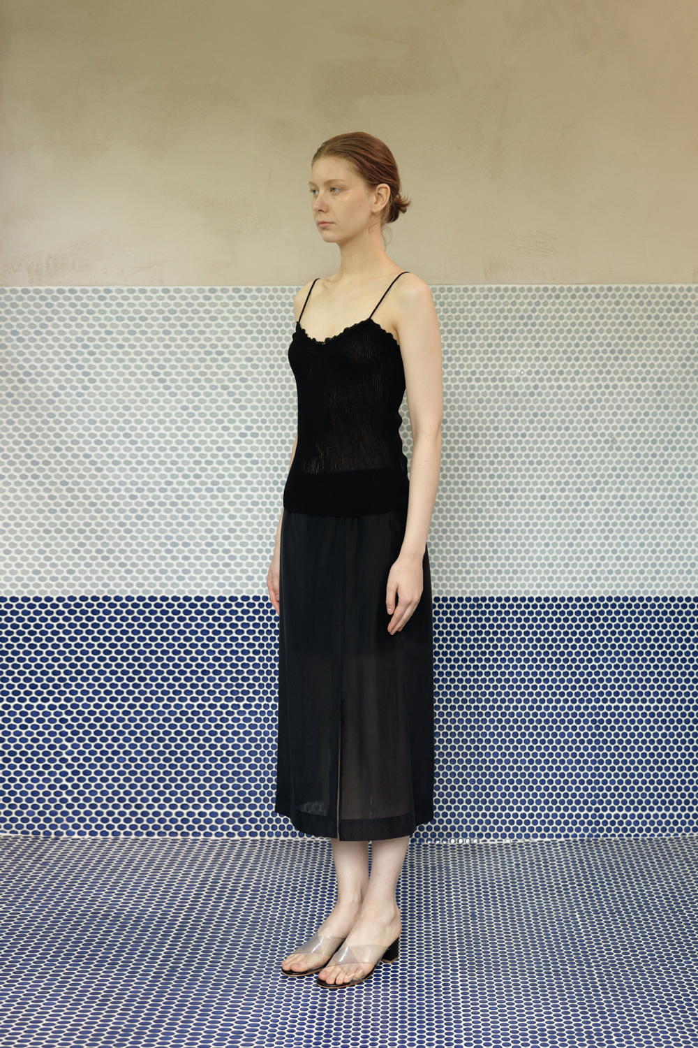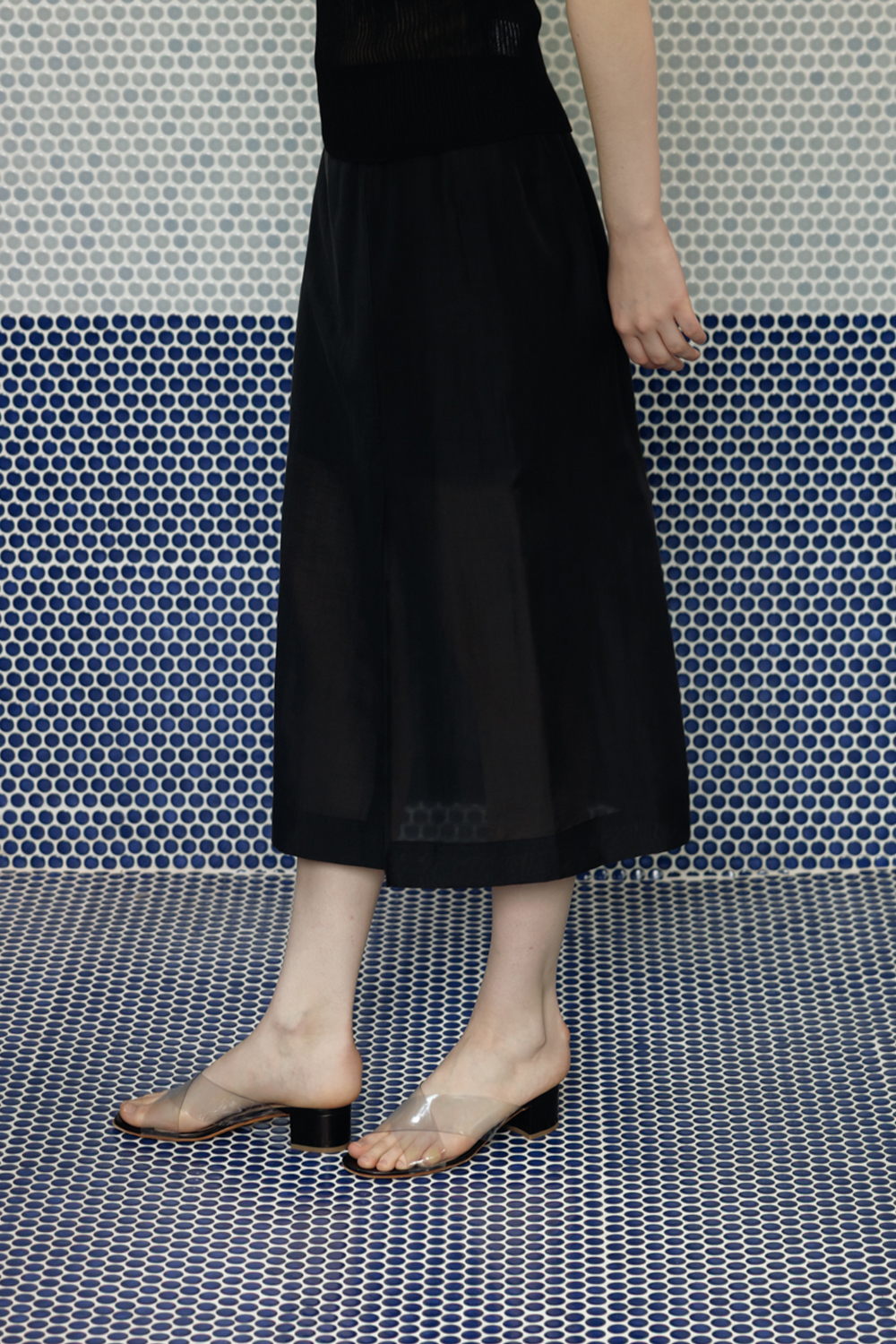 柔らかく落ちるシルエットとスリットが調和し、シアー素材特有の上品な魅力を引き立てる一着です。