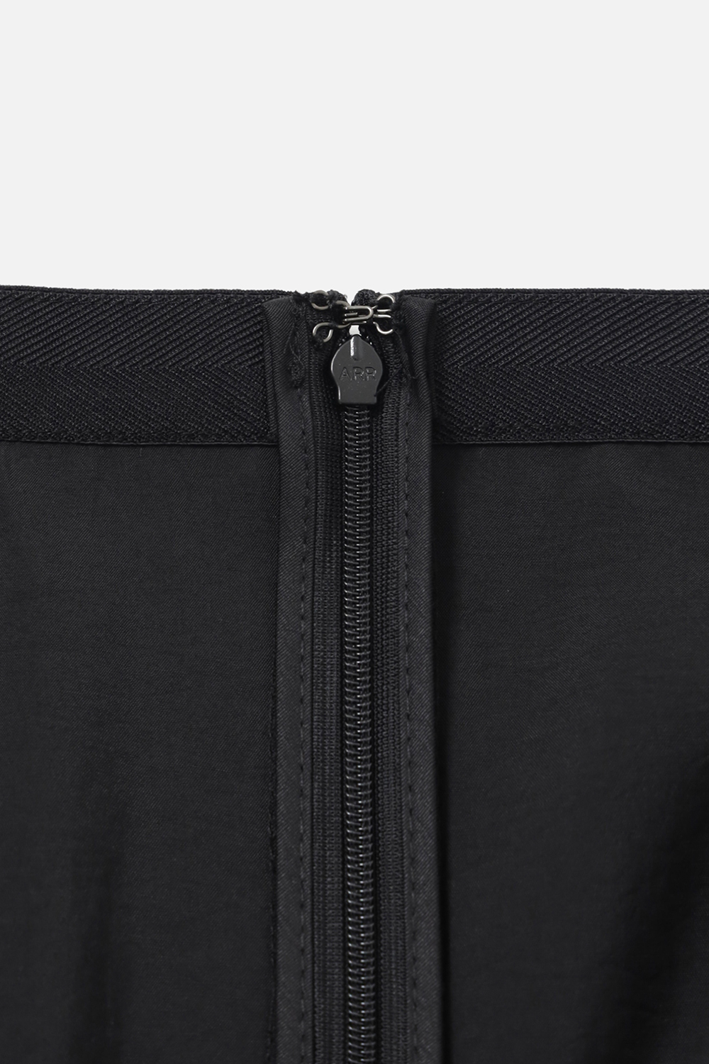 ウエストはゴム仕様、背面にはジッパーを配し、着脱もスムーズです。