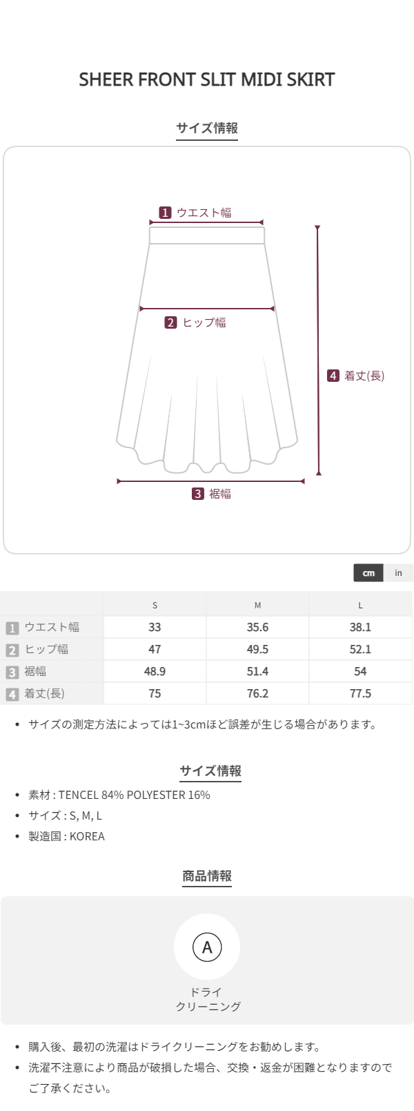 L 총기장 77.5 / 허리 38.1 / 힙 52.1 / 밑단 54