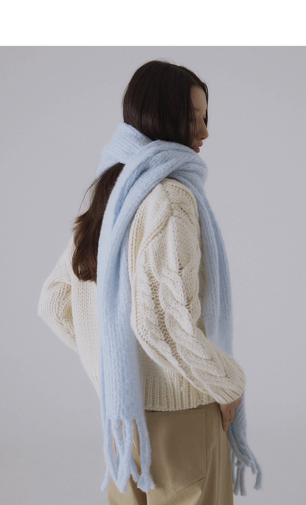 両端のフリンジディテールがクラシックな印象を添え、シンプルなフォルムの中に素材の質感が穏やかに際立ちます。