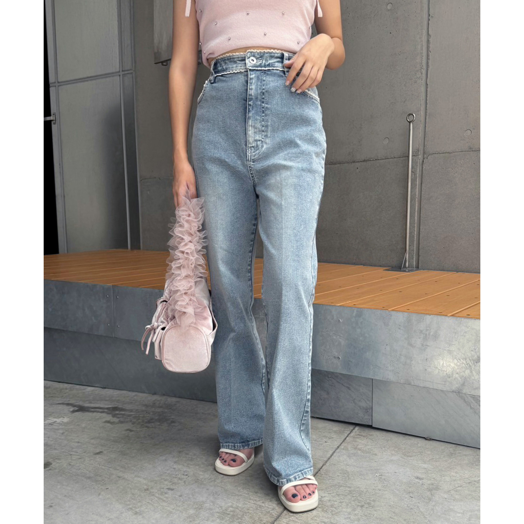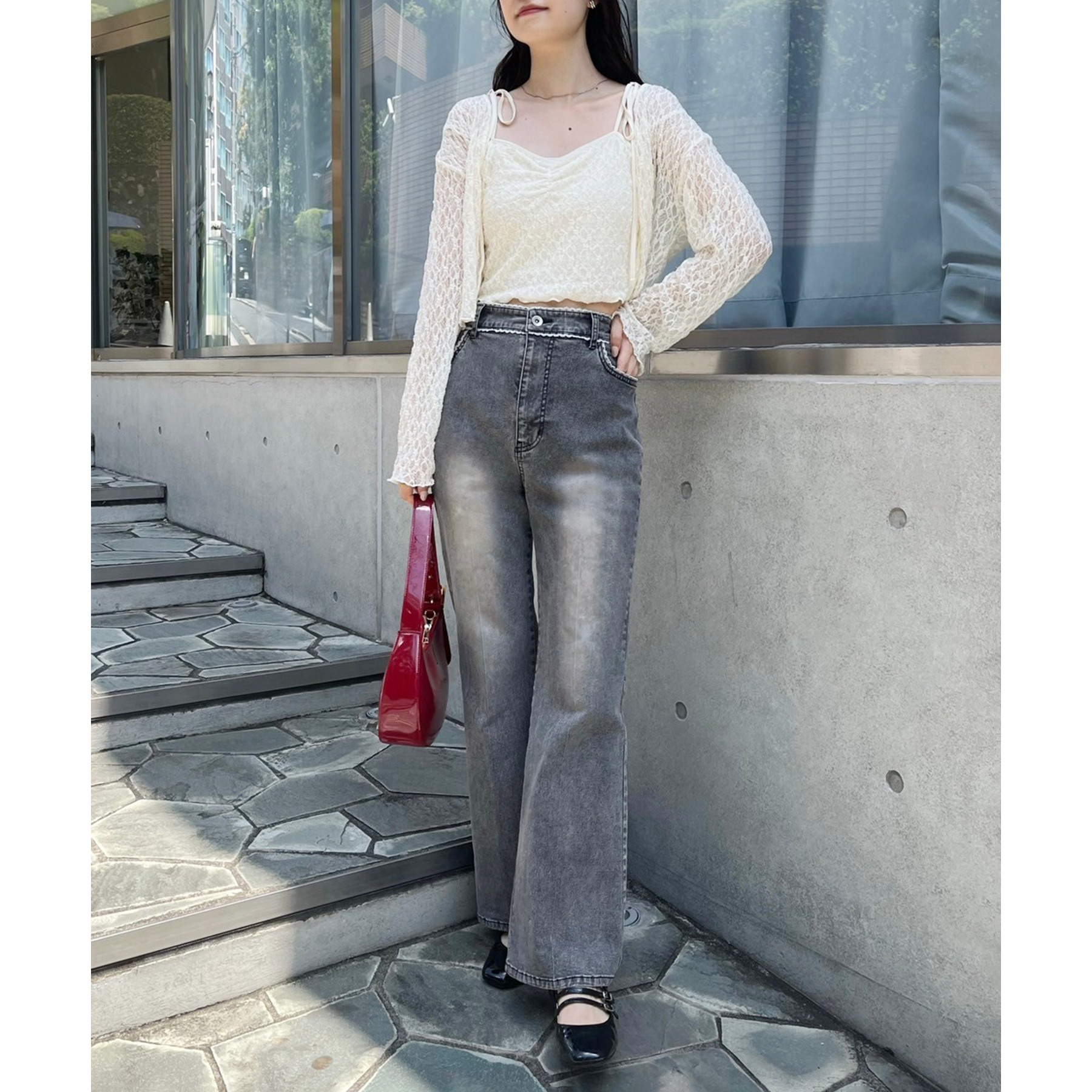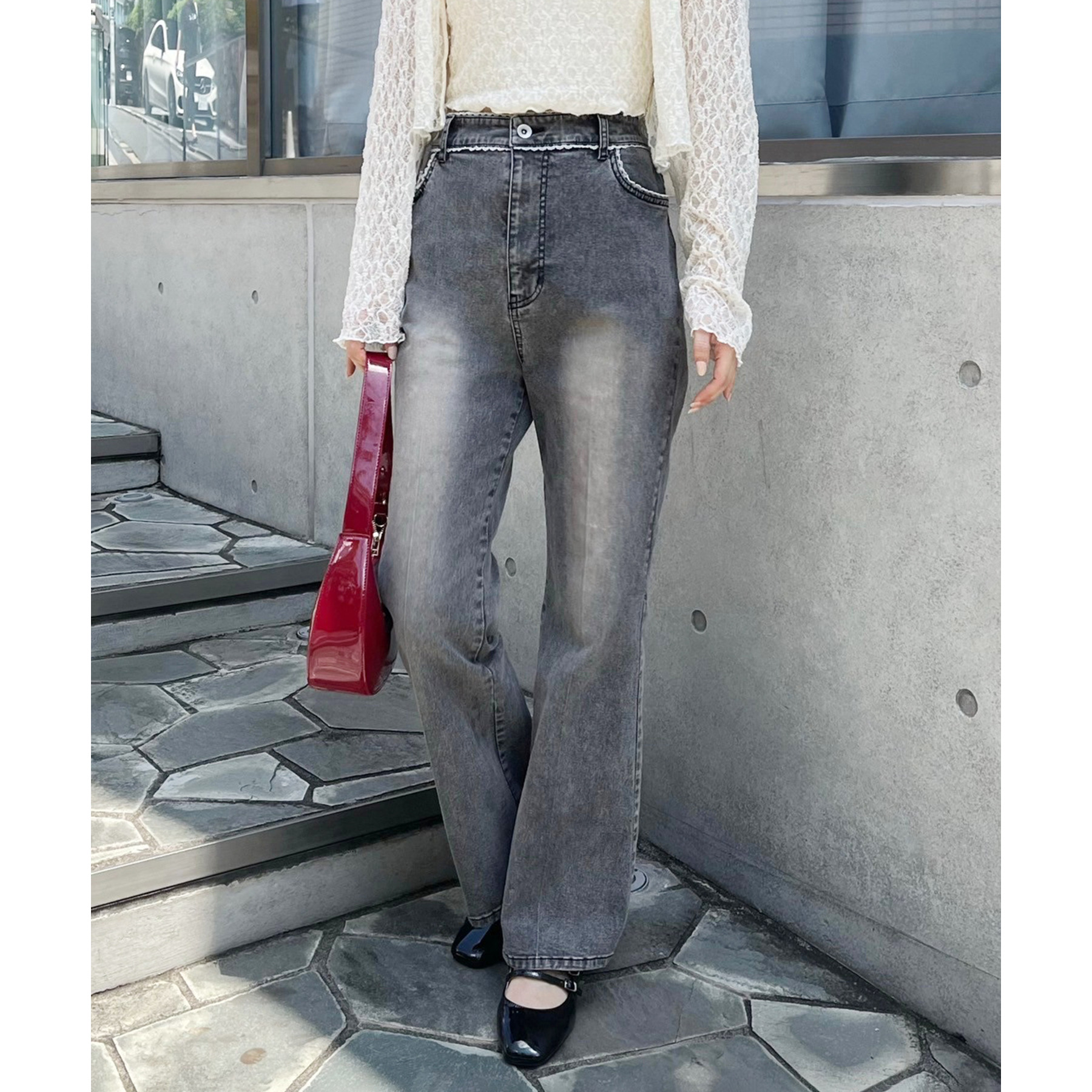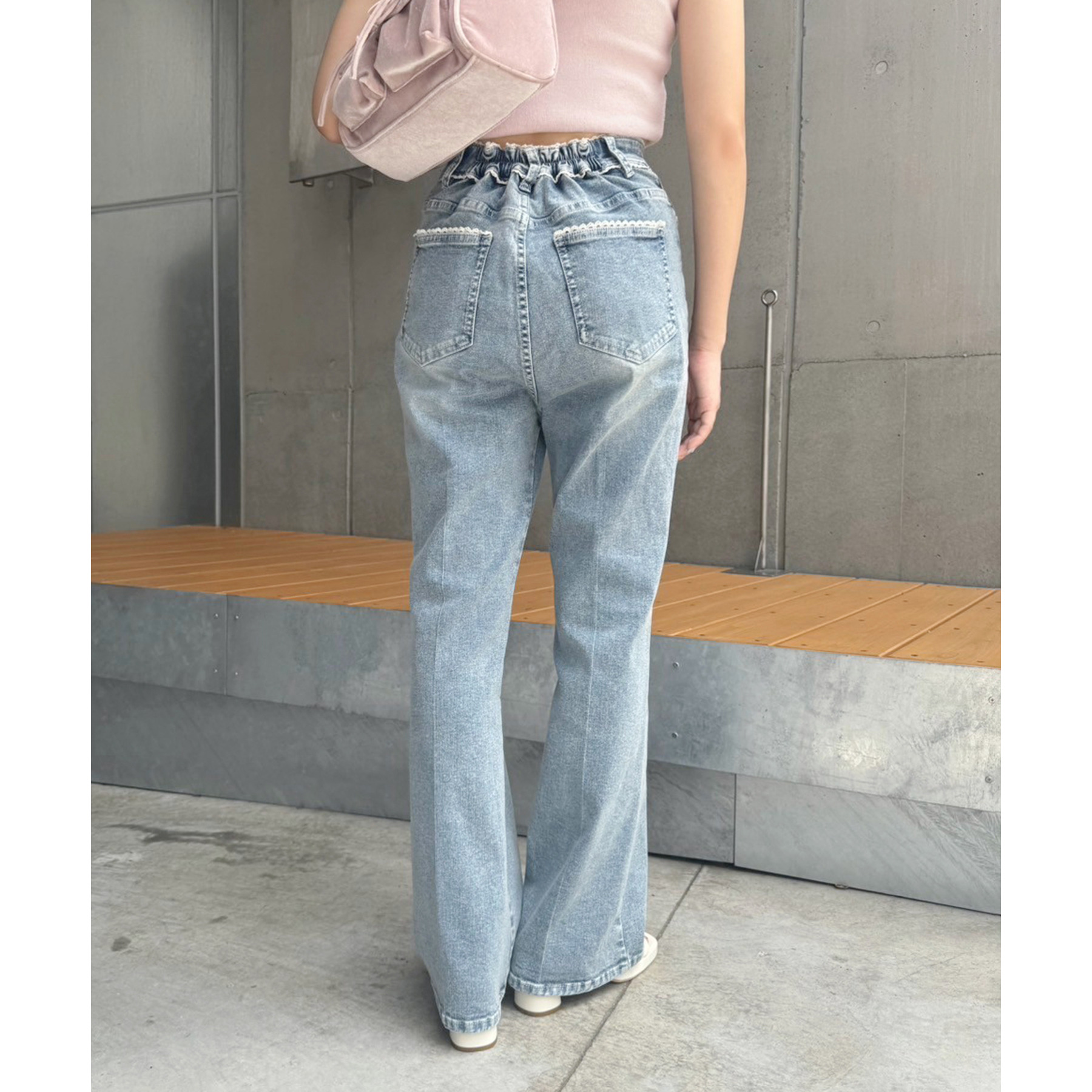 ピコレースがフレンチガーリーさを演出してくれるフレアデニムパンツ