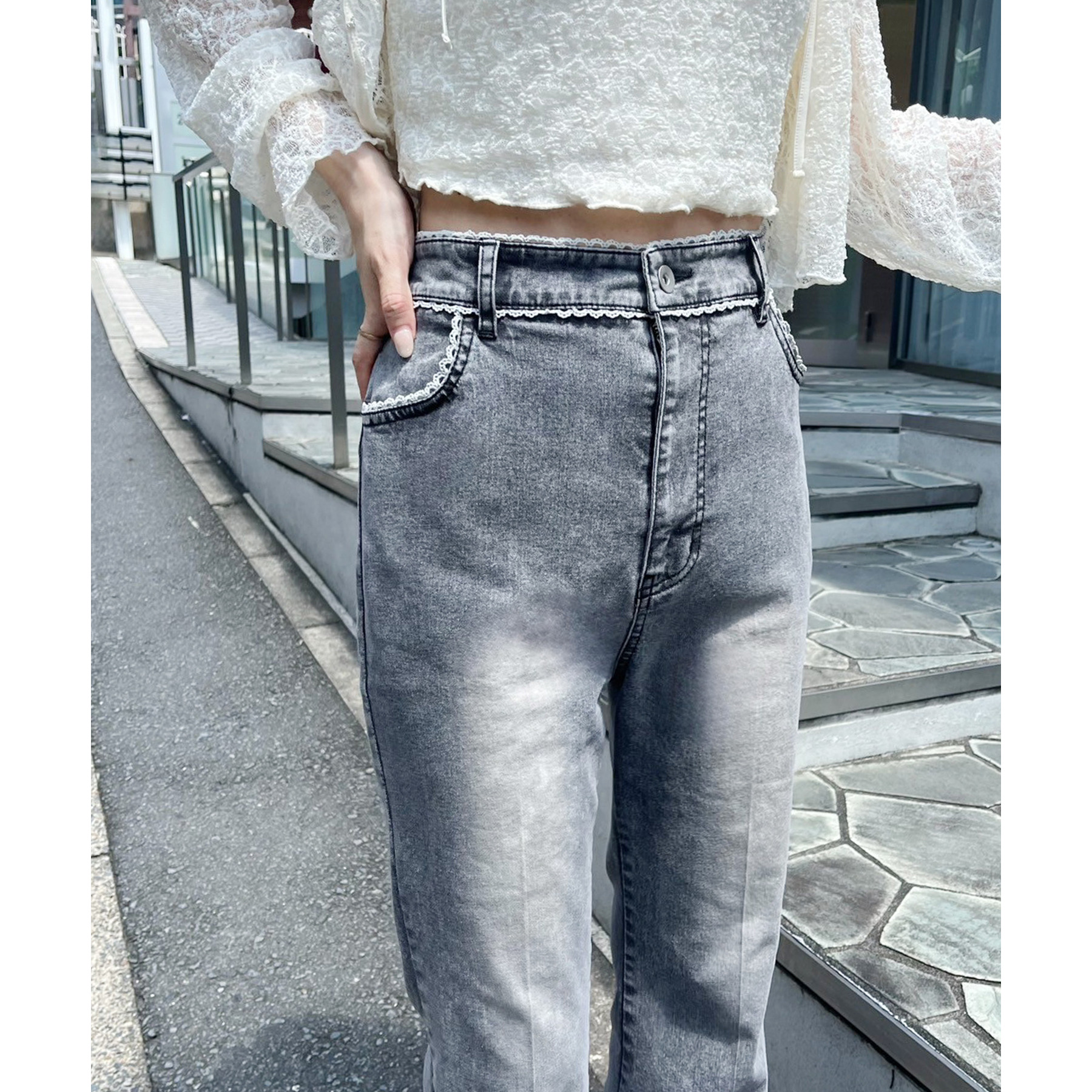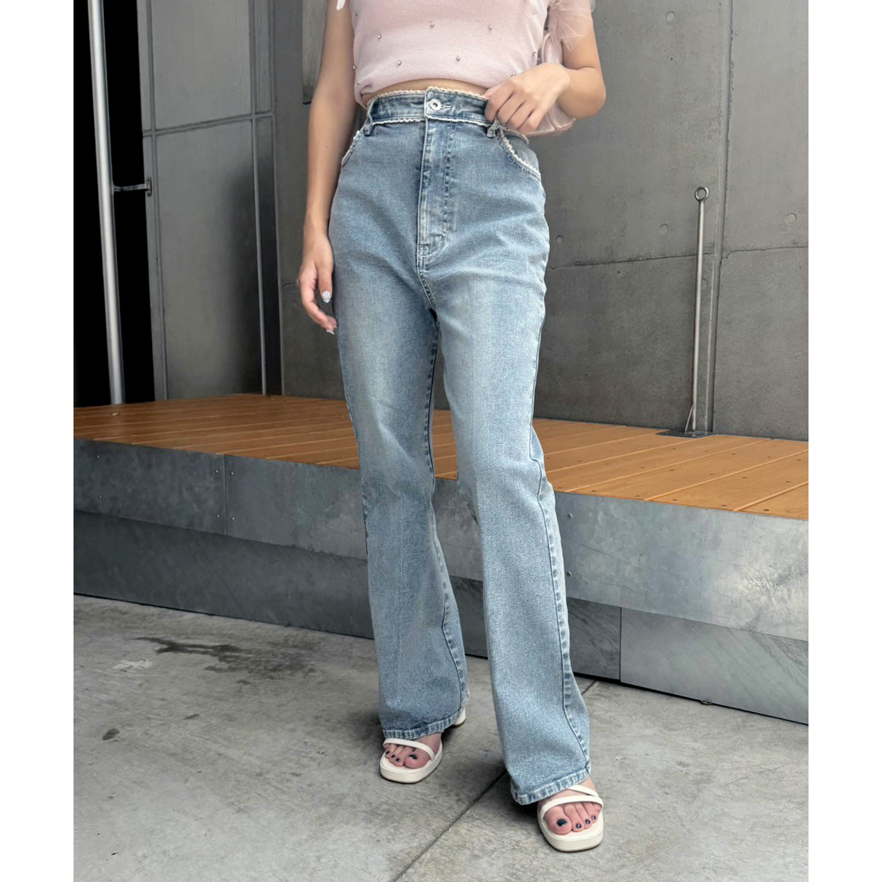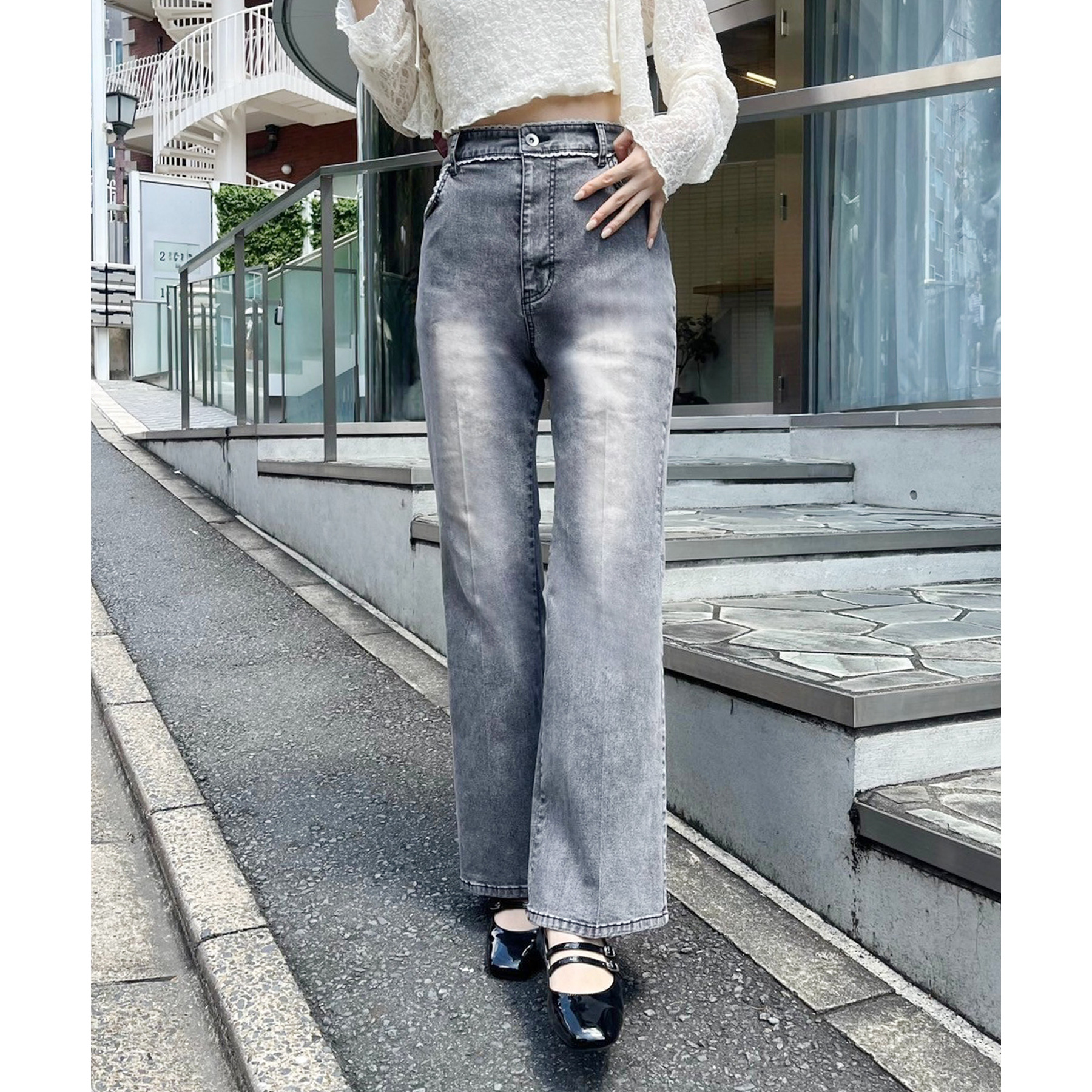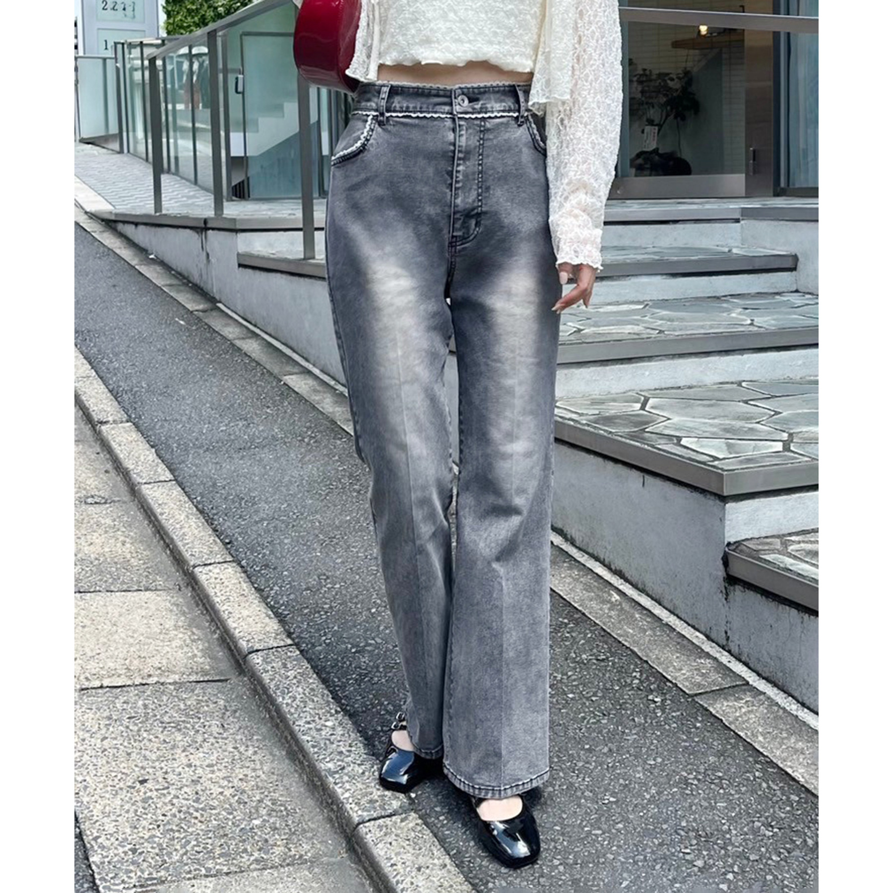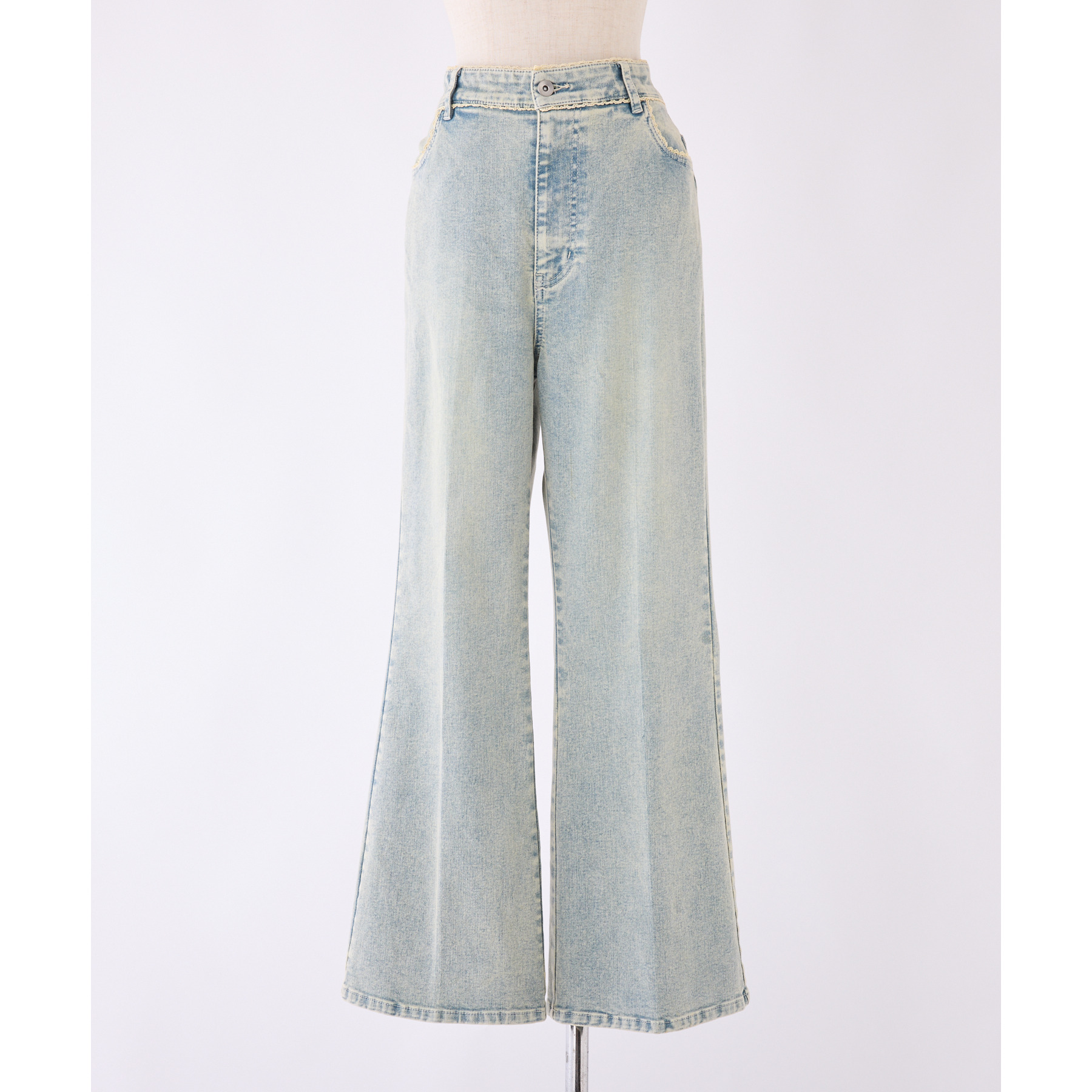 ピコレースがフレンチガーリーさを演出してくれるフレアデニムパンツ