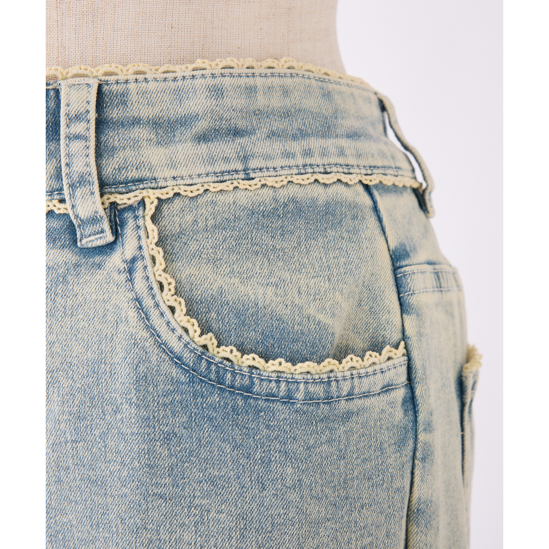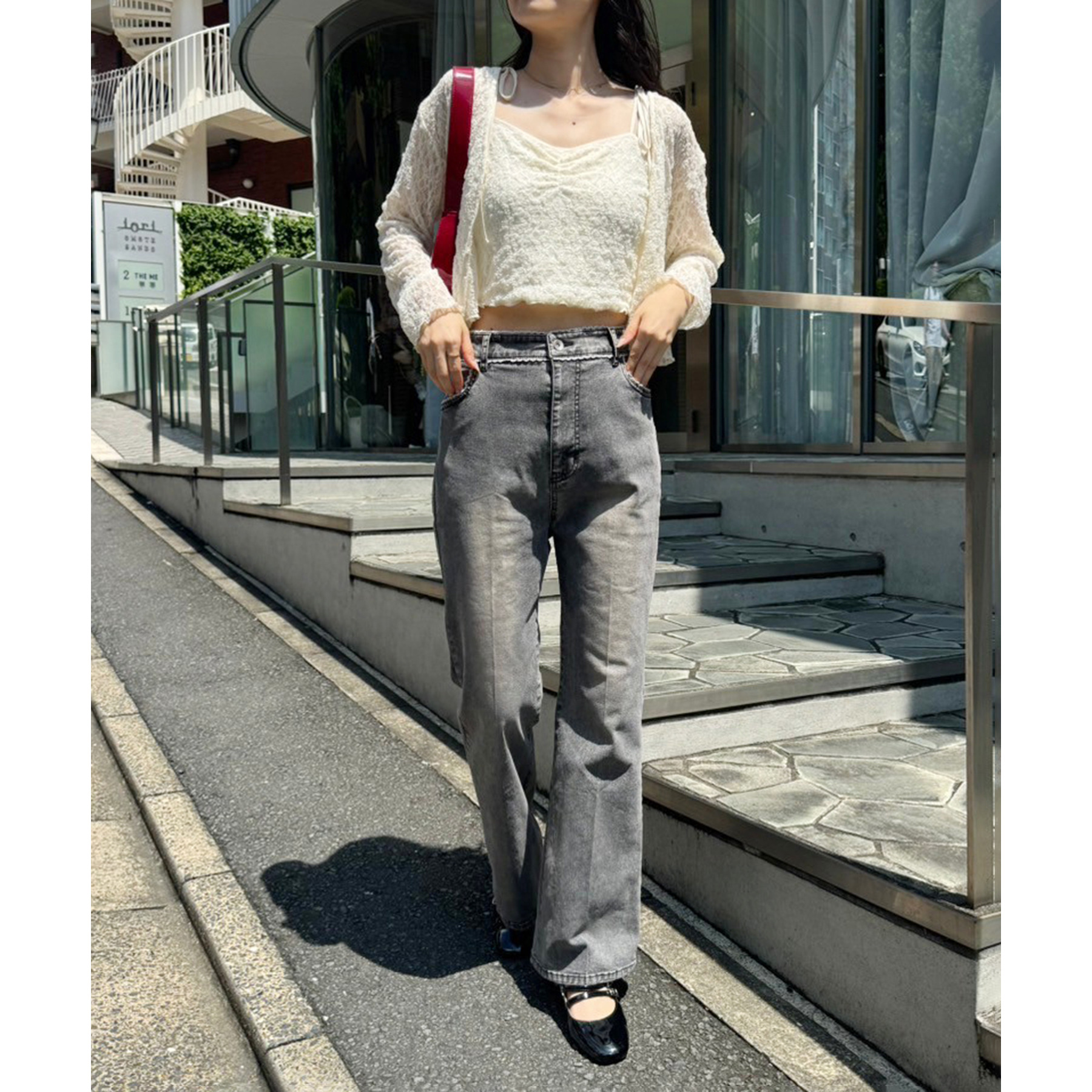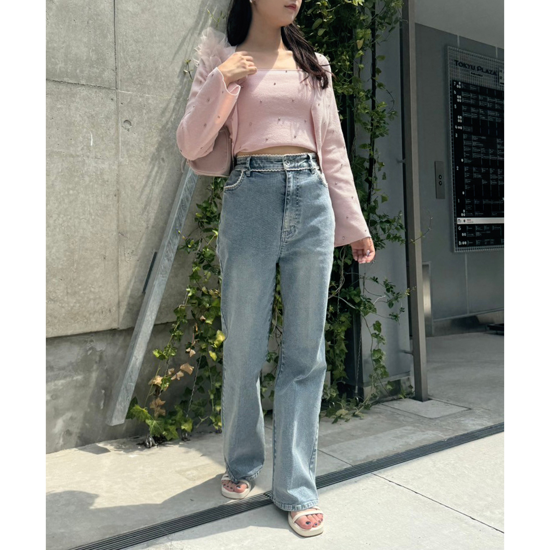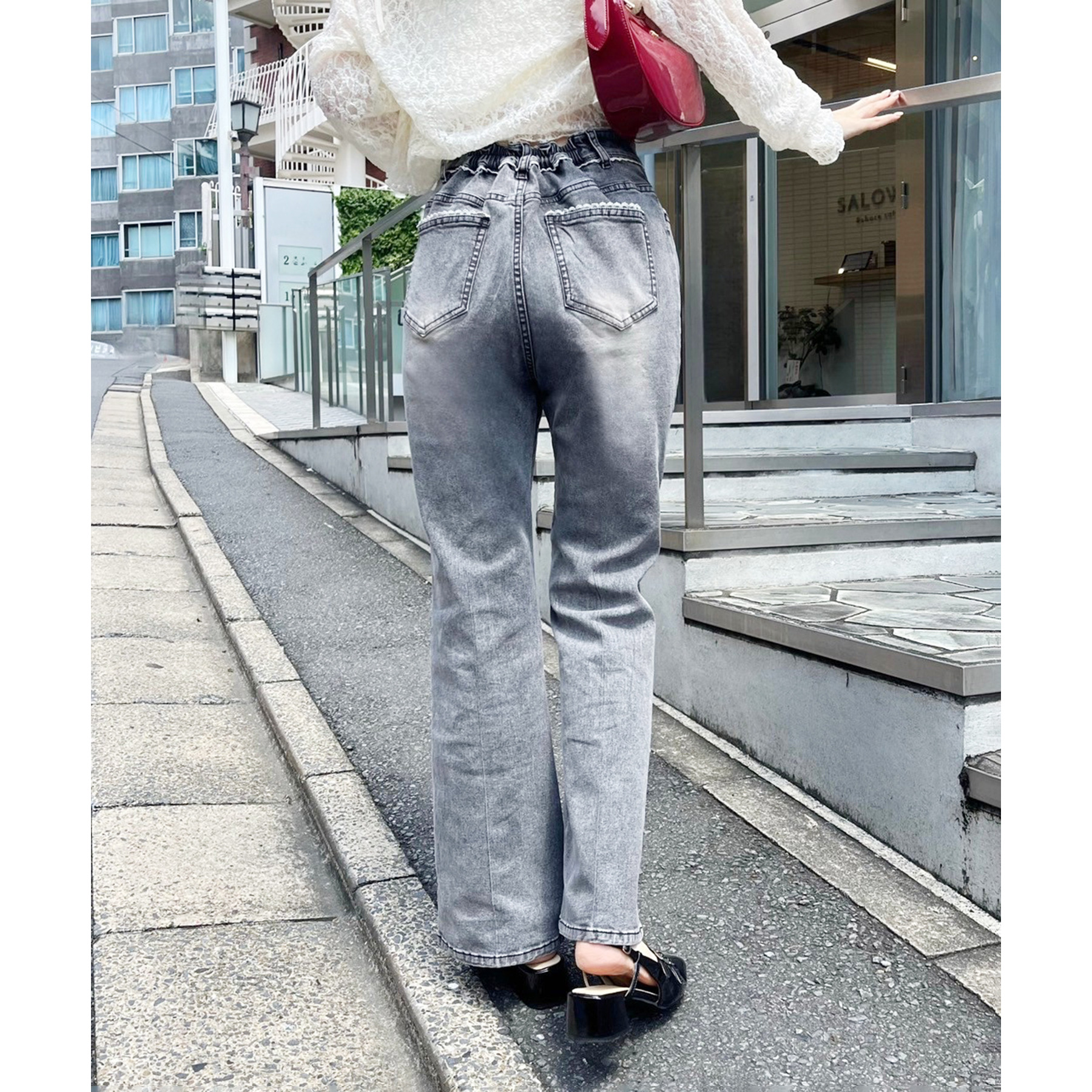 ピコレースがフレンチガーリーさを演出してくれるフレアデニムパンツ