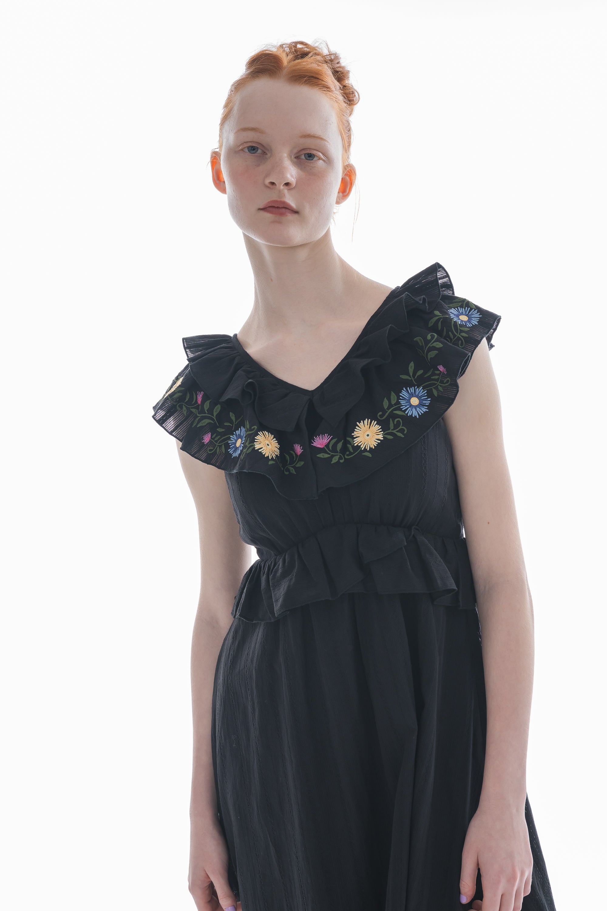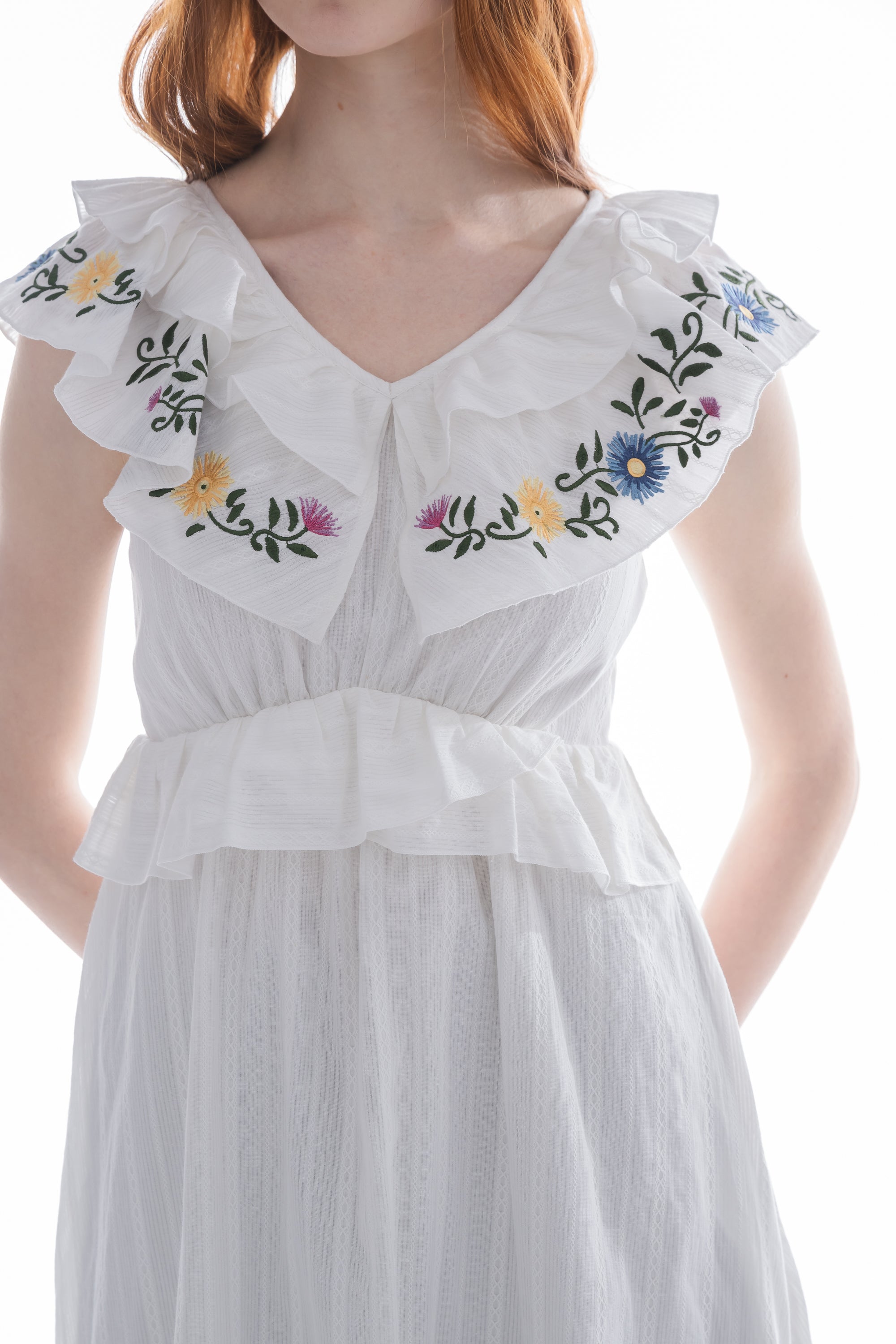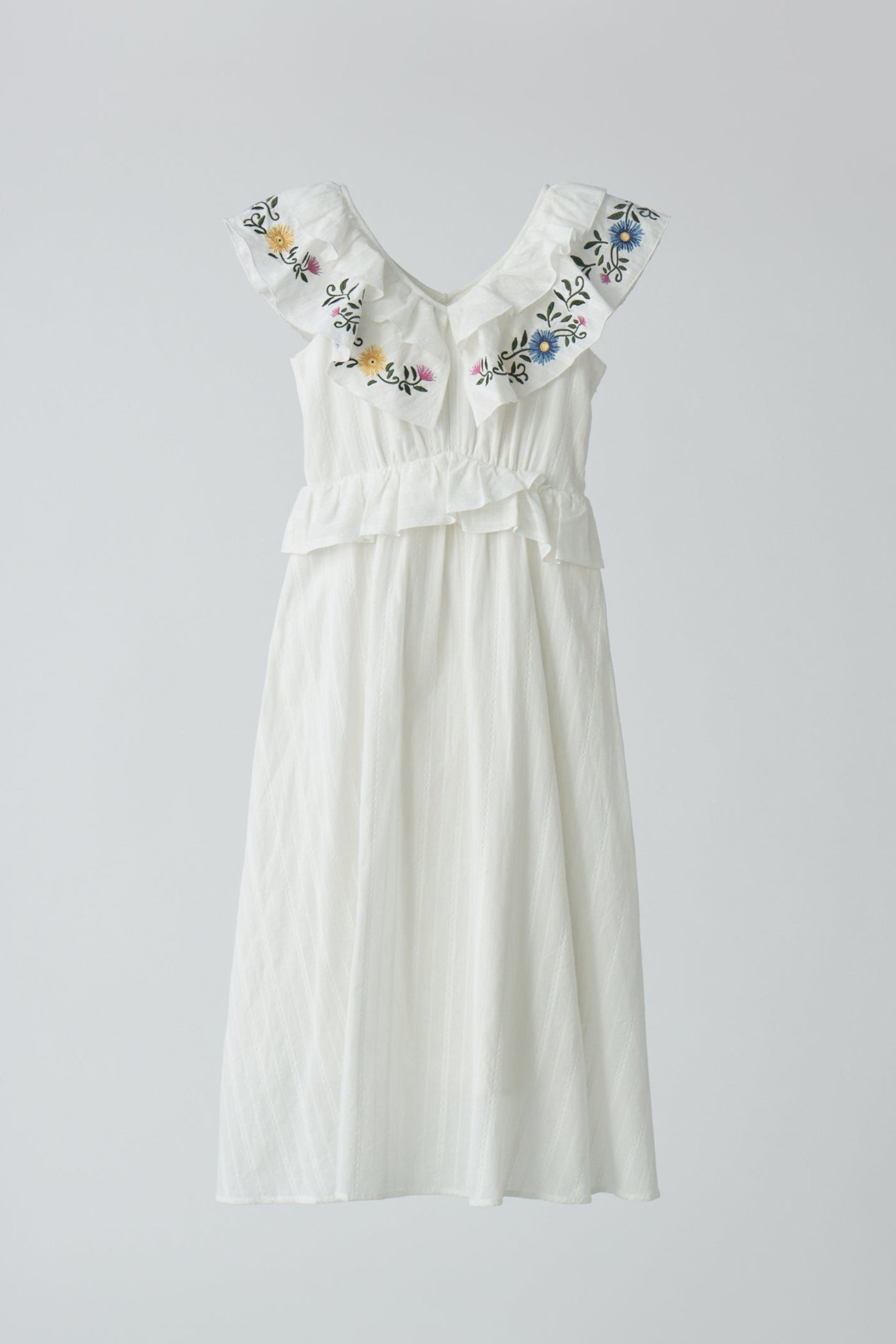 カラフルな花刺繍とフリルで彩る、華やかワンピース