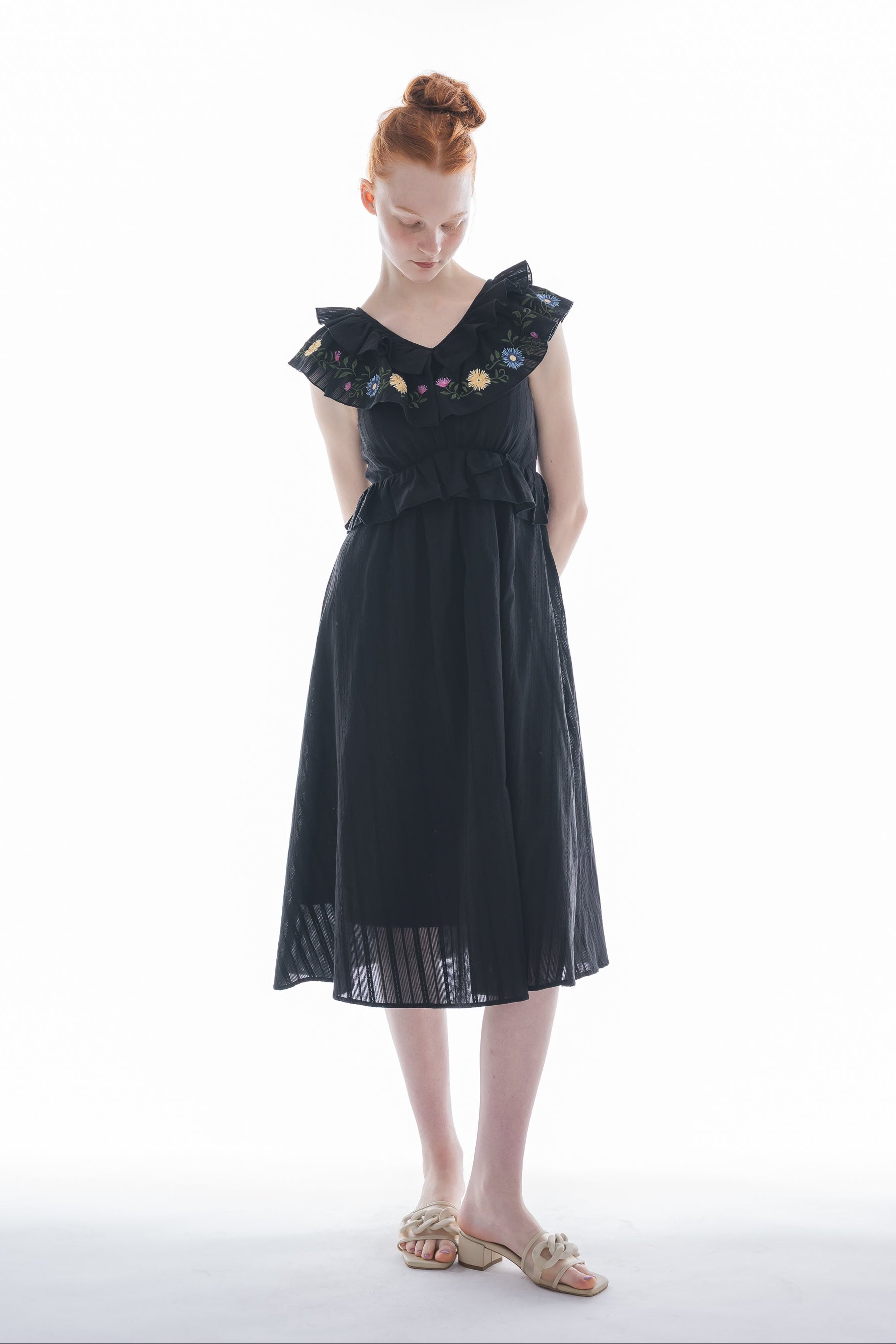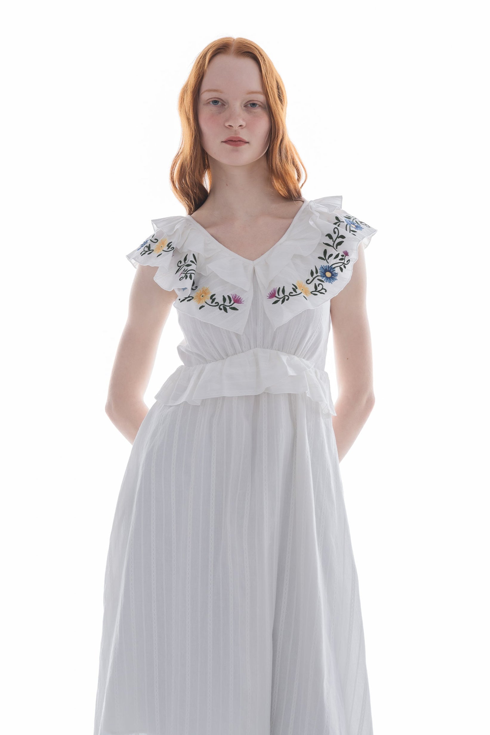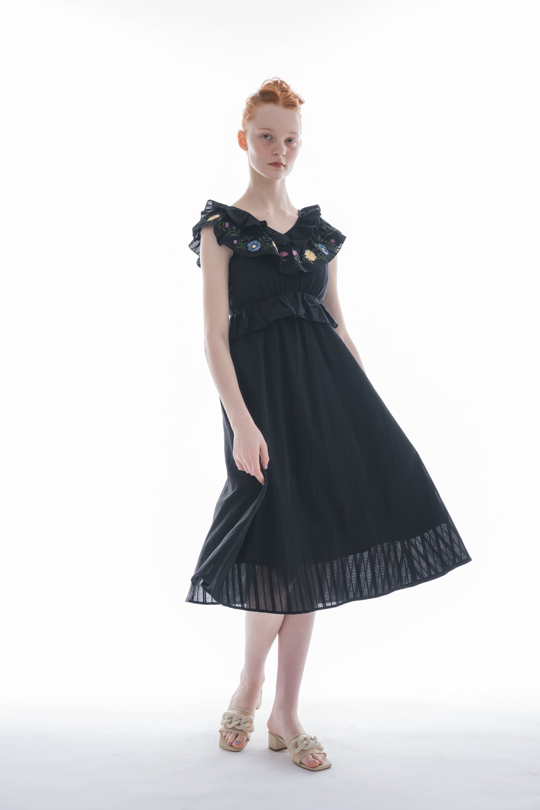 カラフルな花刺繍とフリルで彩る、華やかワンピース