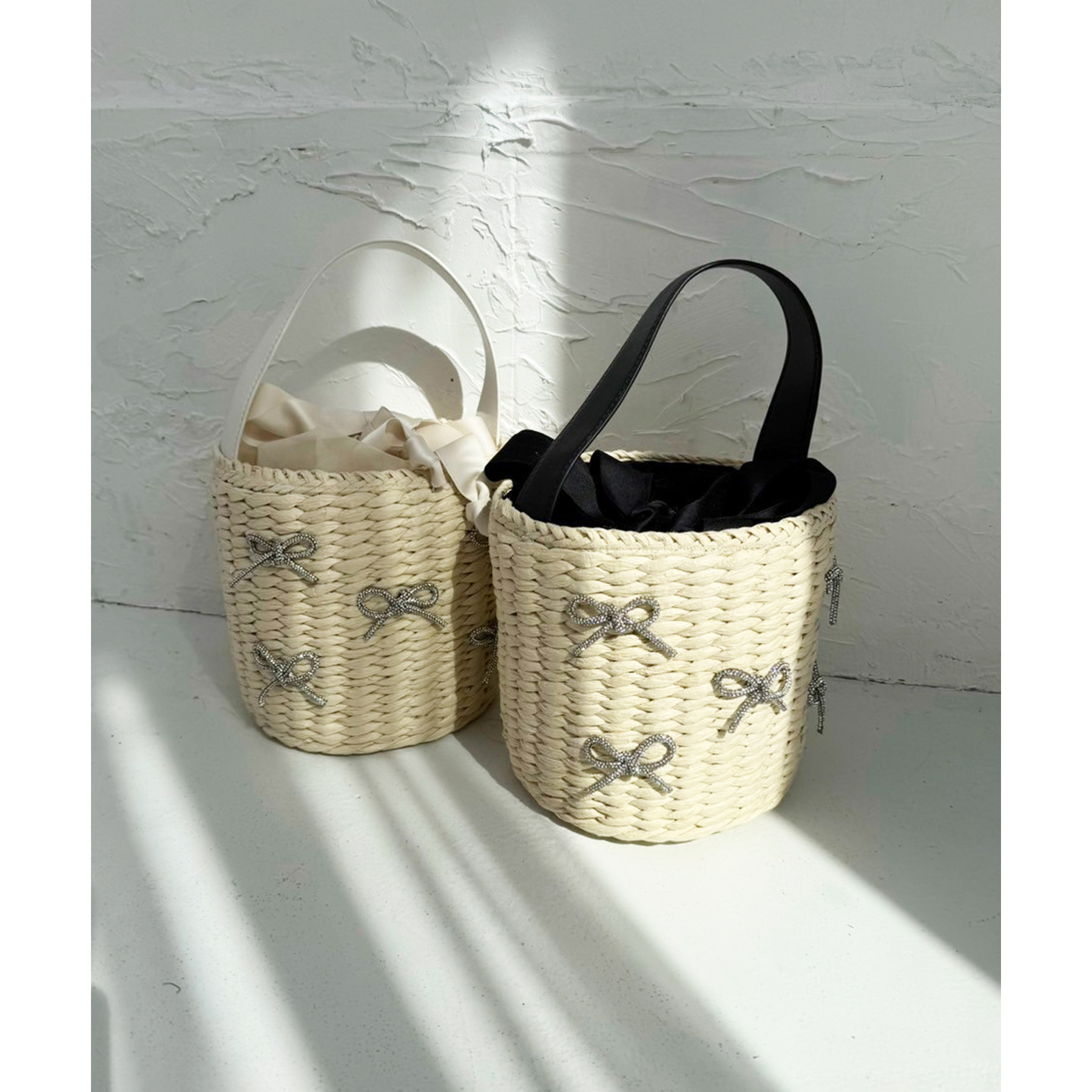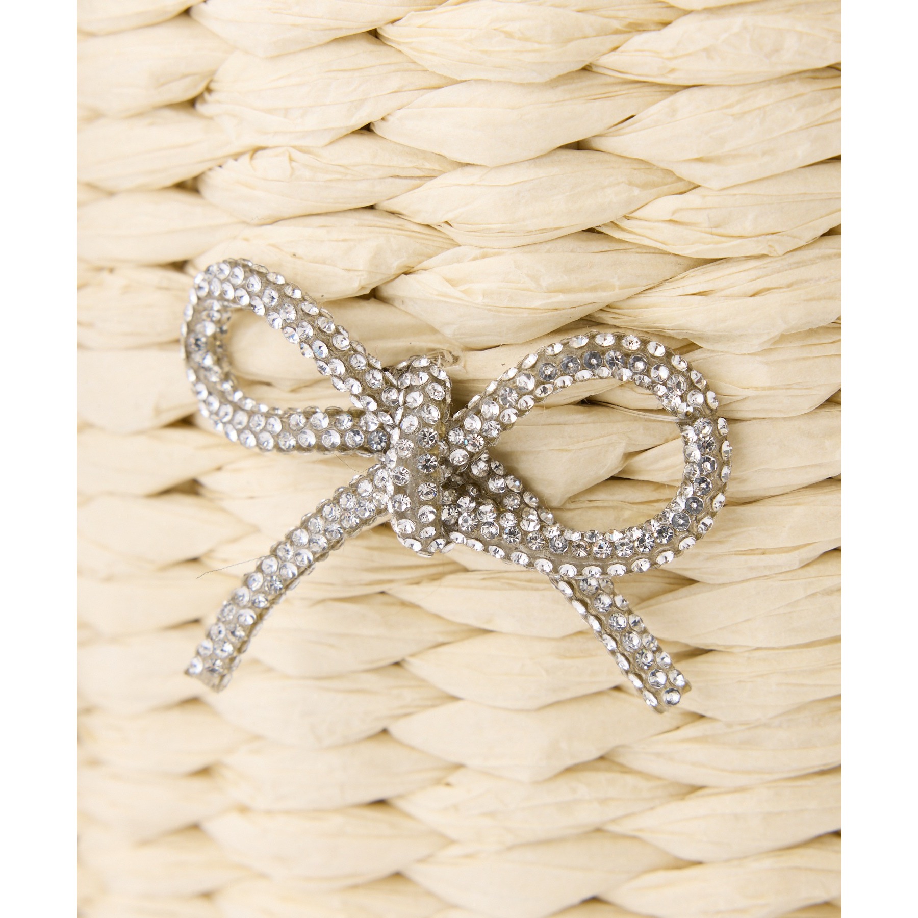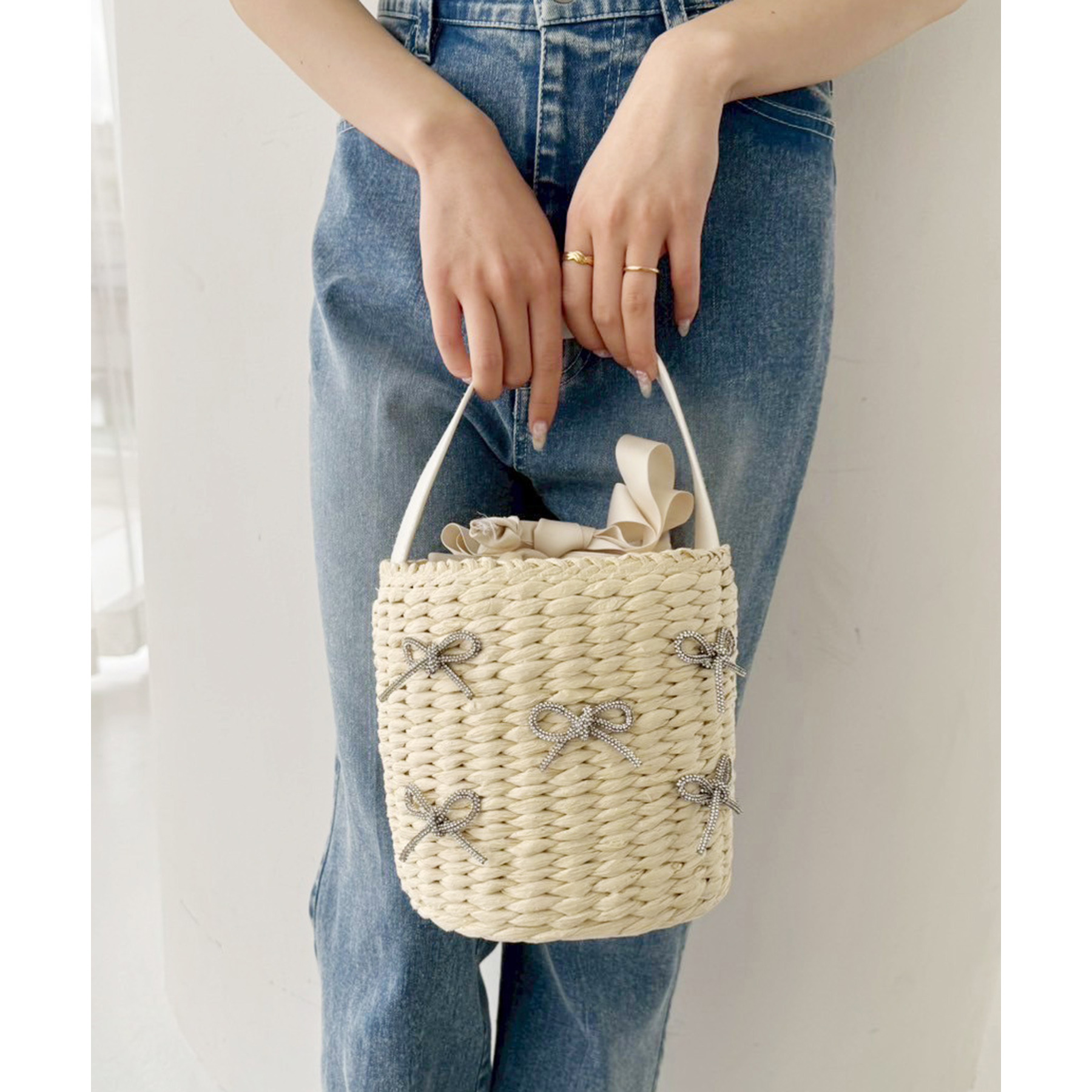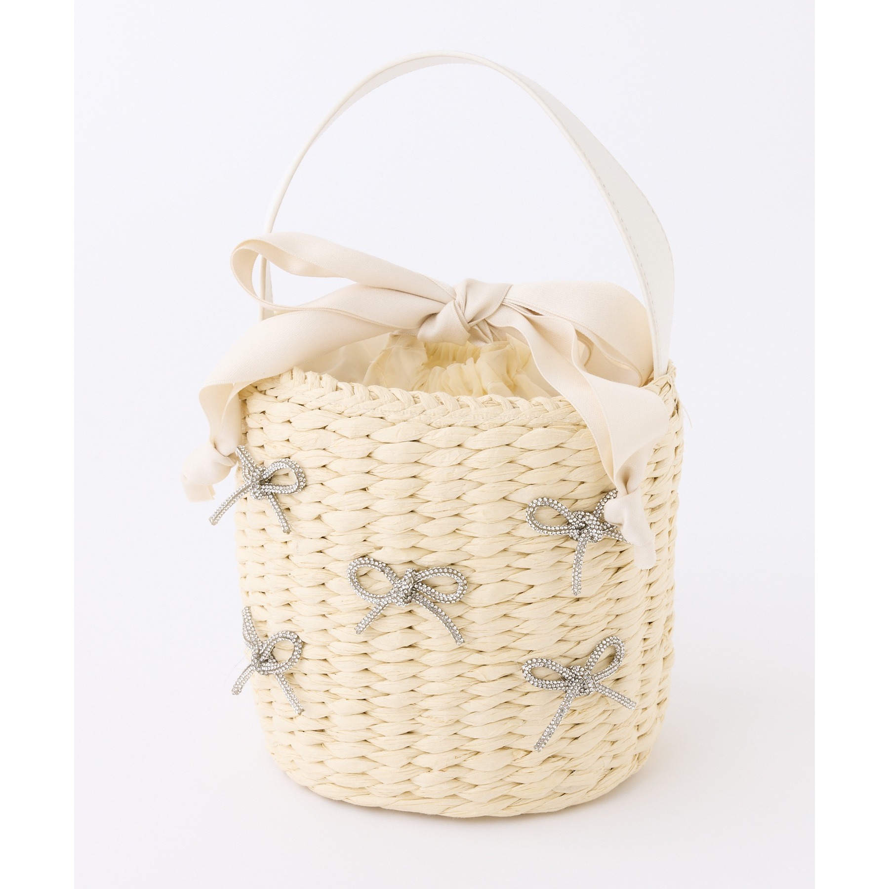 ナチュラルな風合いのカゴ素材に、キラキラ輝くリボンデザインが華やかさをプラス。
