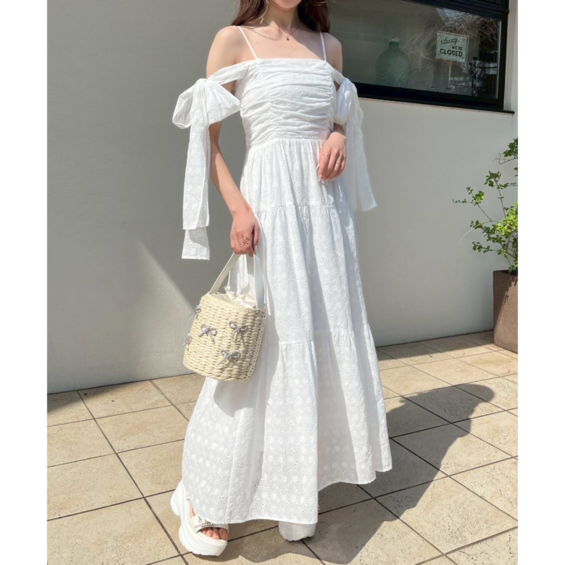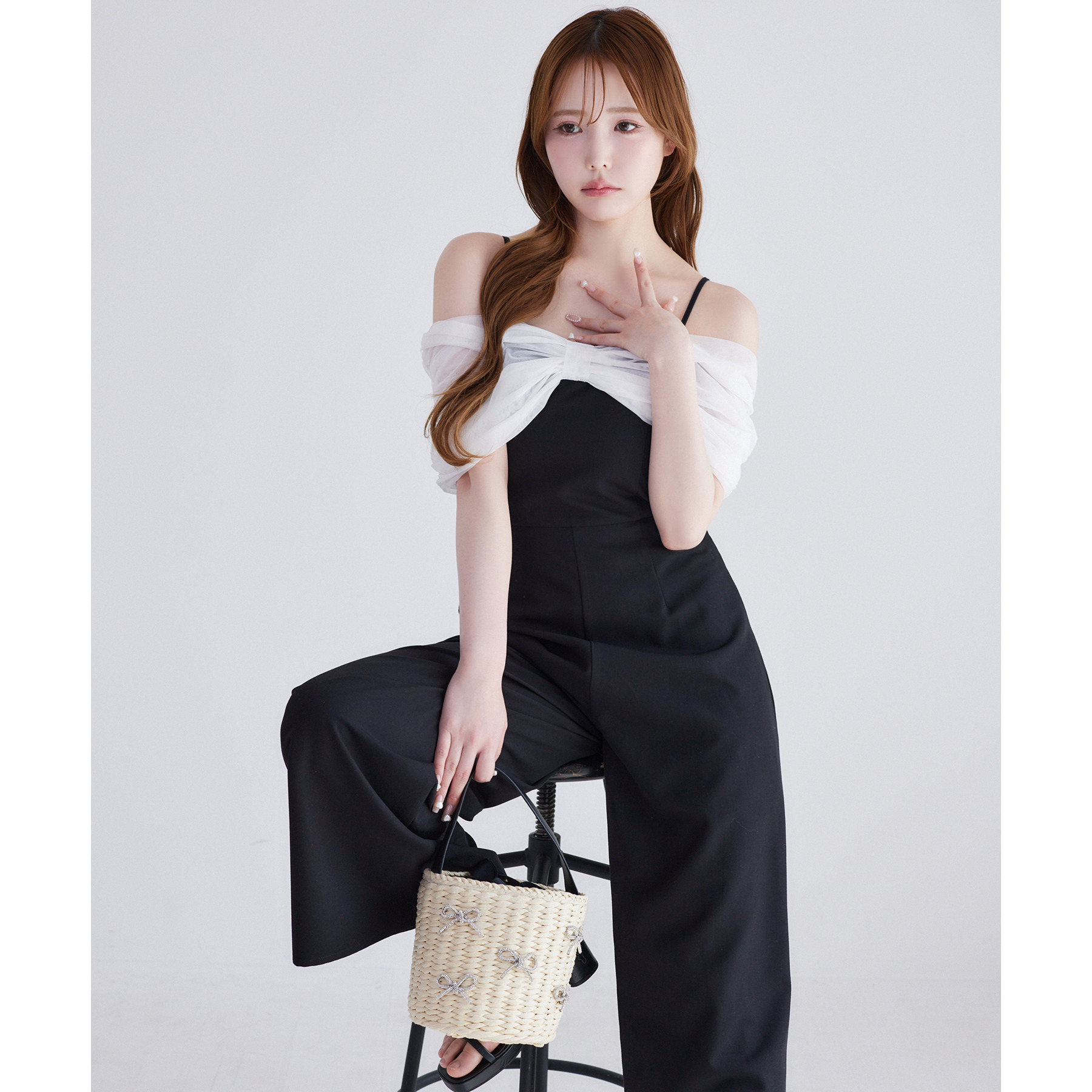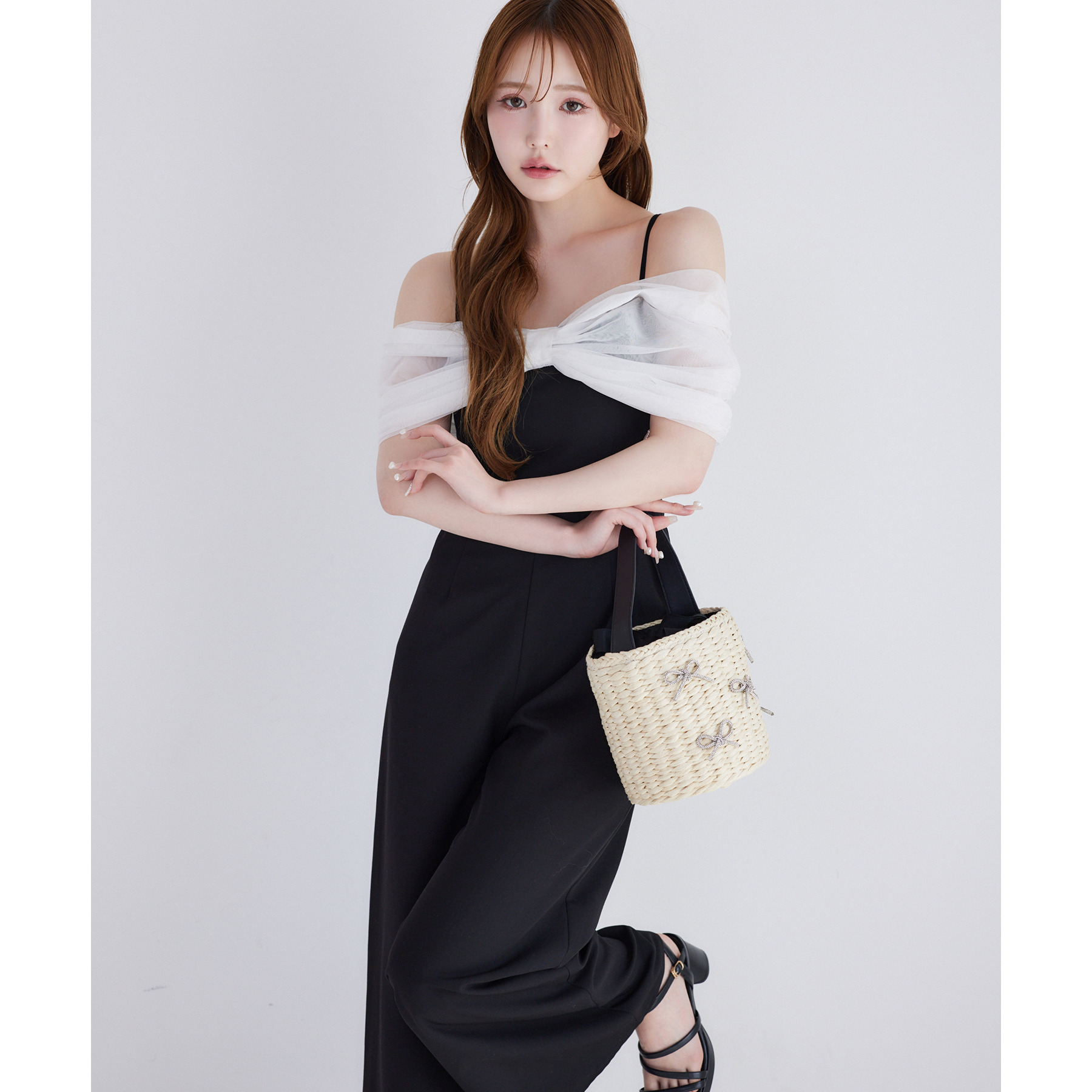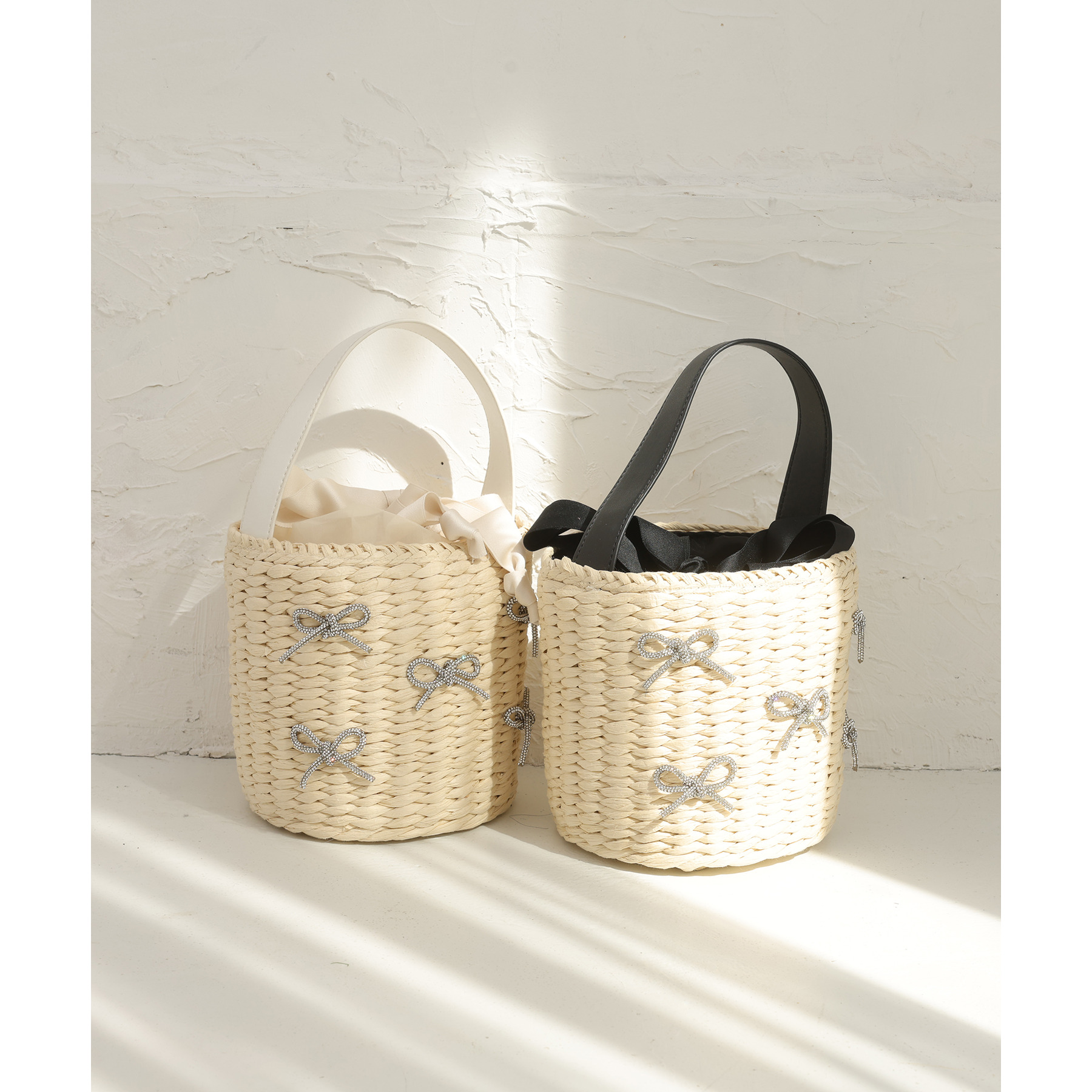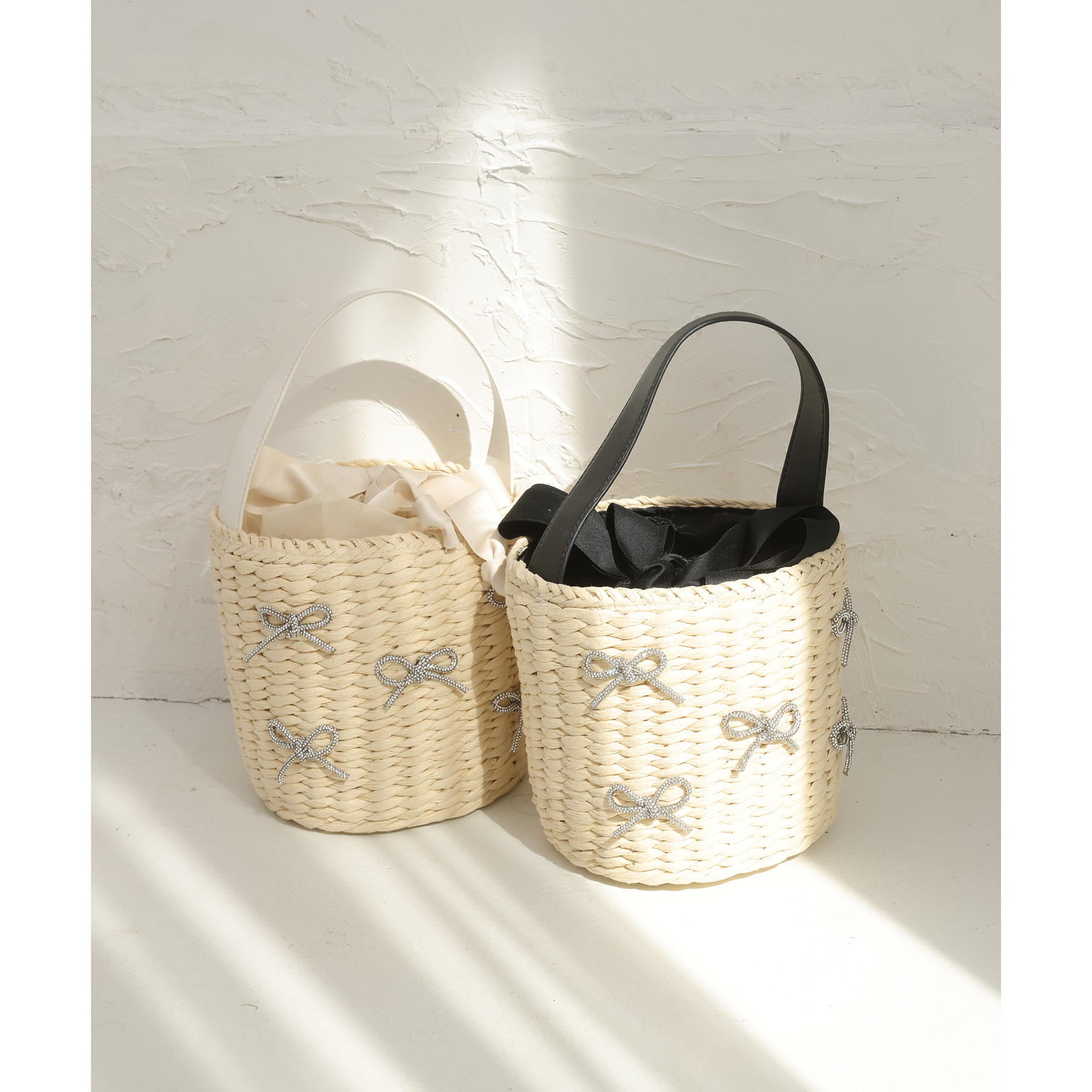 ナチュラルな風合いのカゴ素材に、キラキラ輝くリボンデザインが華やかさをプラス。