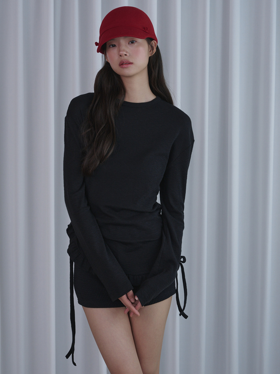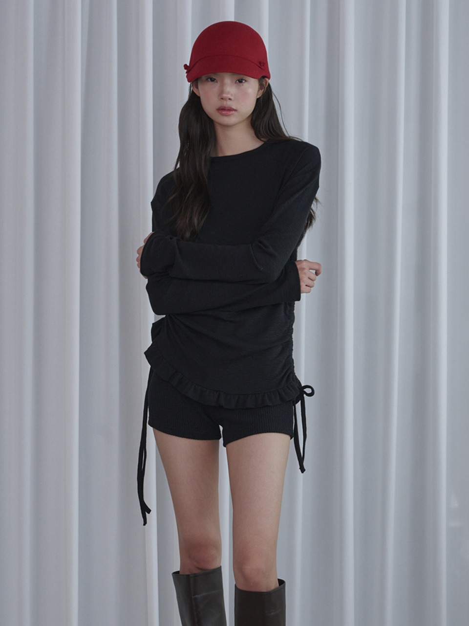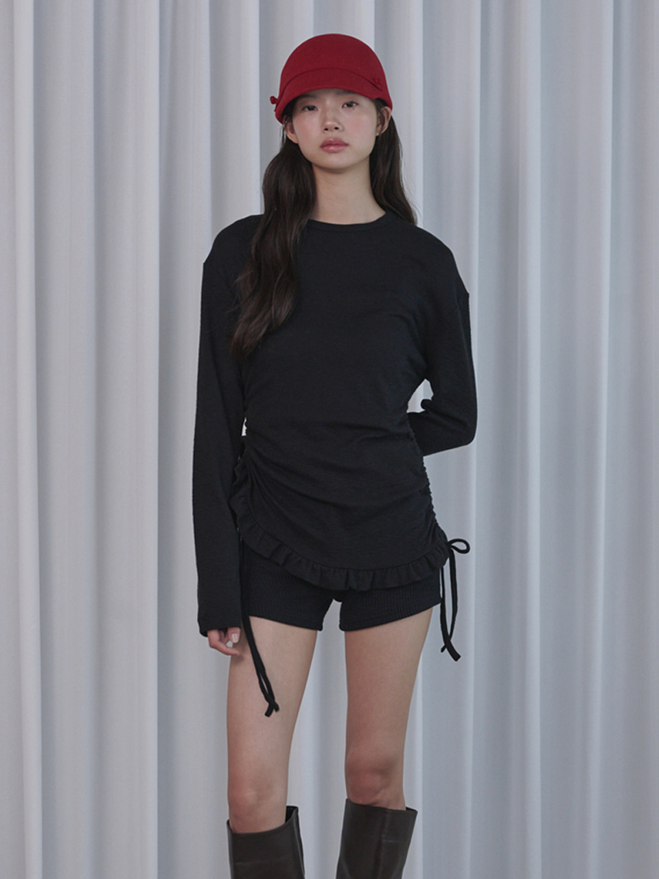 Side Shirring Frill Long Sleeve T-shirt_Black