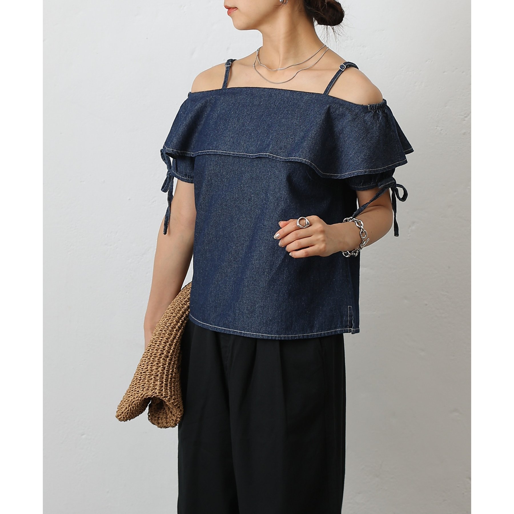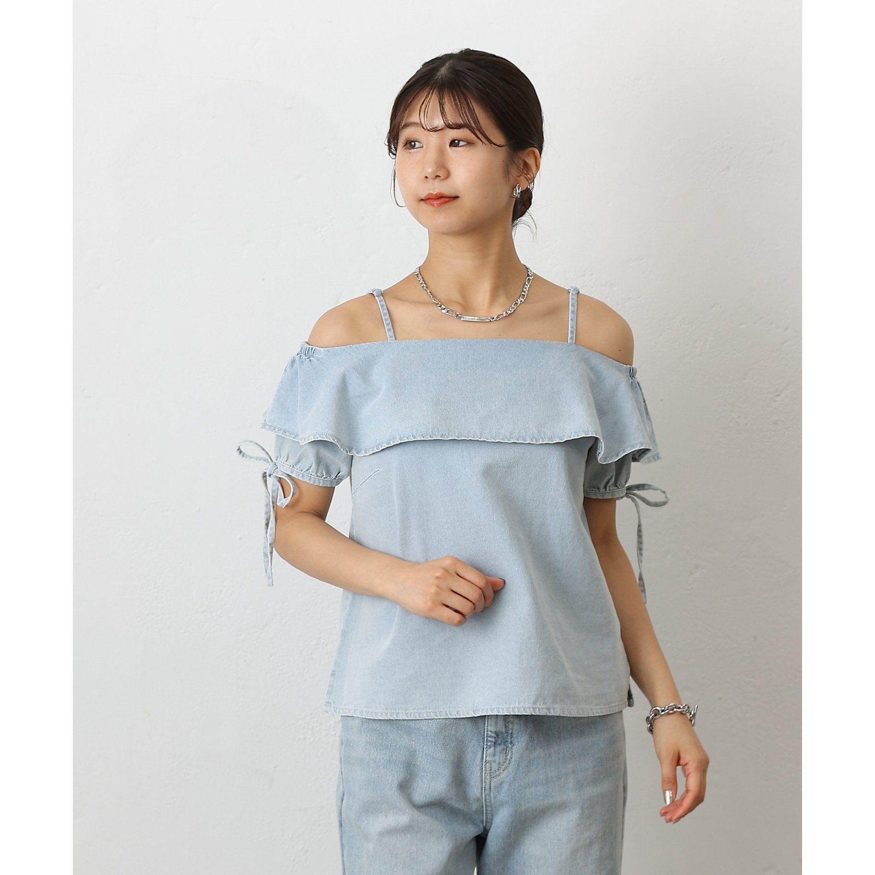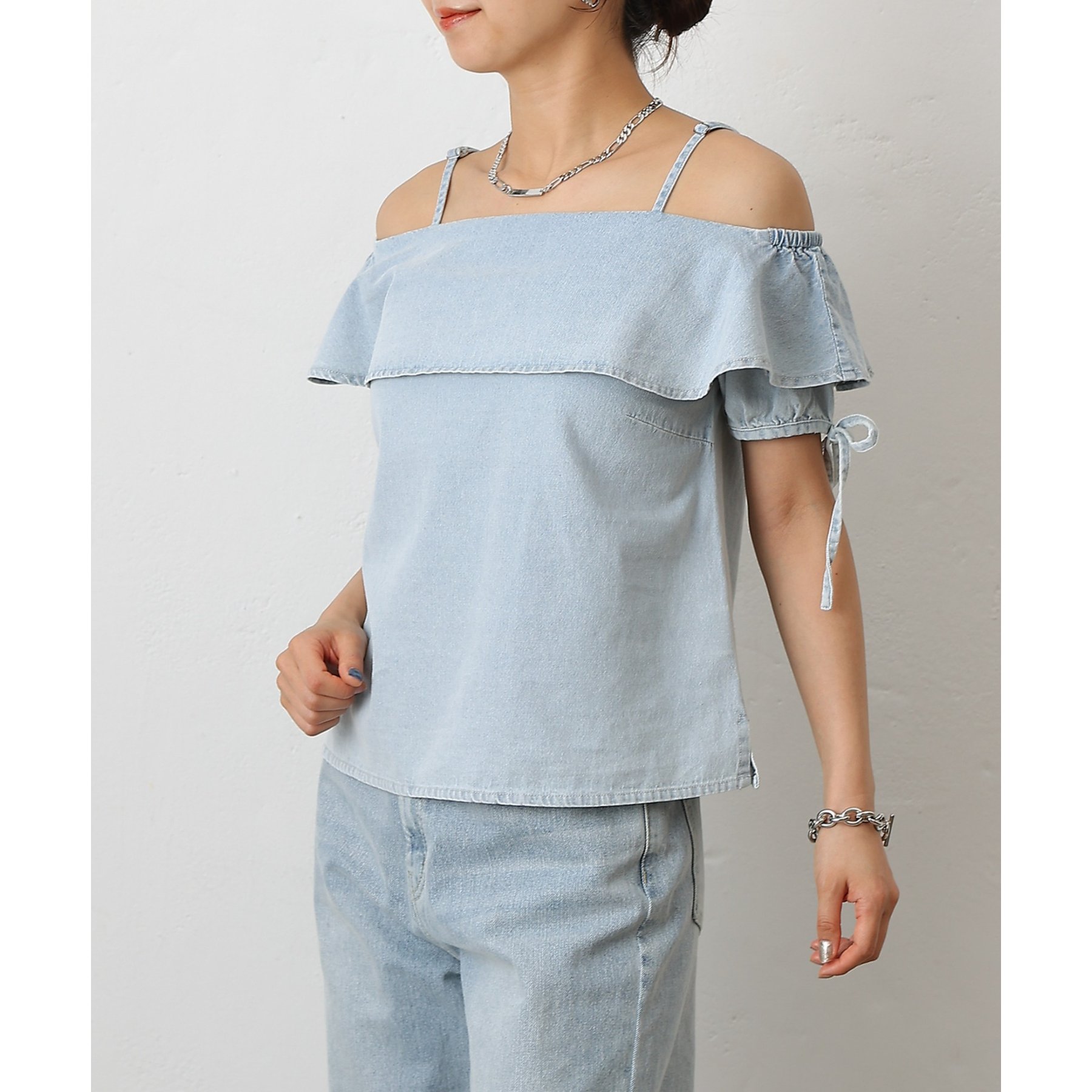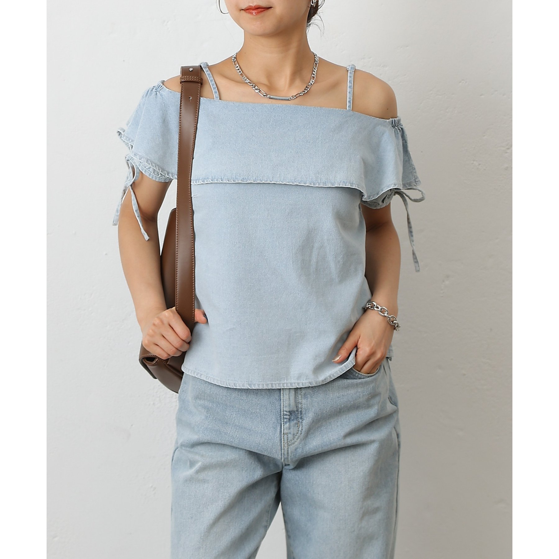 程よい肌見せで、ヘルシーな女性らしさを演出するライトオンスデニムのオフショルブラウス。