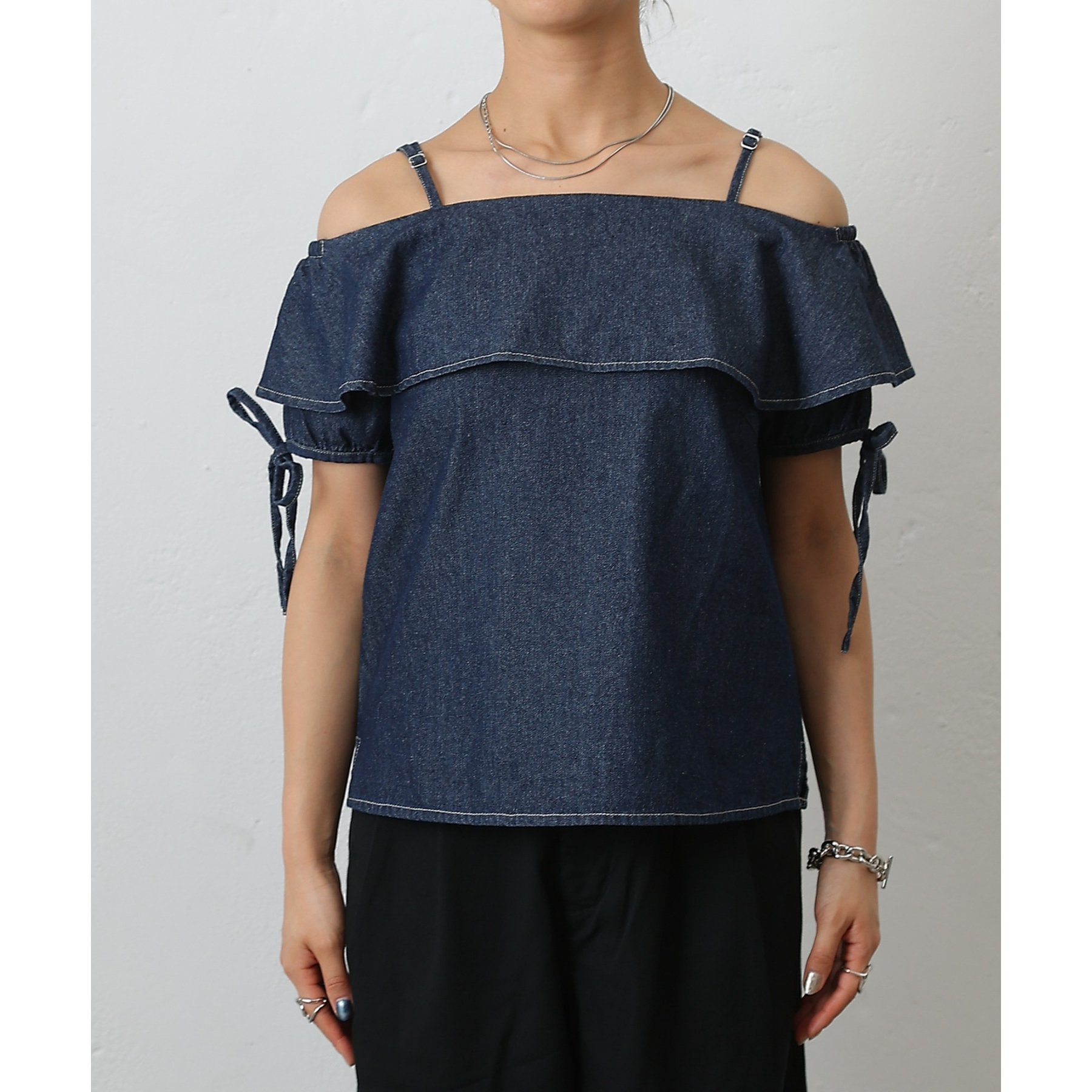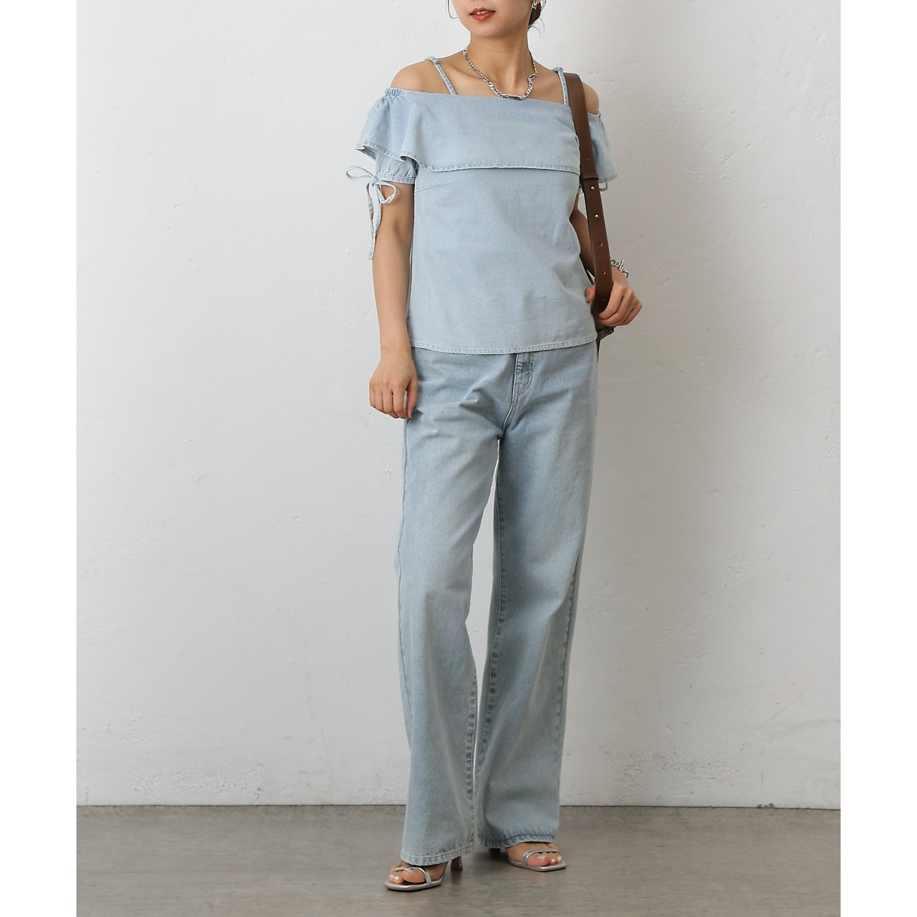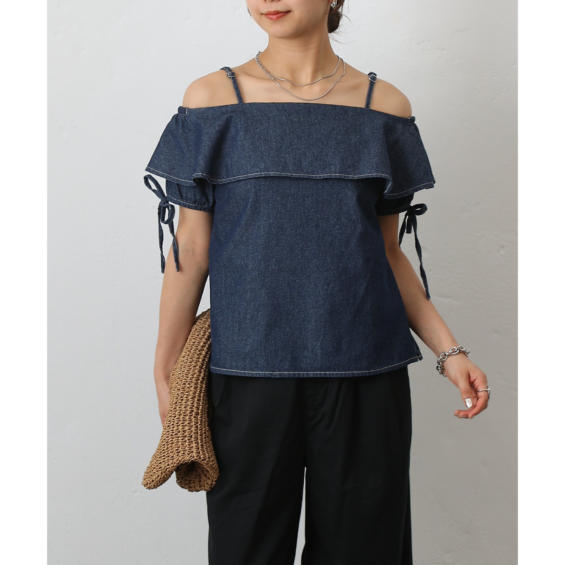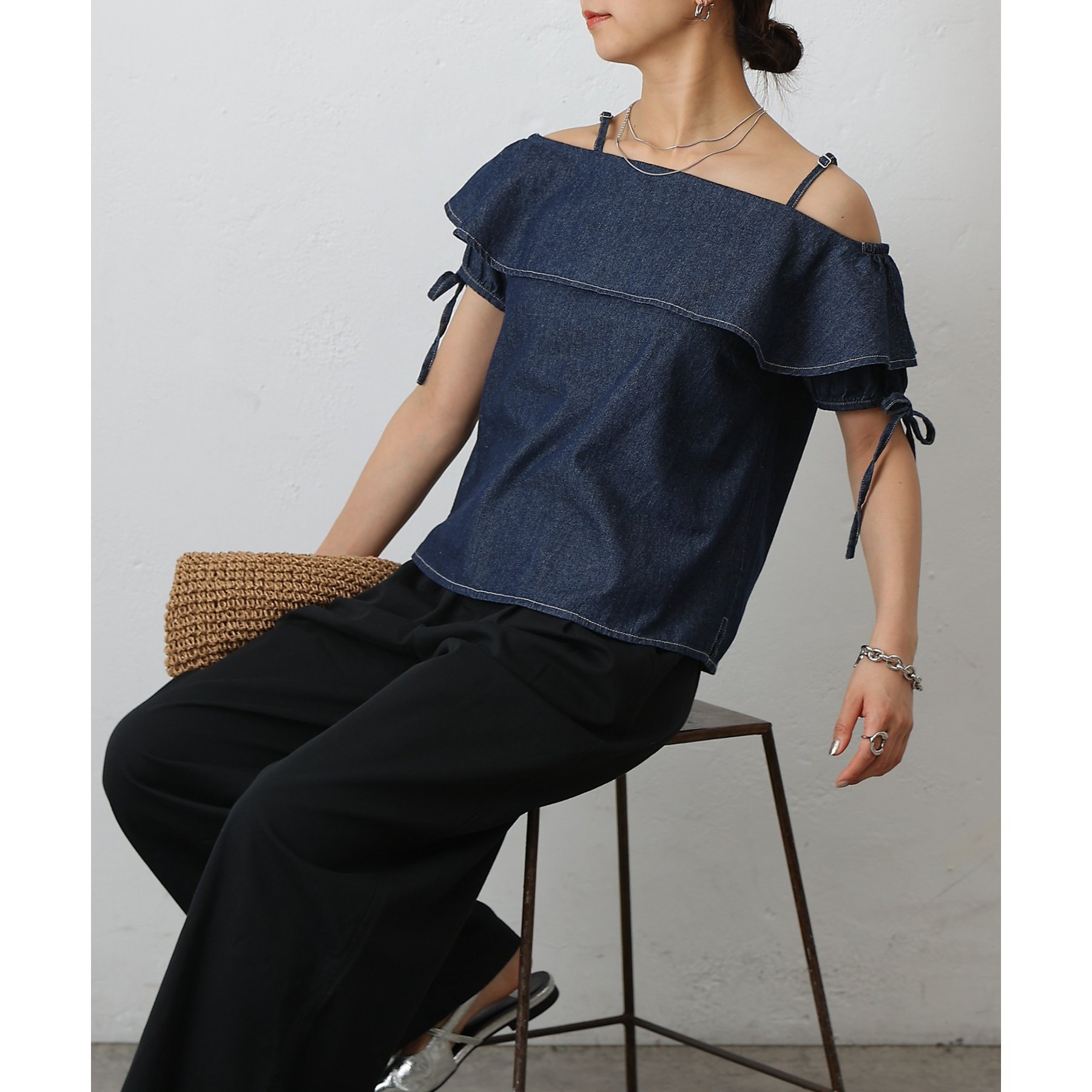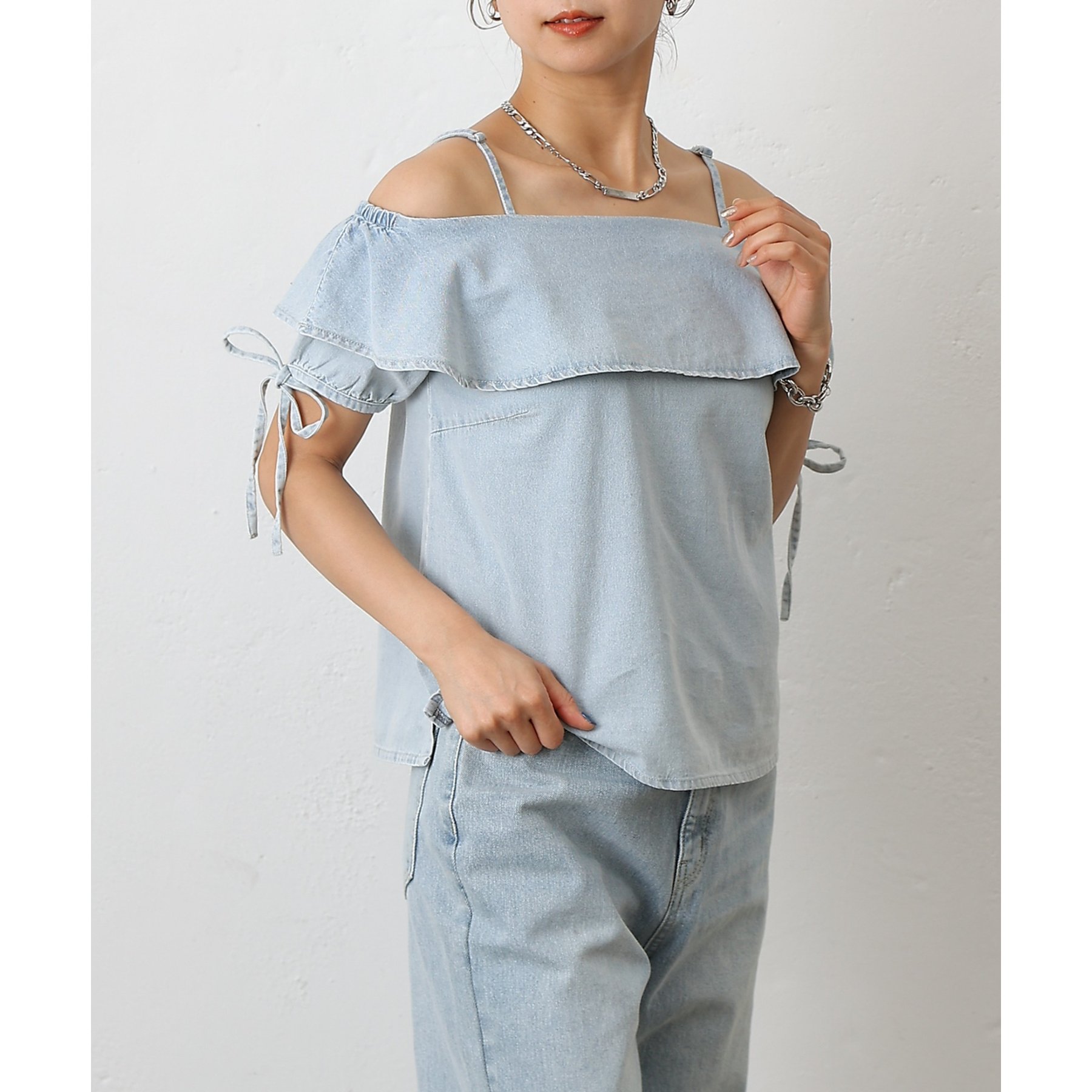 程よい肌見せで、ヘルシーな女性らしさを演出するライトオンスデニムのオフショルブラウス。