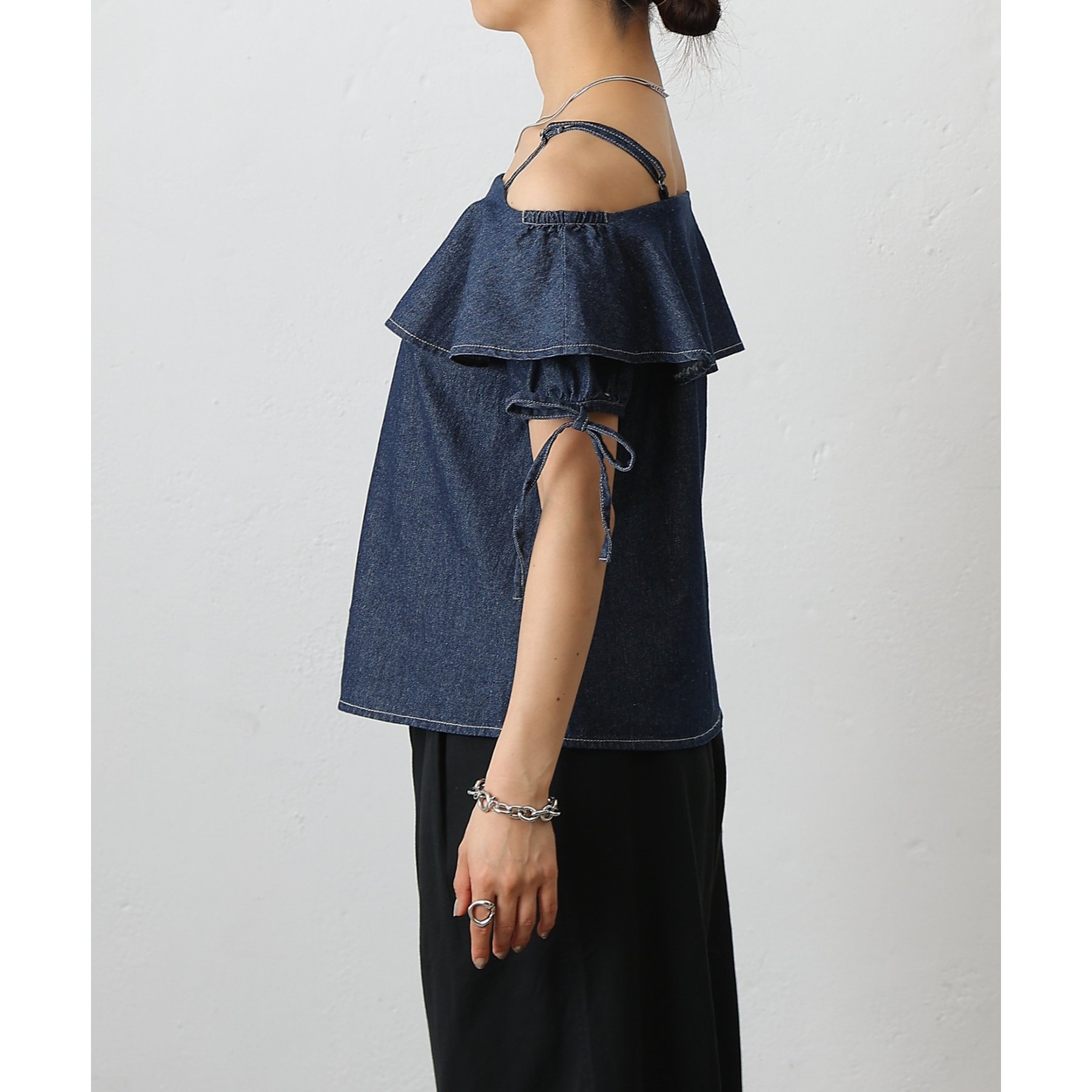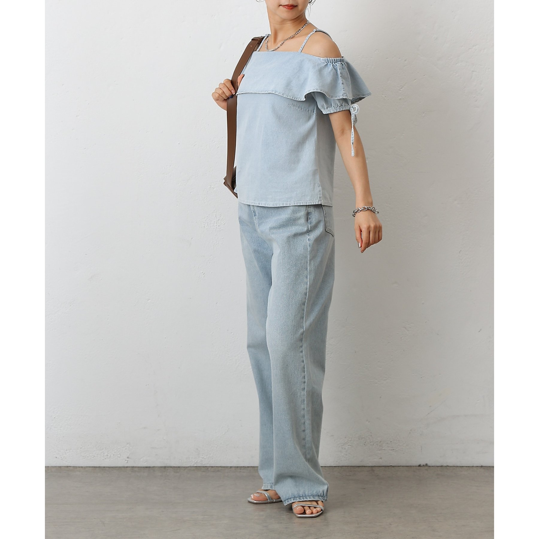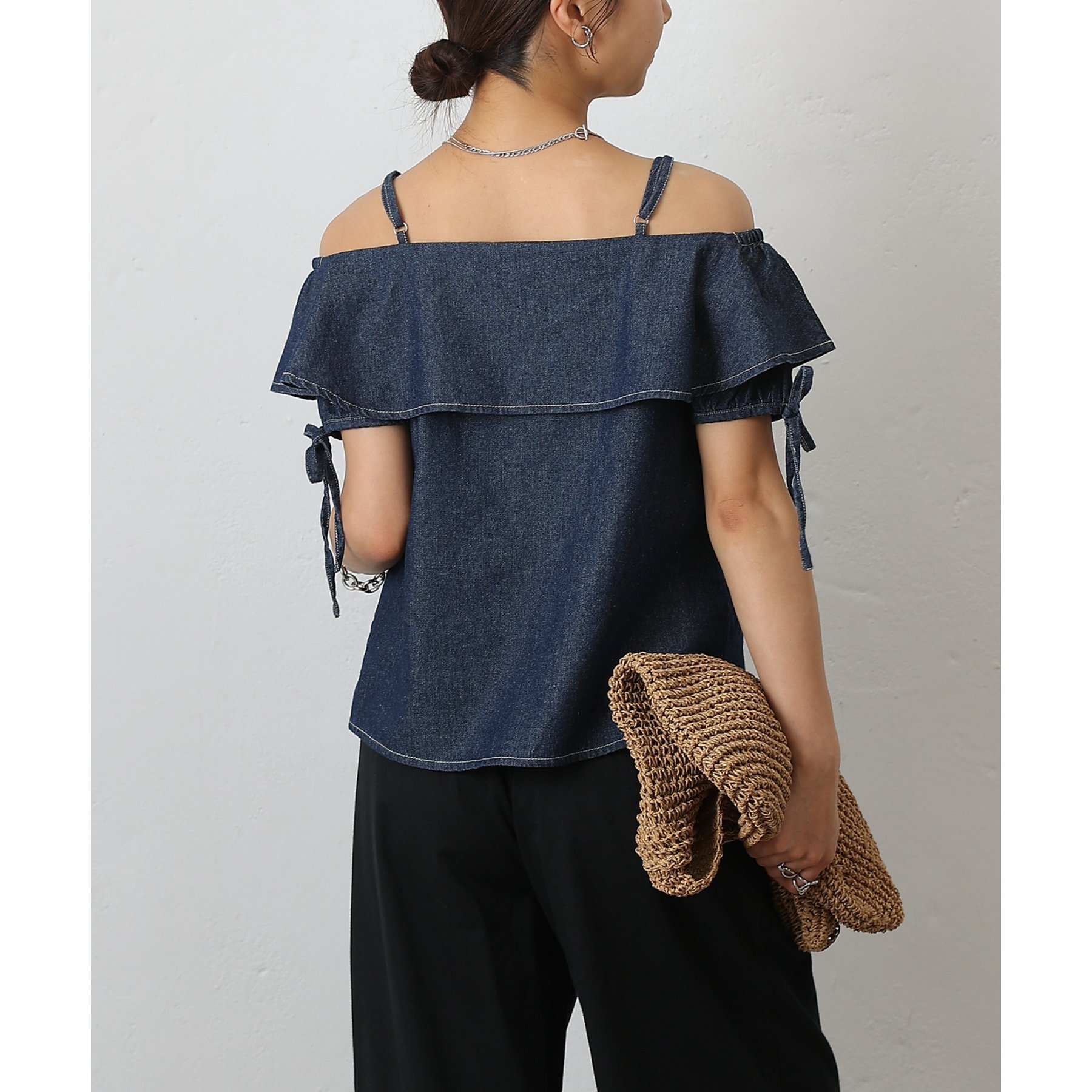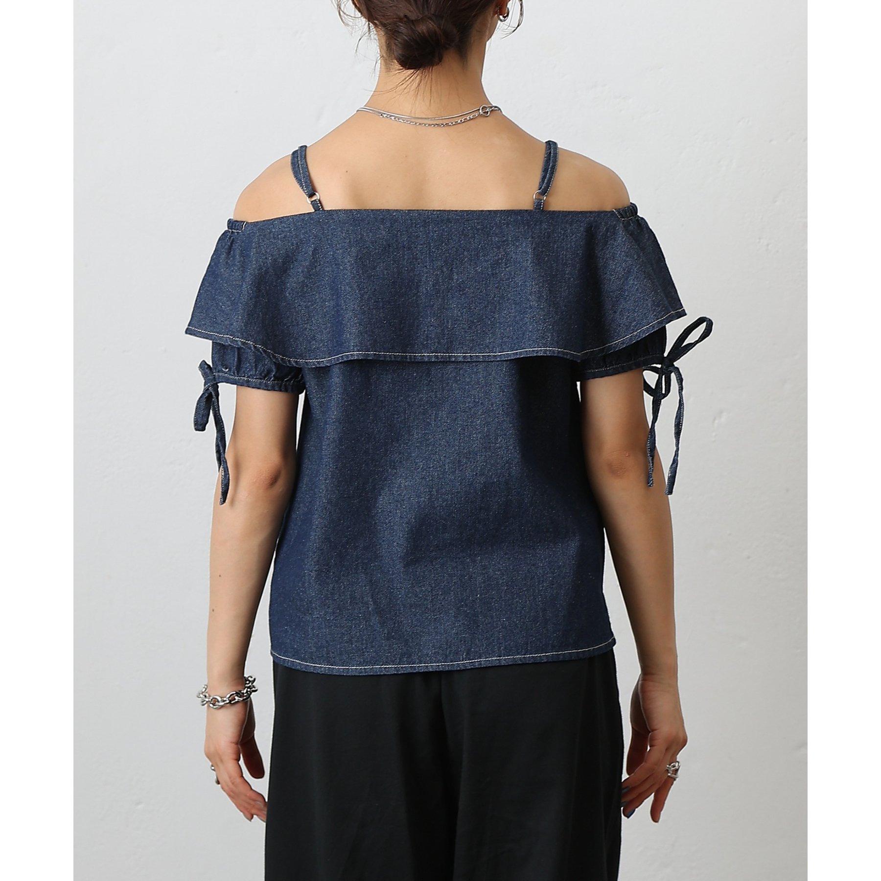 程よい肌見せで、ヘルシーな女性らしさを演出するライトオンスデニムのオフショルブラウス。