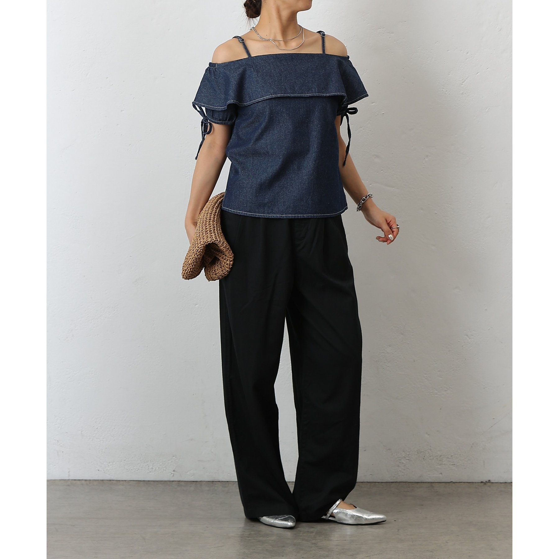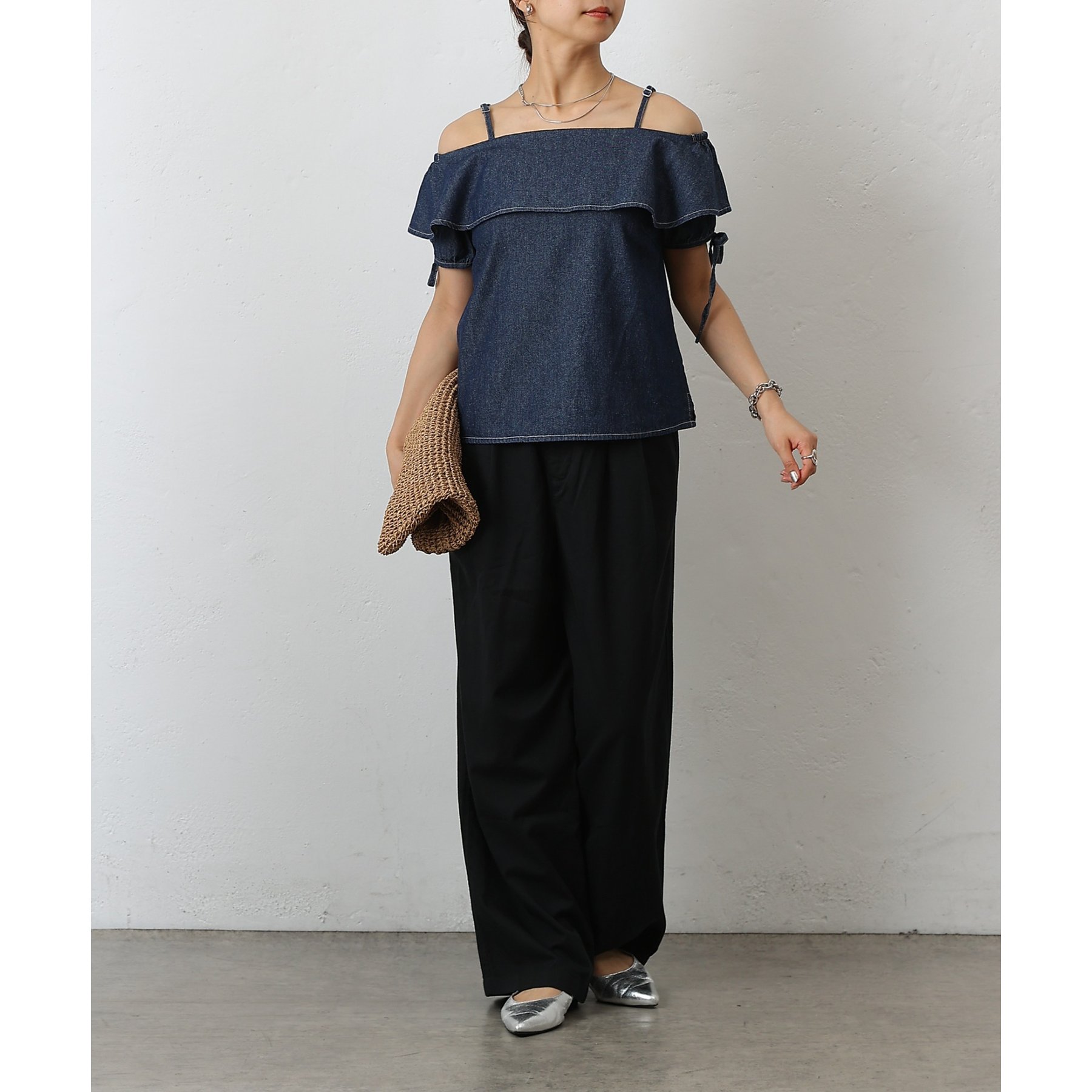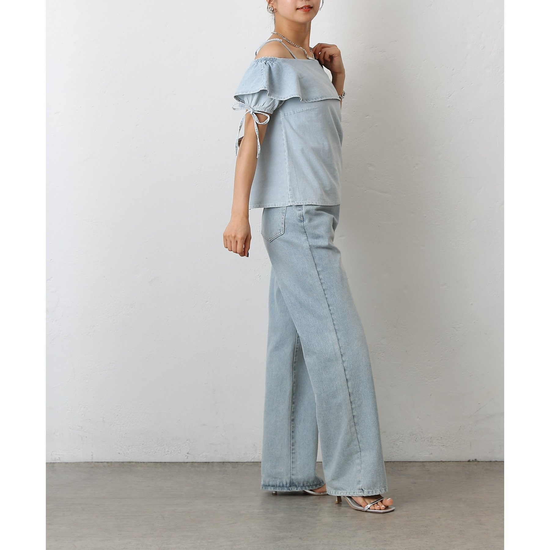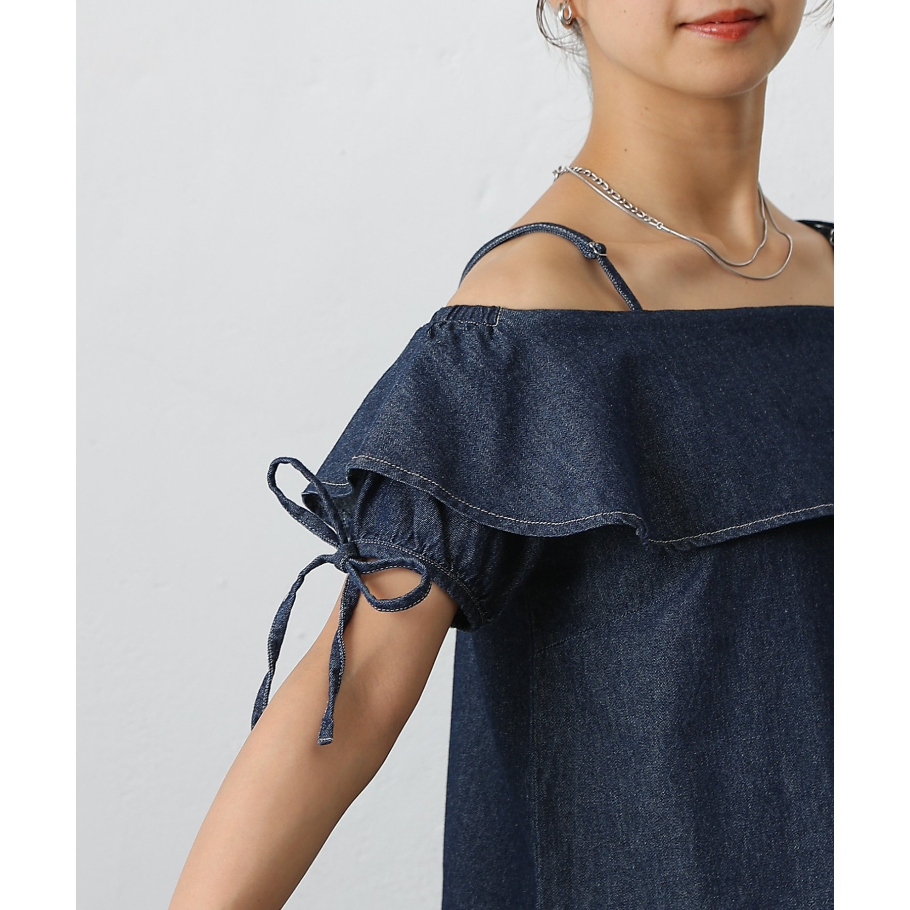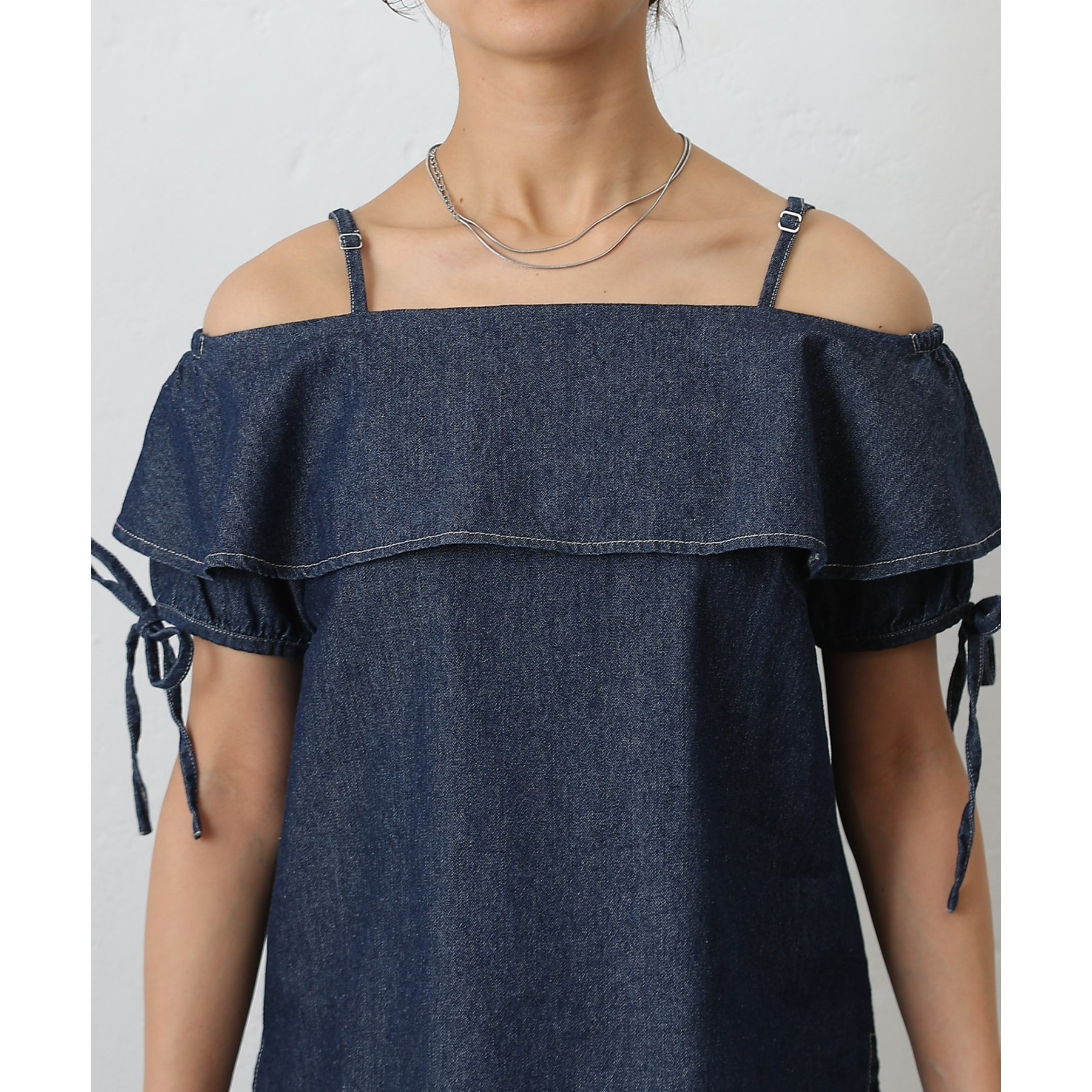 程よい肌見せで、ヘルシーな女性らしさを演出するライトオンスデニムのオフショルブラウス。