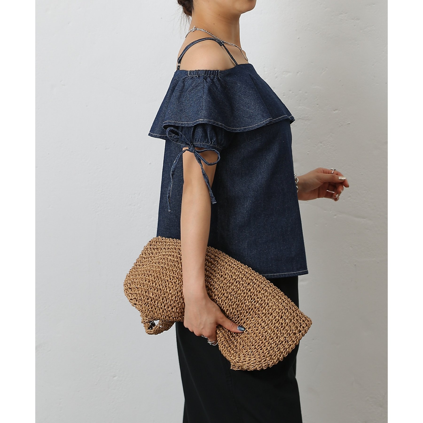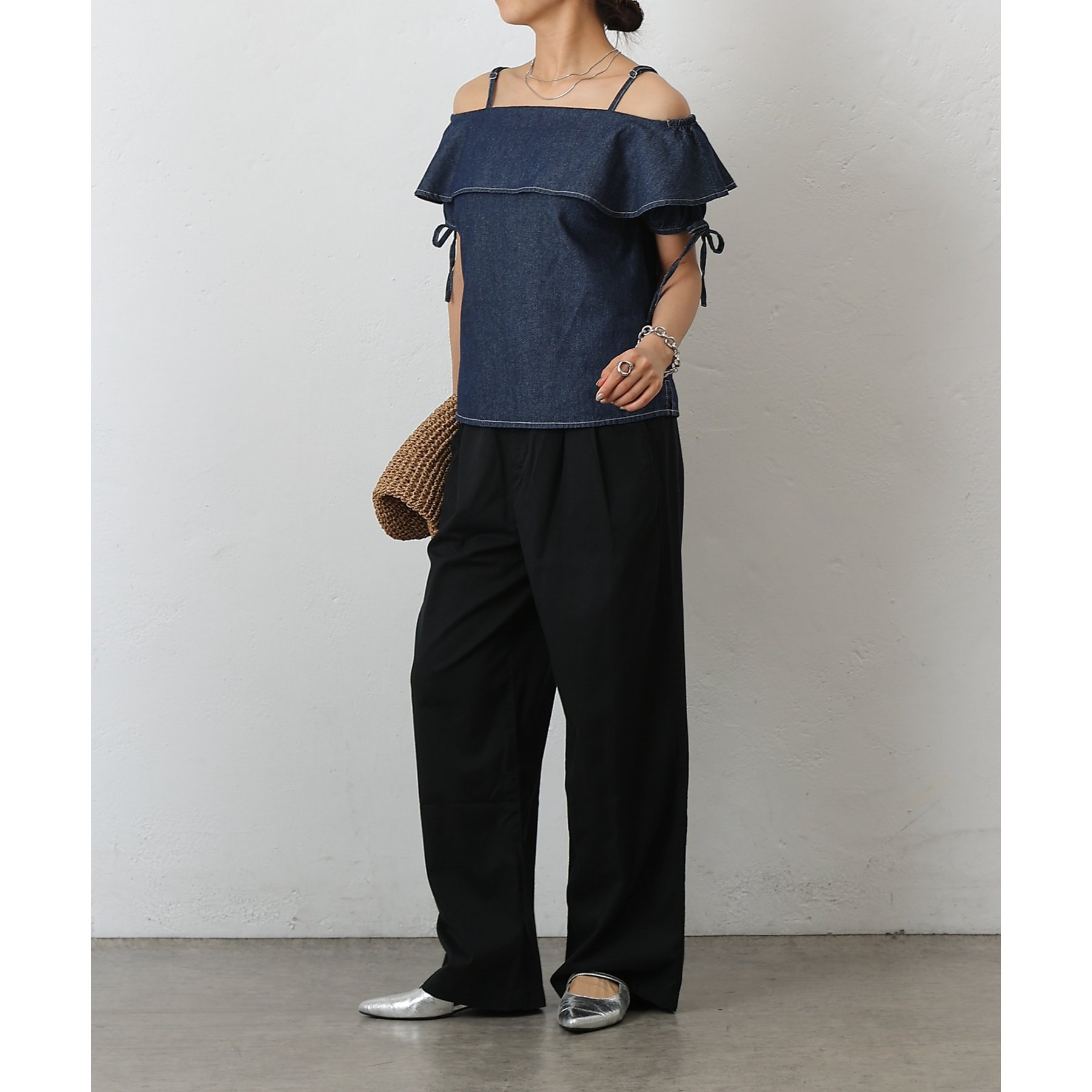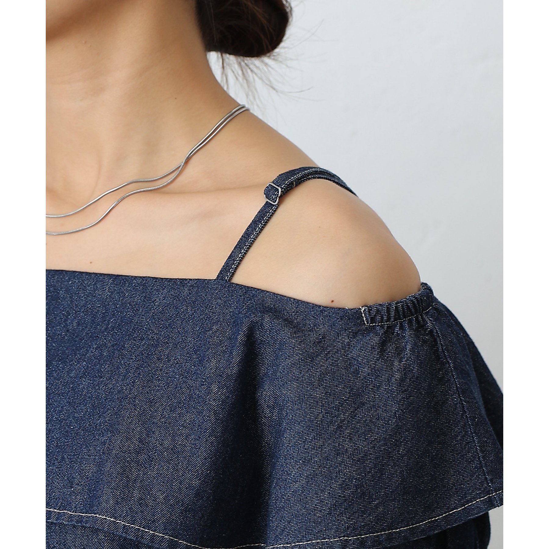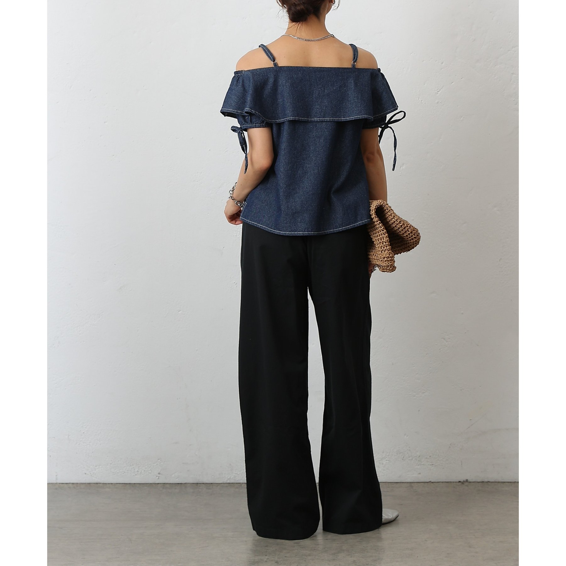 程よい肌見せで、ヘルシーな女性らしさを演出するライトオンスデニムのオフショルブラウス。
