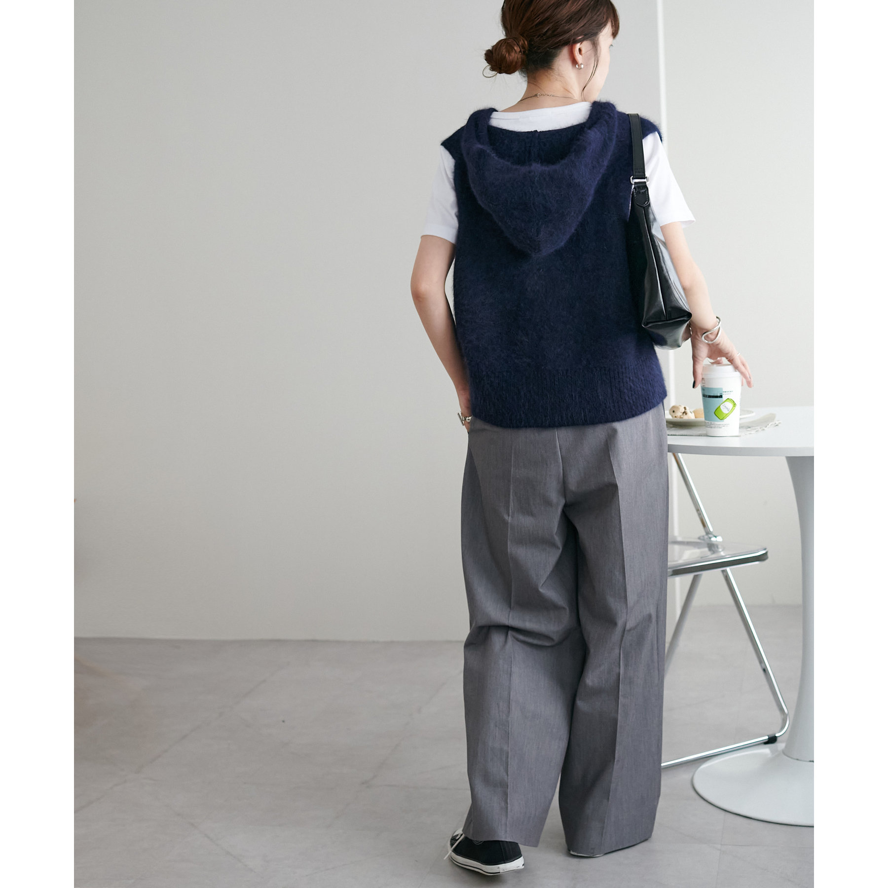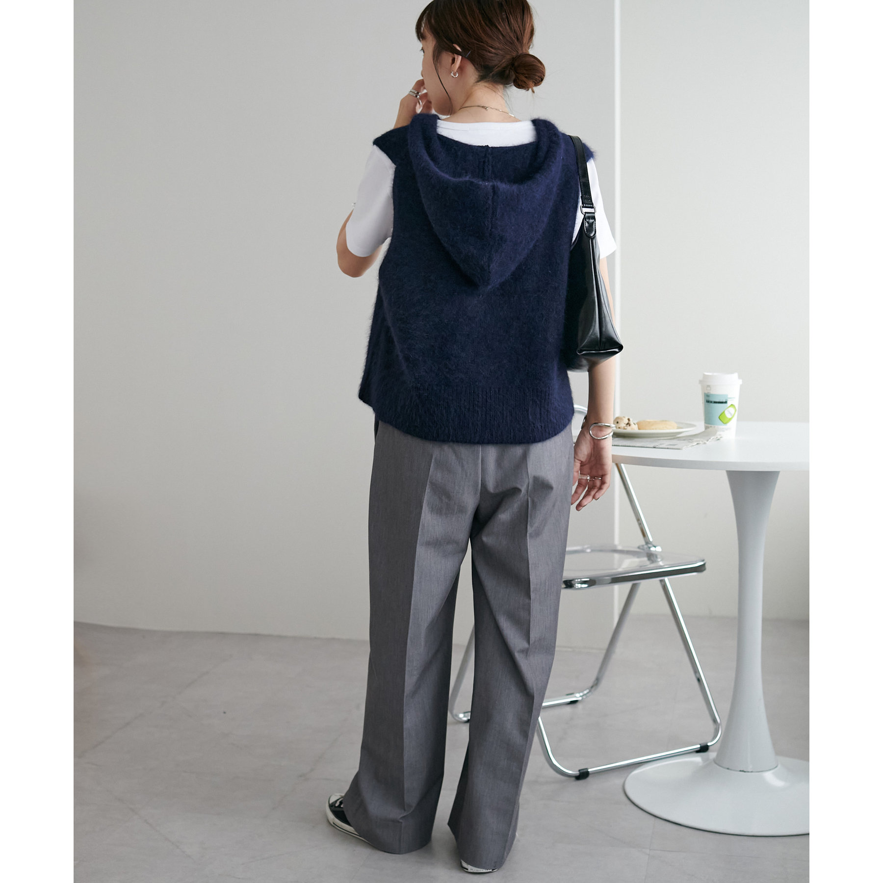 フードがあることでカジュアルダウンが叶い、後ろ姿もおしゃれに決まります!生地ならではのくたっと感もポイント!