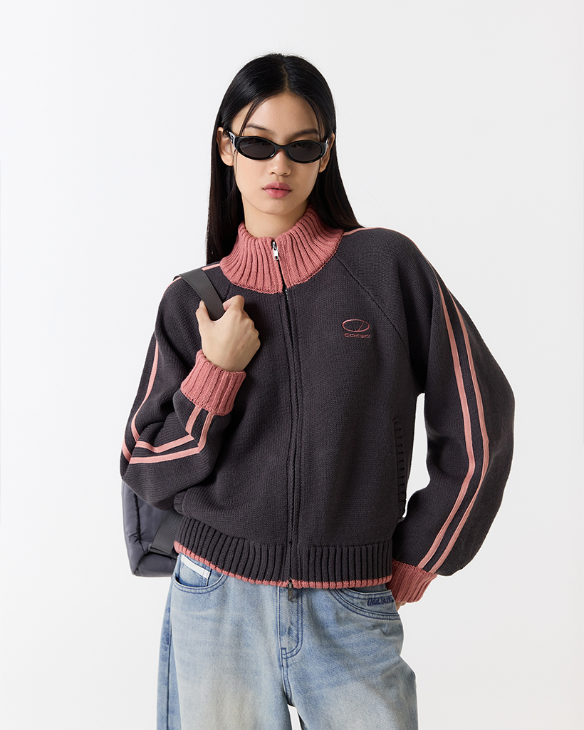 [K-POPアイドル着用] Sporty Track Semi Crop Knit Zip-Up - CHARCOAL