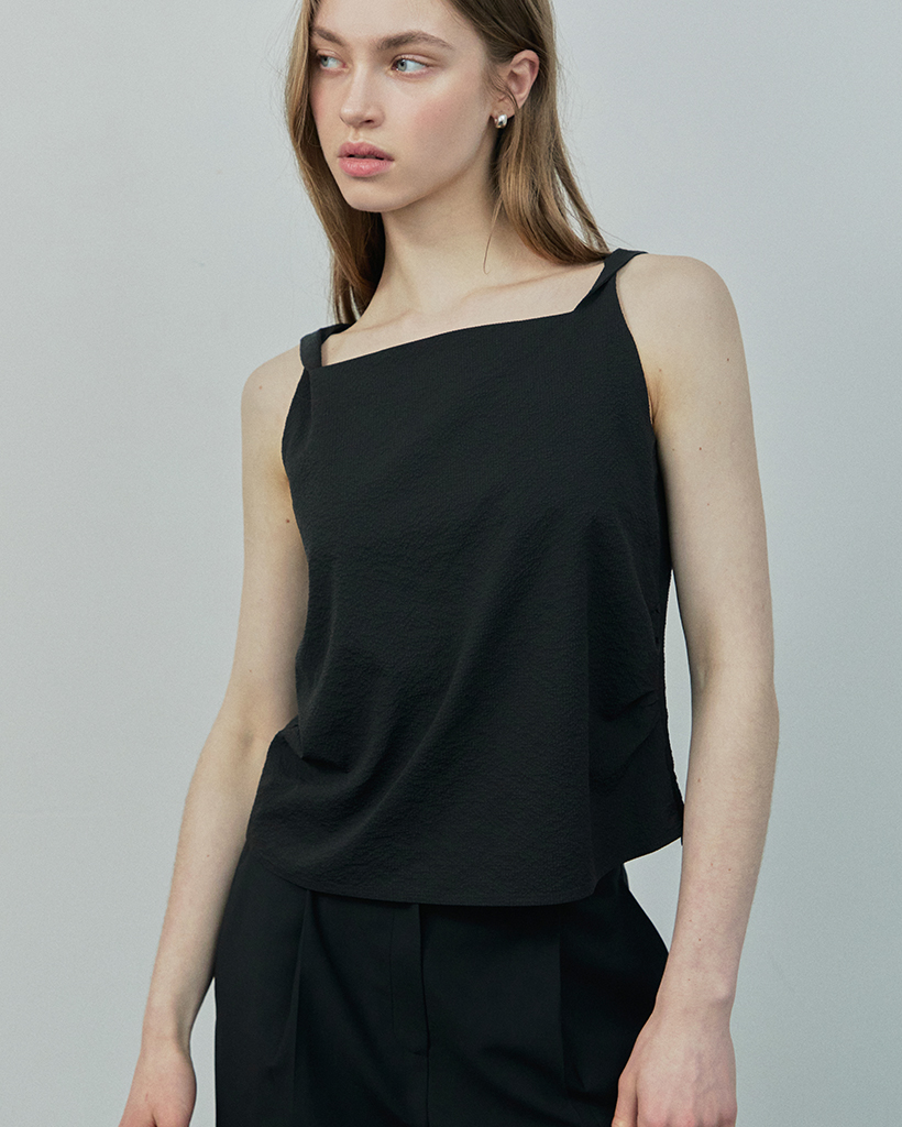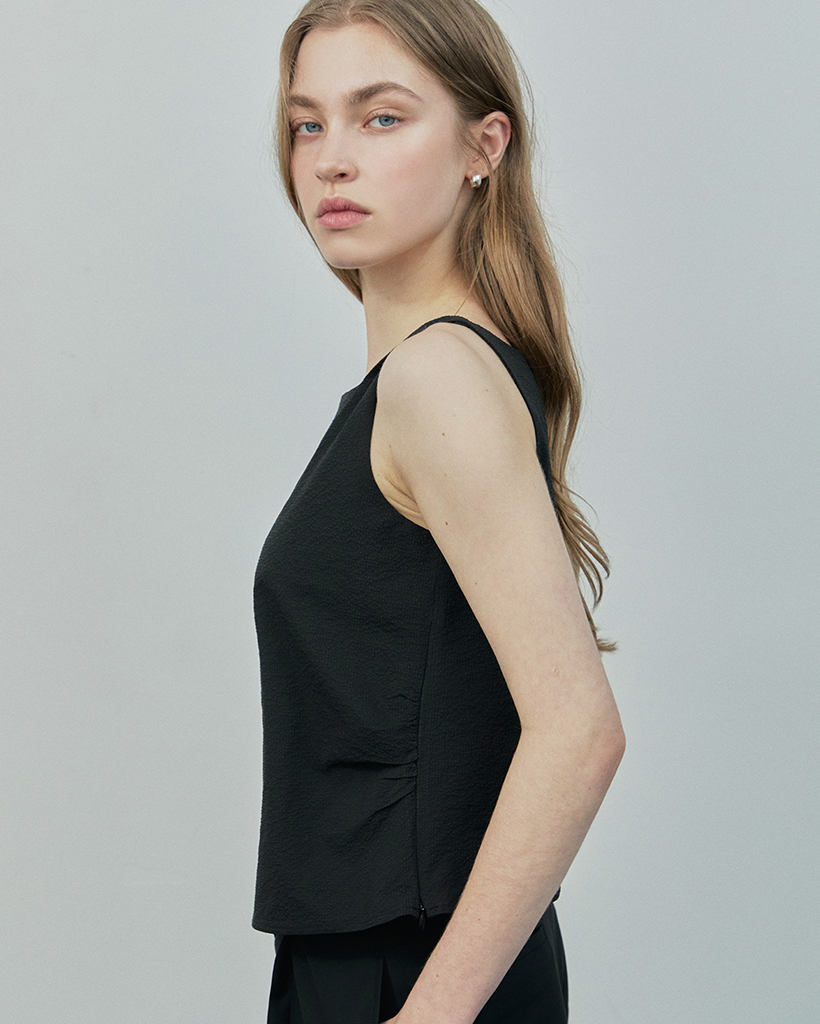 -肩のツイストデザインとサイドのシャーリングが特徴のノースリーブブラウスです。