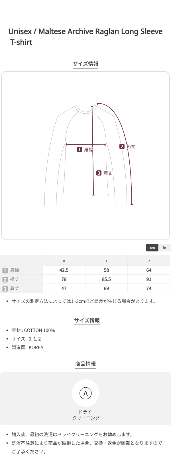 Maltese Archive Raglan Long Sleeve T-shirtは女性フィット(0サイズ)とユニセックスフィット(1,2サイズ)となっております。