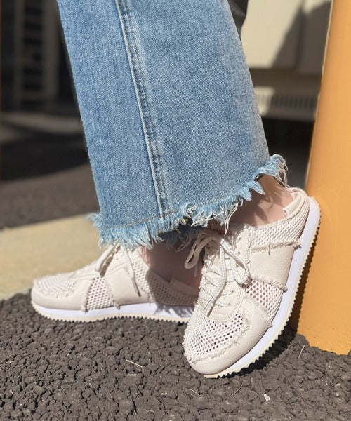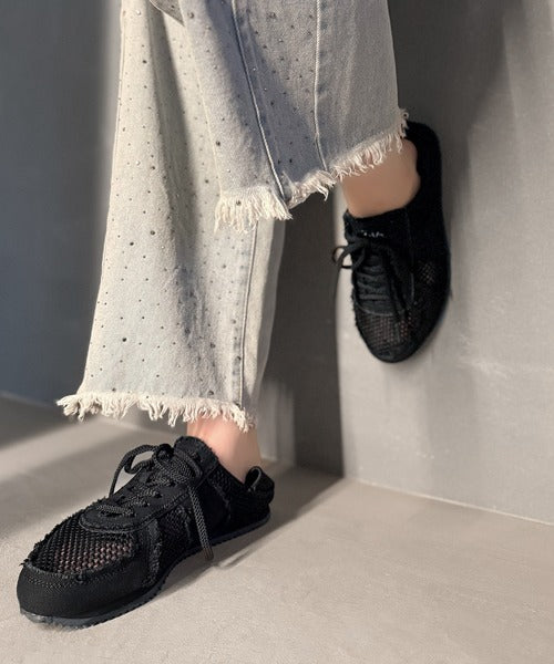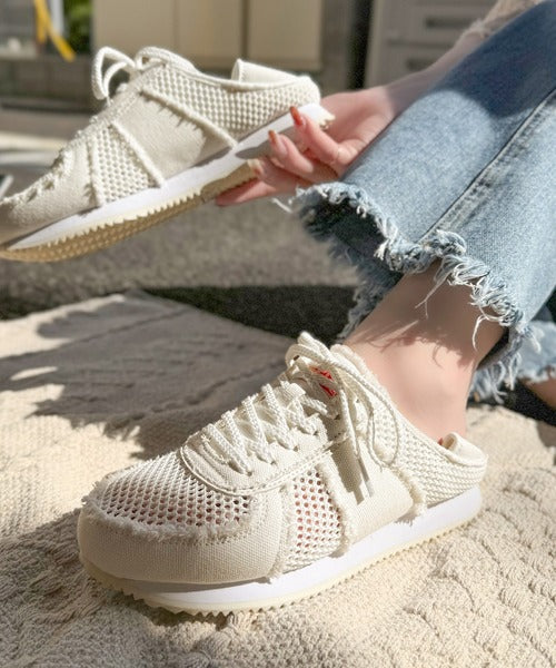 通気性のあるメッシュ素材とフリンジ生地で足当たりが柔らかく、