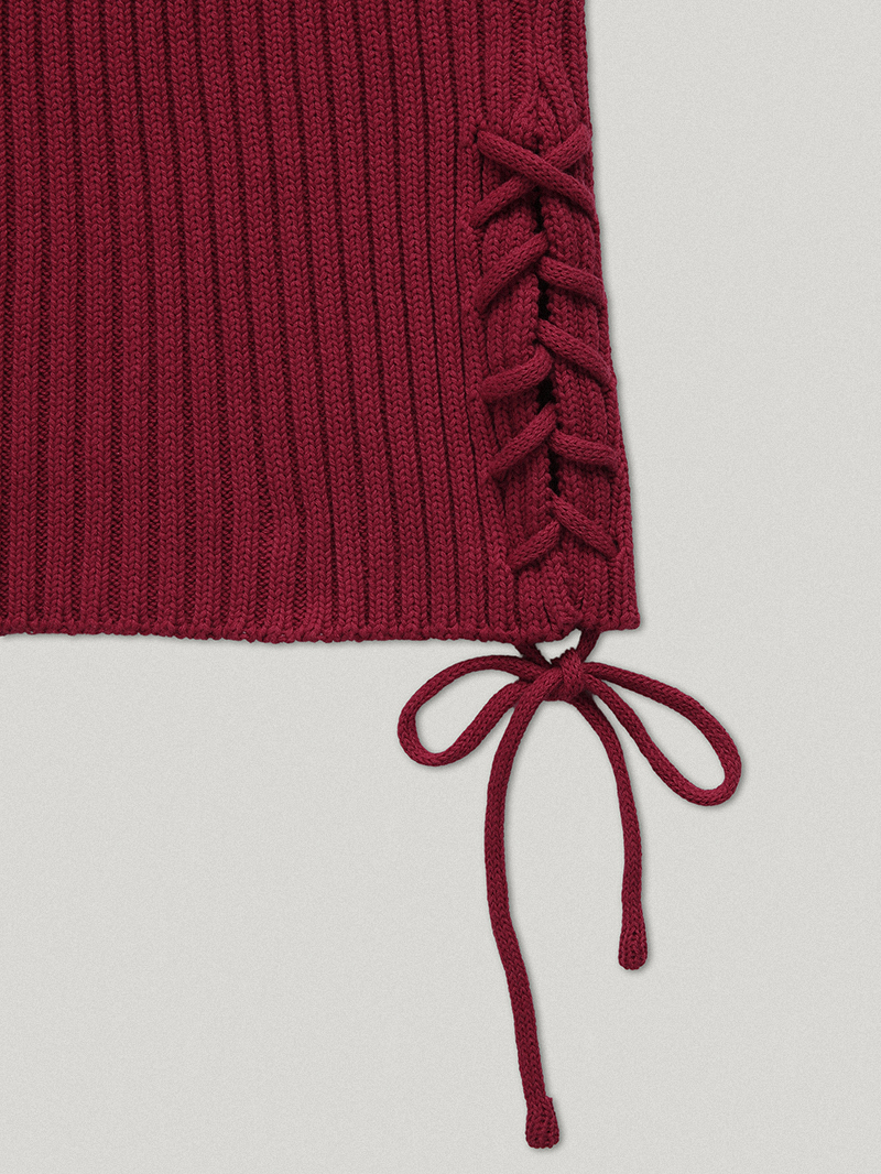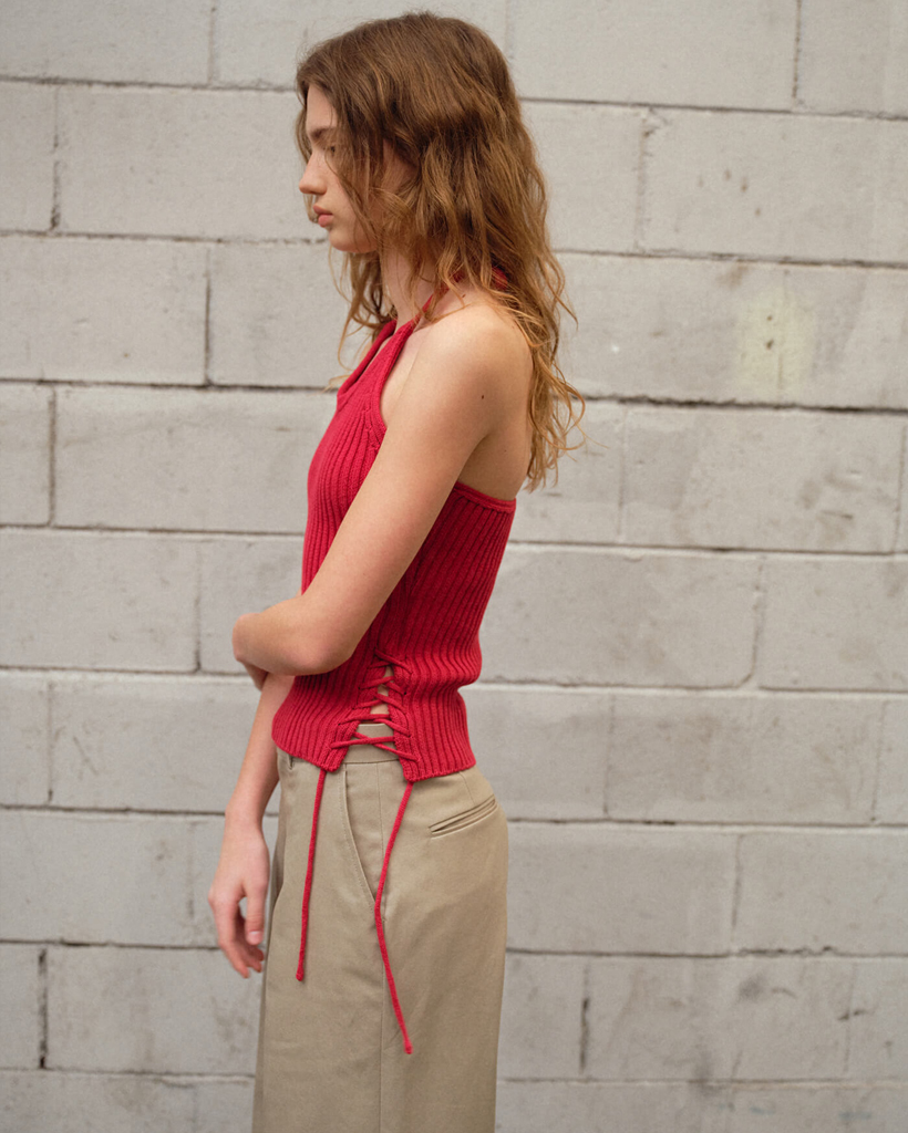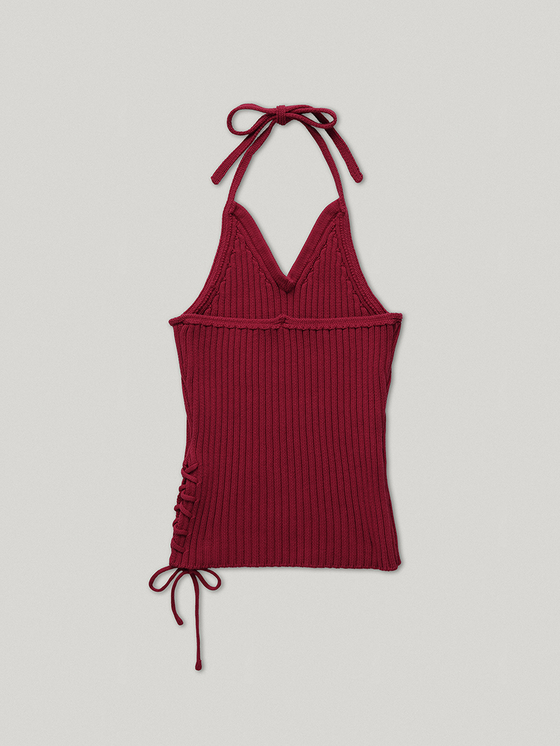目を引く官能的なホルターデザインレジンホルターネックニットこれは100%綿の丈夫なコットン糸で作られたニットトップで、体のラインをしっかりと保つのにちょうど良い太さがあります。大胆なリブ編みでボディラインを立体的に表現し、体にフィットするシルエットをより美しく表現します。ハルターラインはストラップで自由に調整でき、左側にはレースアップのディテールが焦点となります。ホルターネックとバッグレスデザインは単独で着用でき、内側のTシャツと重ね合わせも可能です。落ち着いた深い赤の魅力的なルビーカラーで、スリムフィットのニットレースアップディテール