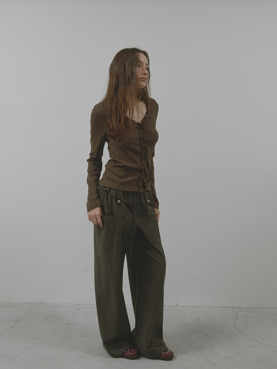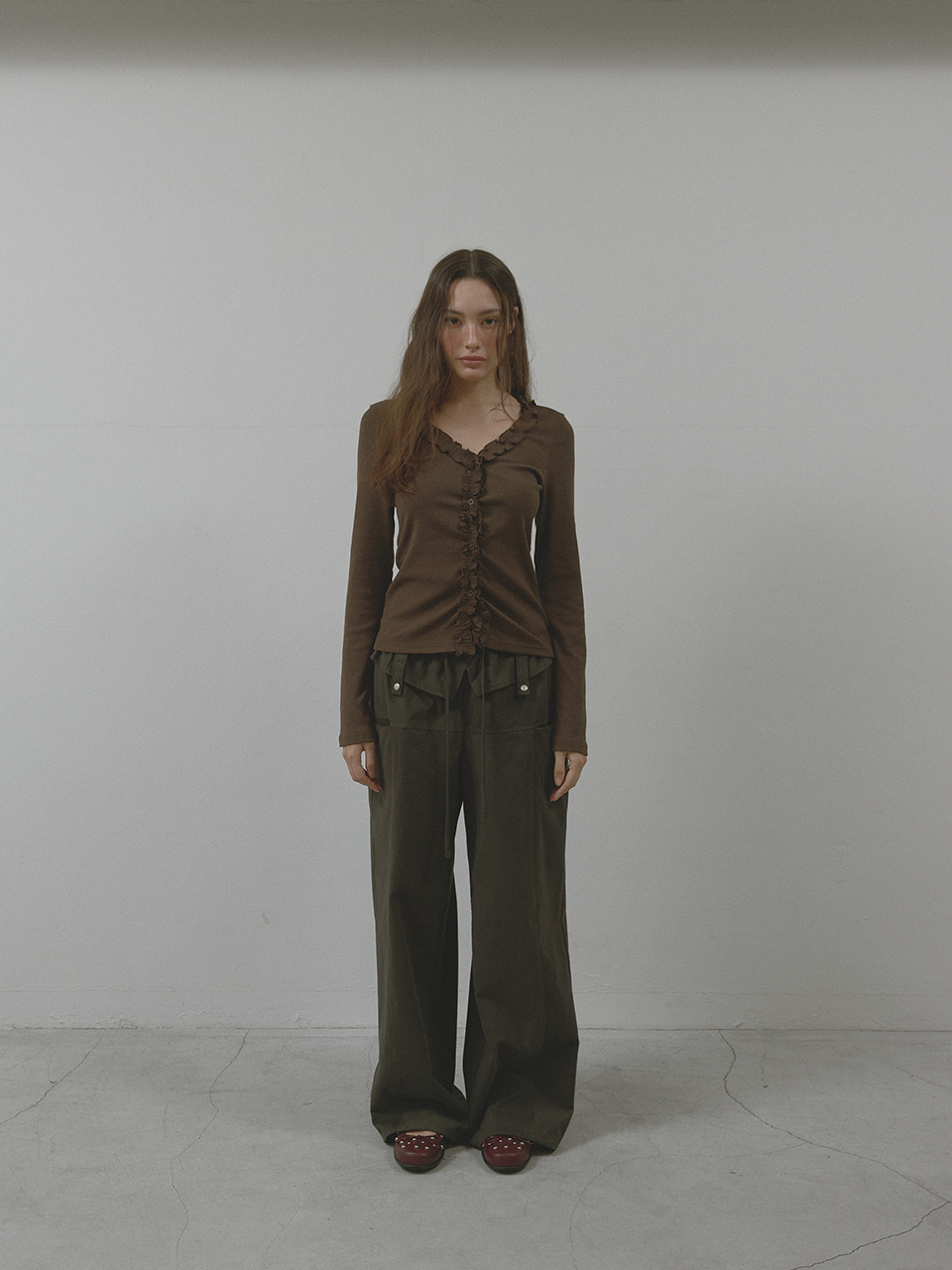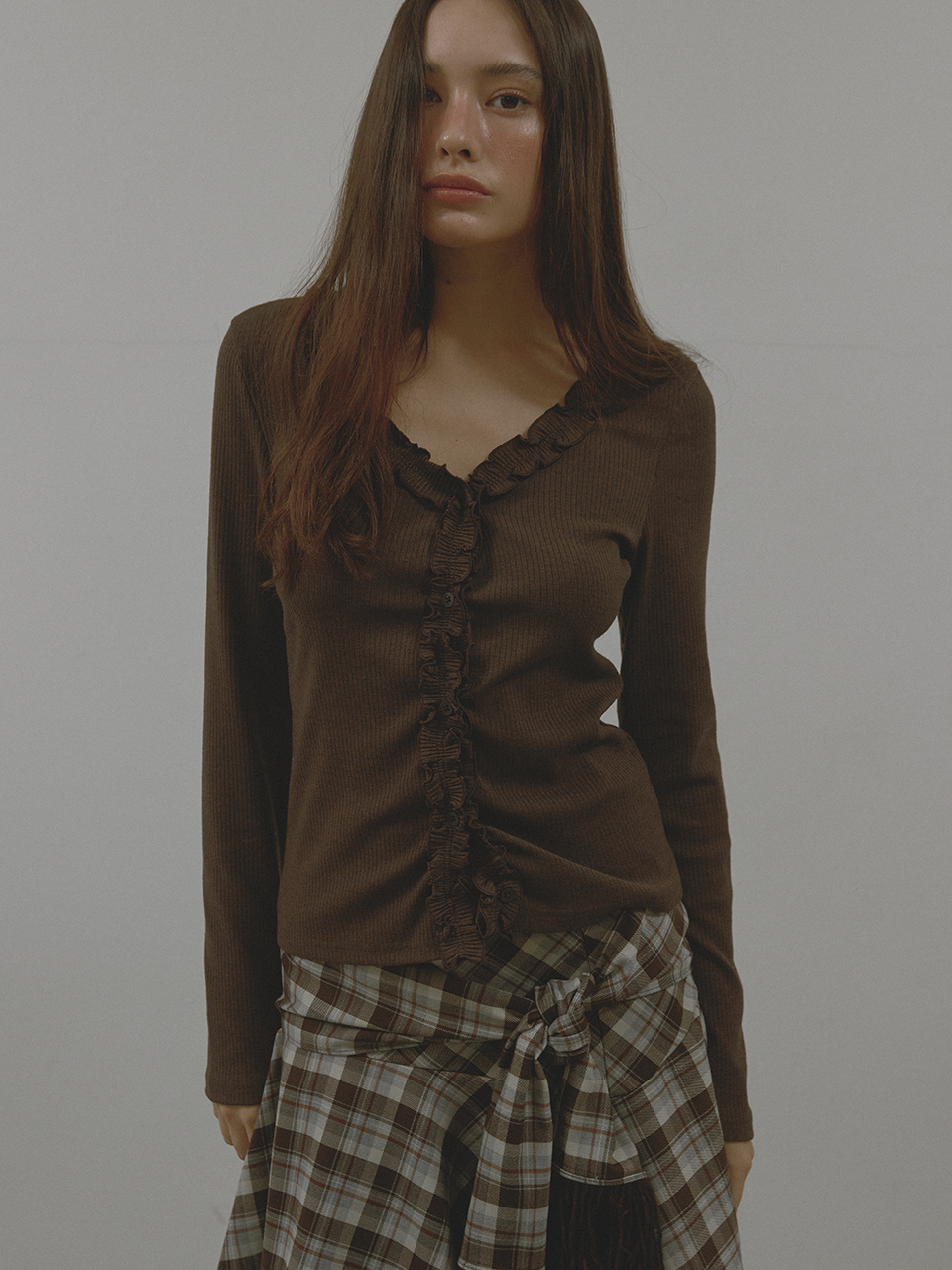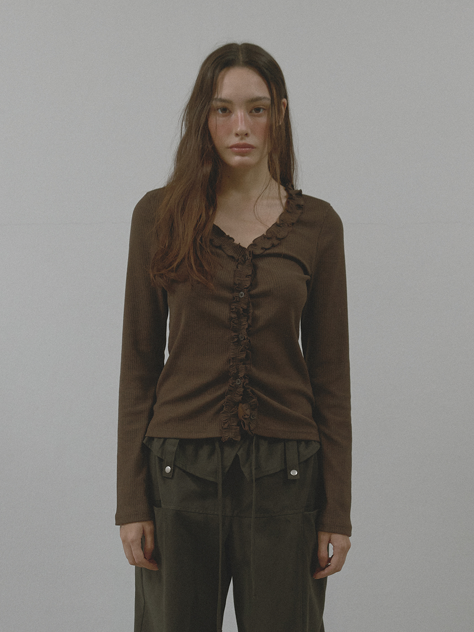 [K-POPアイドル着用] FRILL BUTTON CARDIGAN (BROWN)