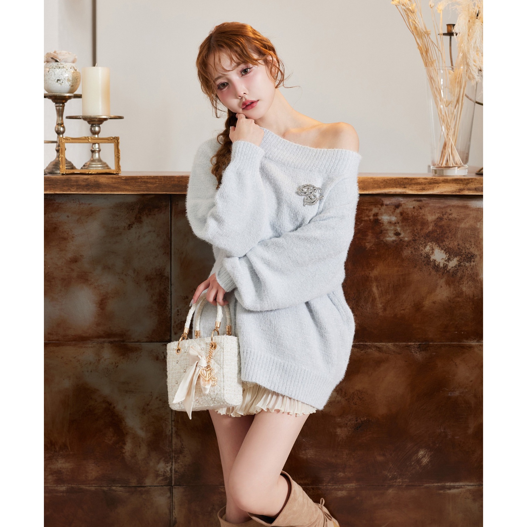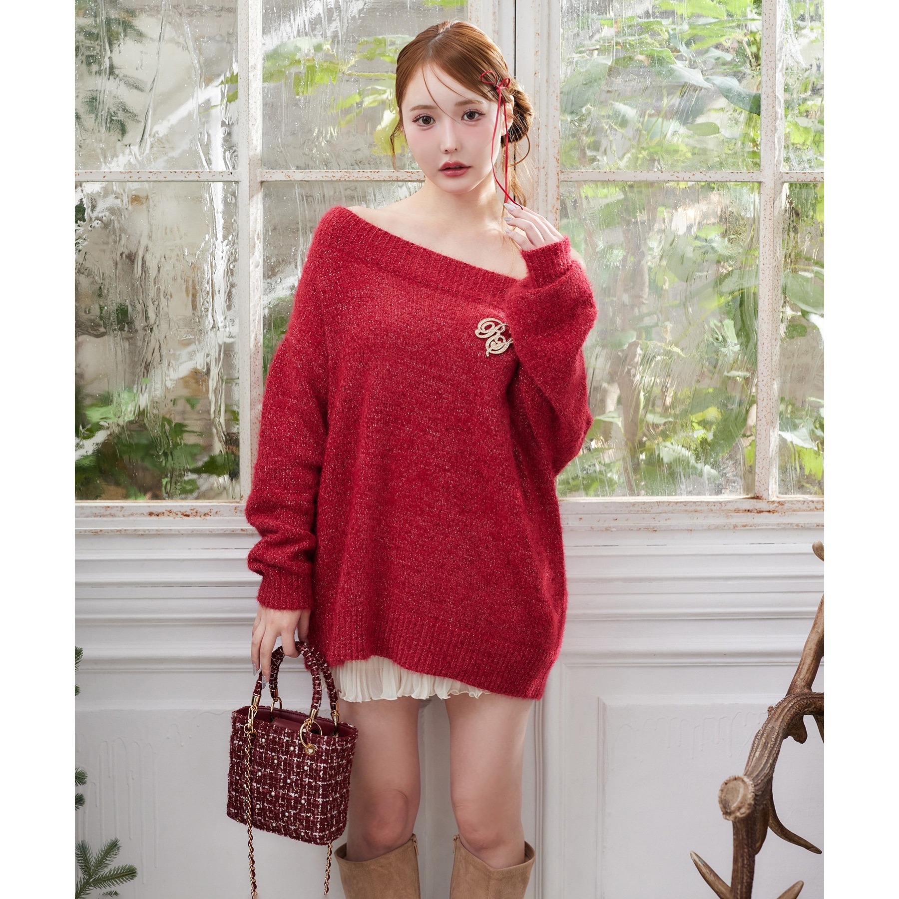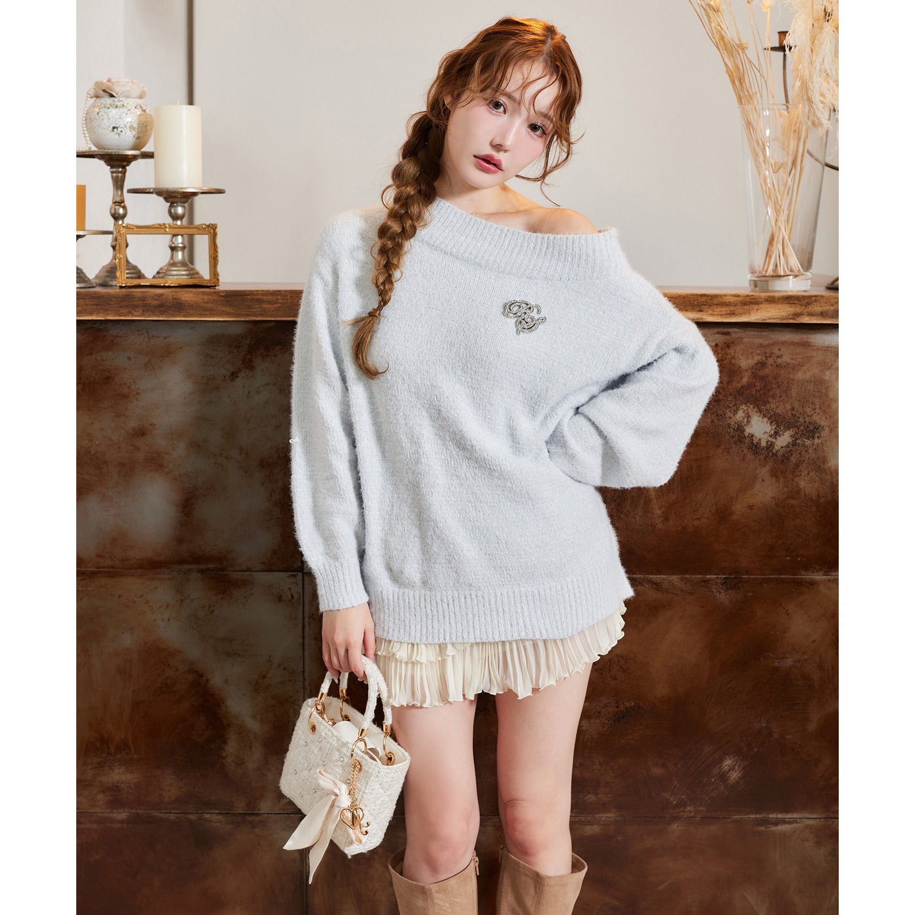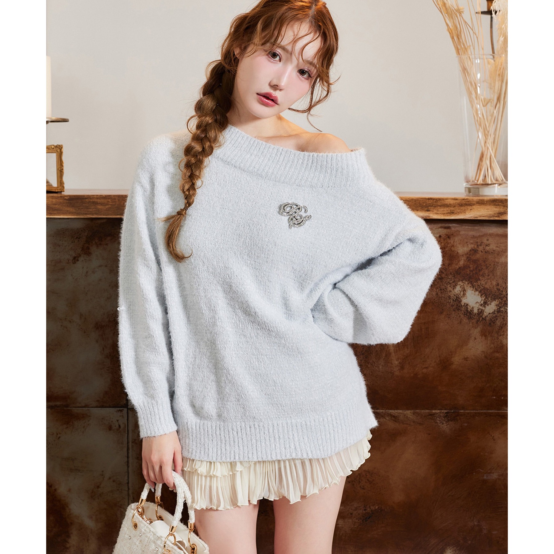 付属のブローチがアクセントになり、スタイリングをぐっと格上げしてくれます。