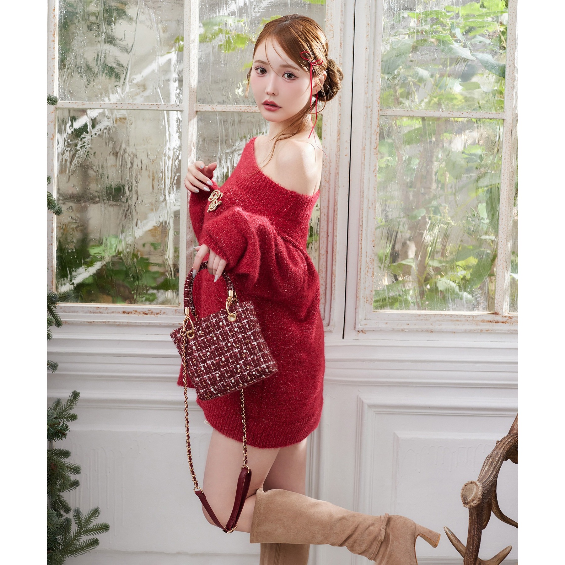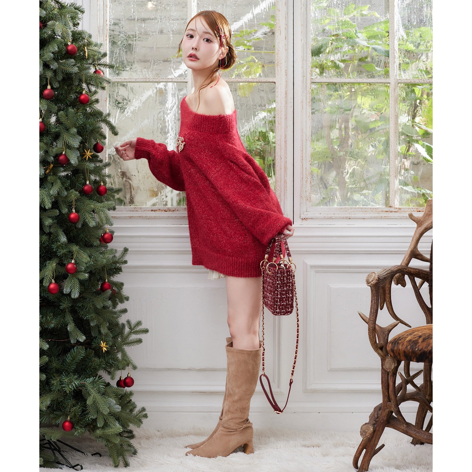 ブローチ付きベロアモールミニニットワンピース
