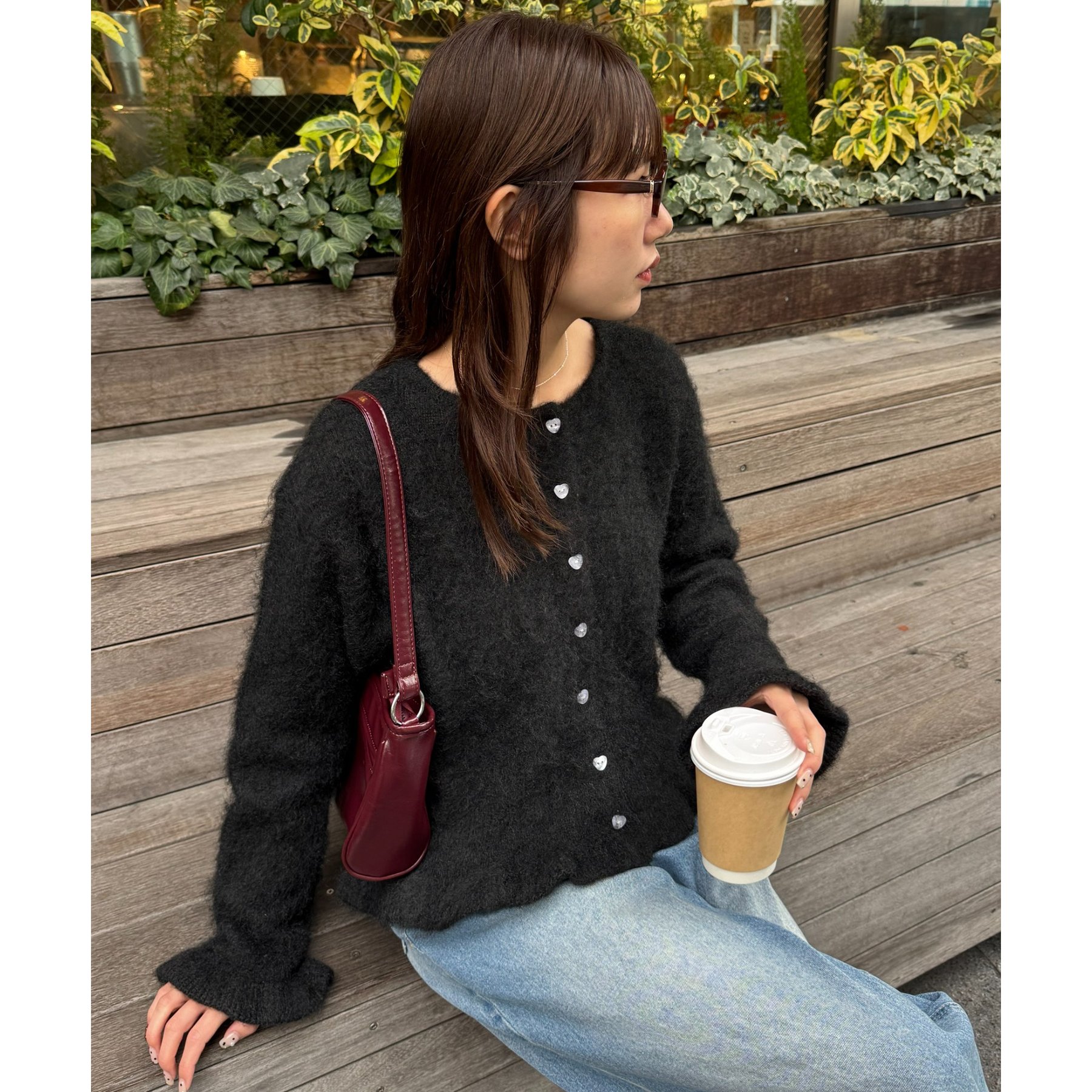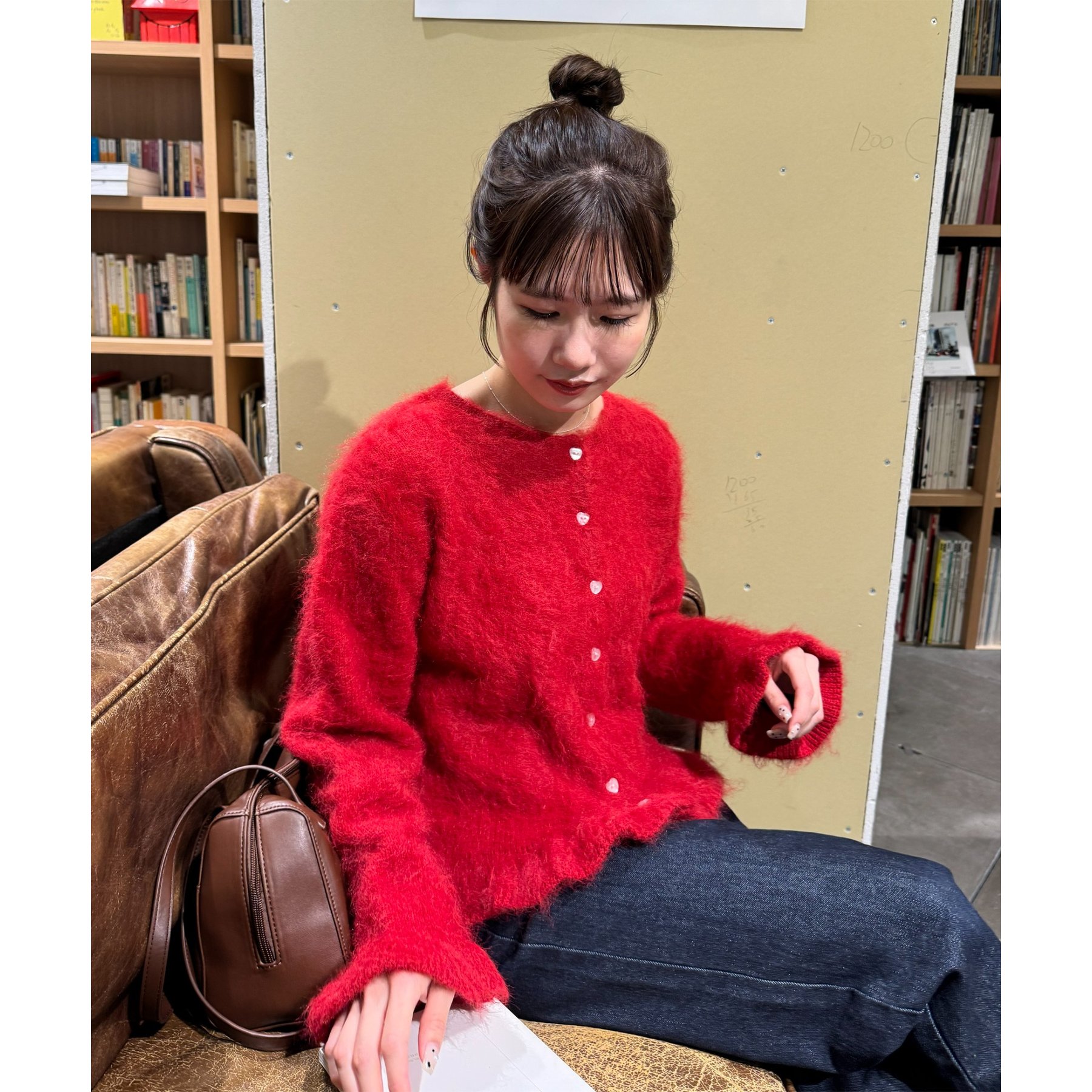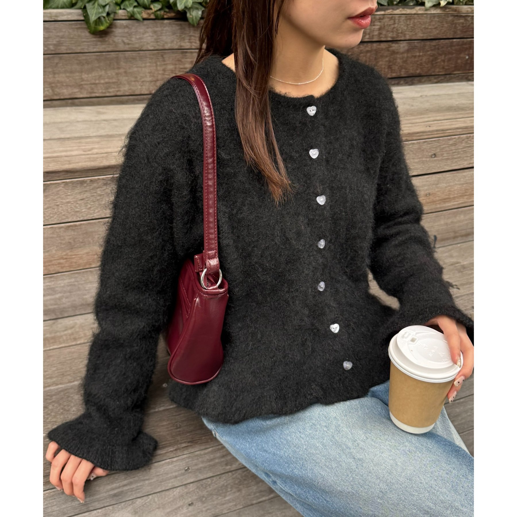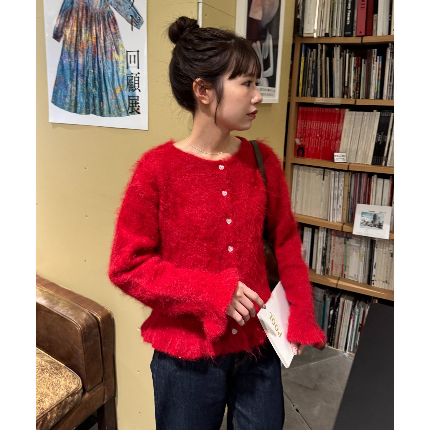 157cmスタッフ:起毛感のある素材がやわらかく、見た目以上に軽い着心地。ハート釦やフリルデザインがさりげないアクセントになり、シンプルなボトムス合わせでも華やかになります。