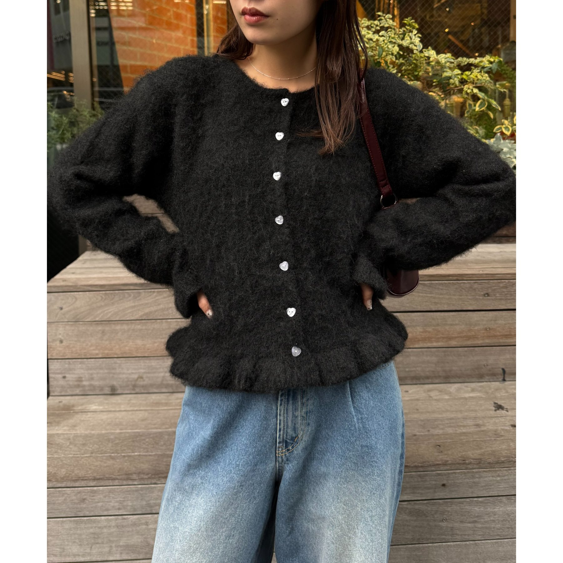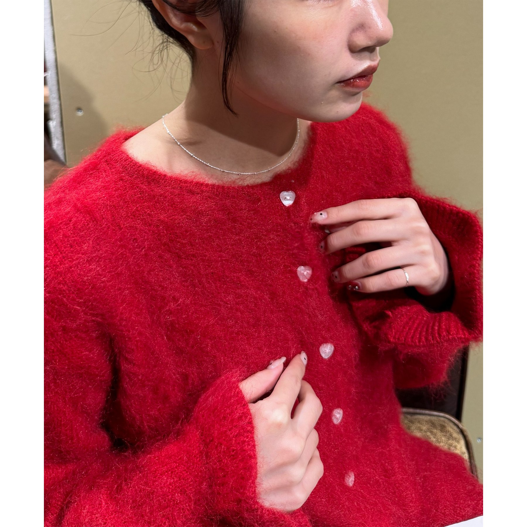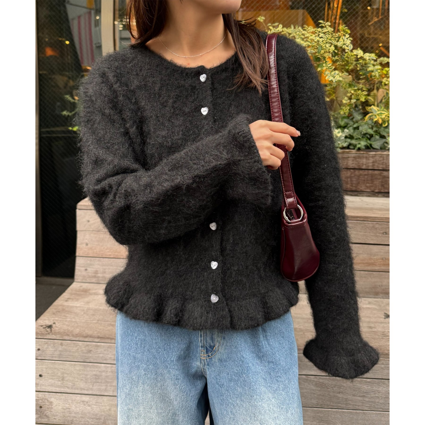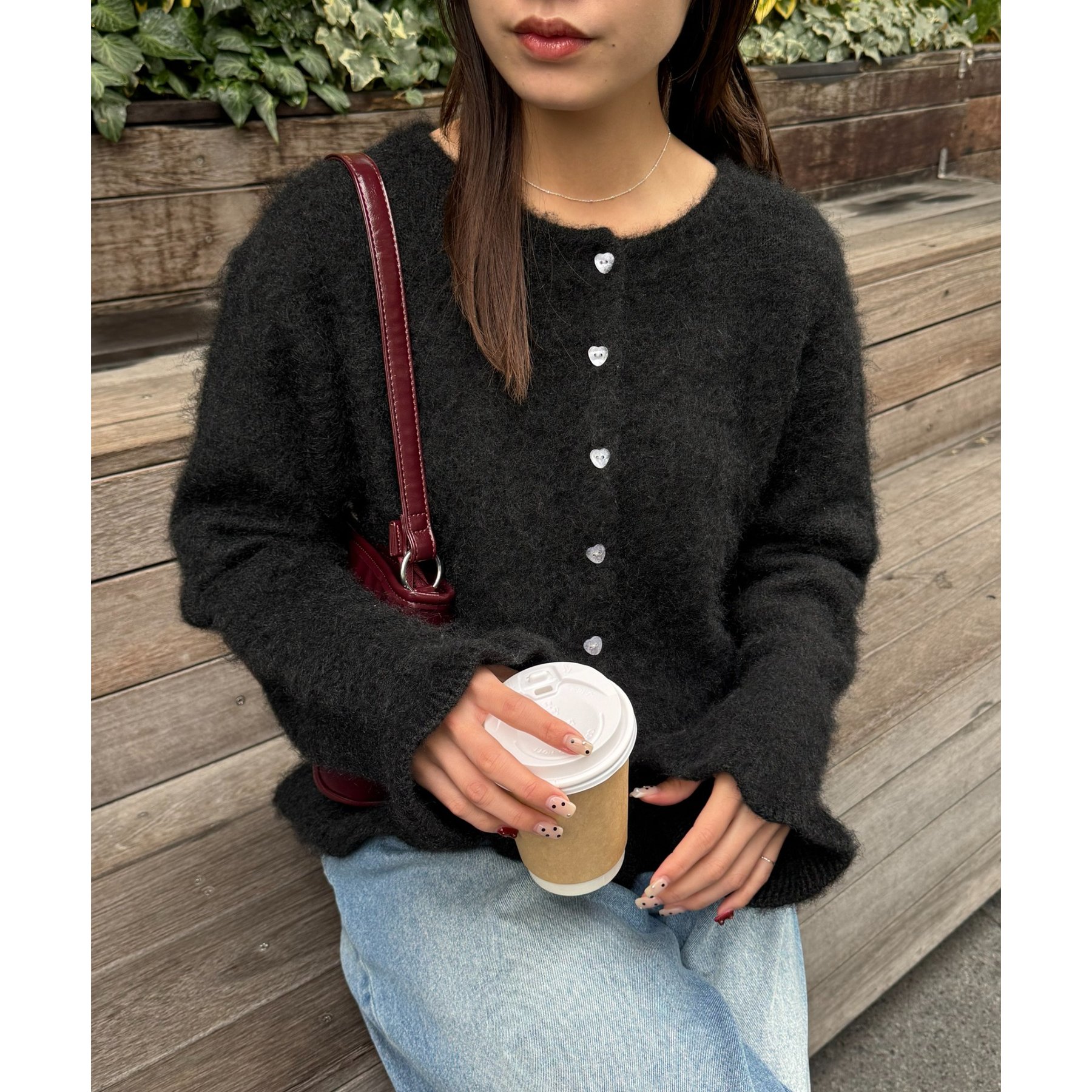 157cmスタッフ:起毛感のある素材がやわらかく、見た目以上に軽い着心地。ハート釦やフリルデザインがさりげないアクセントになり、シンプルなボトムス合わせでも華やかになります。