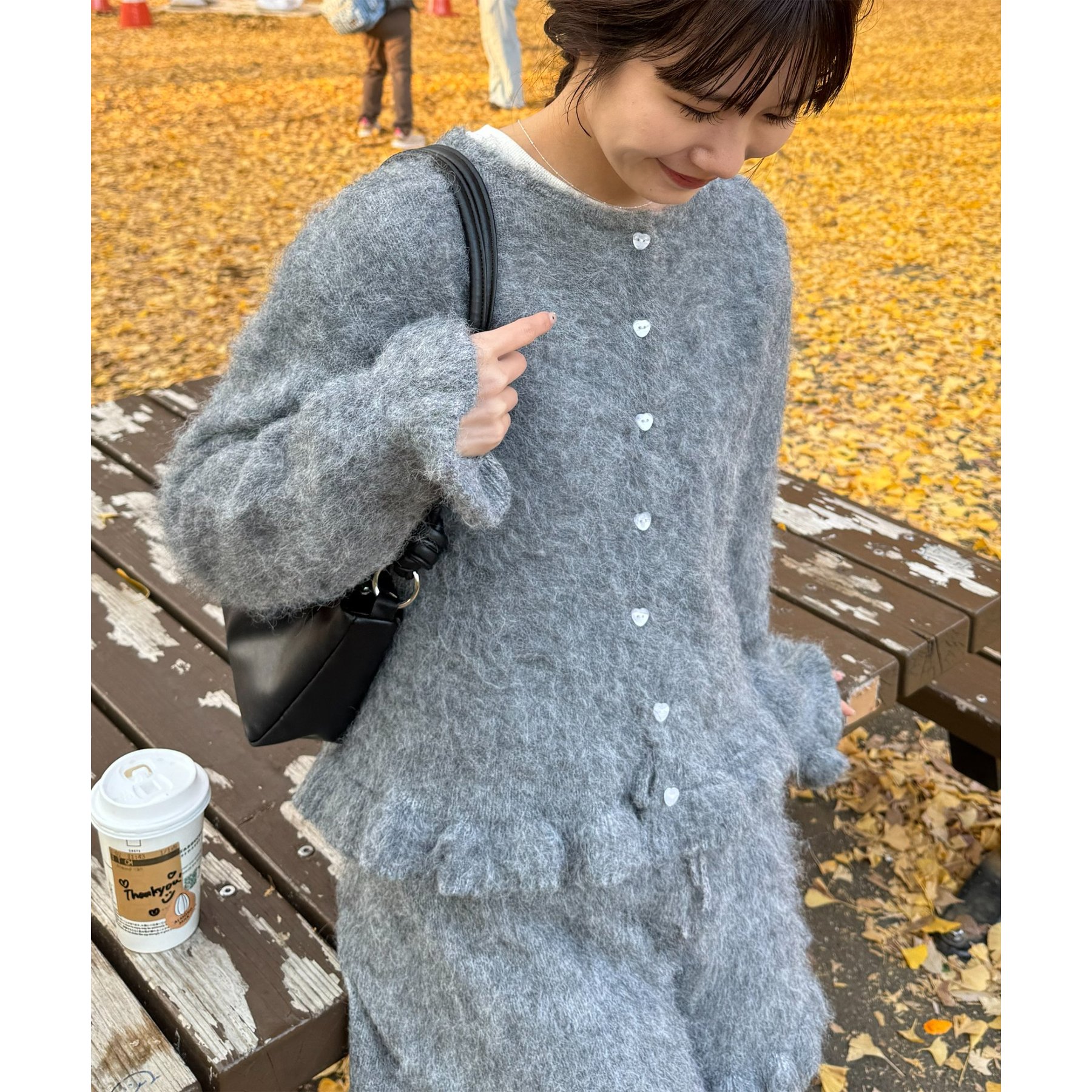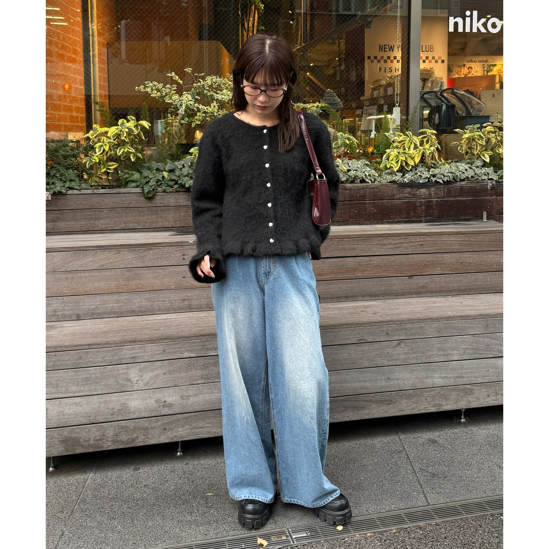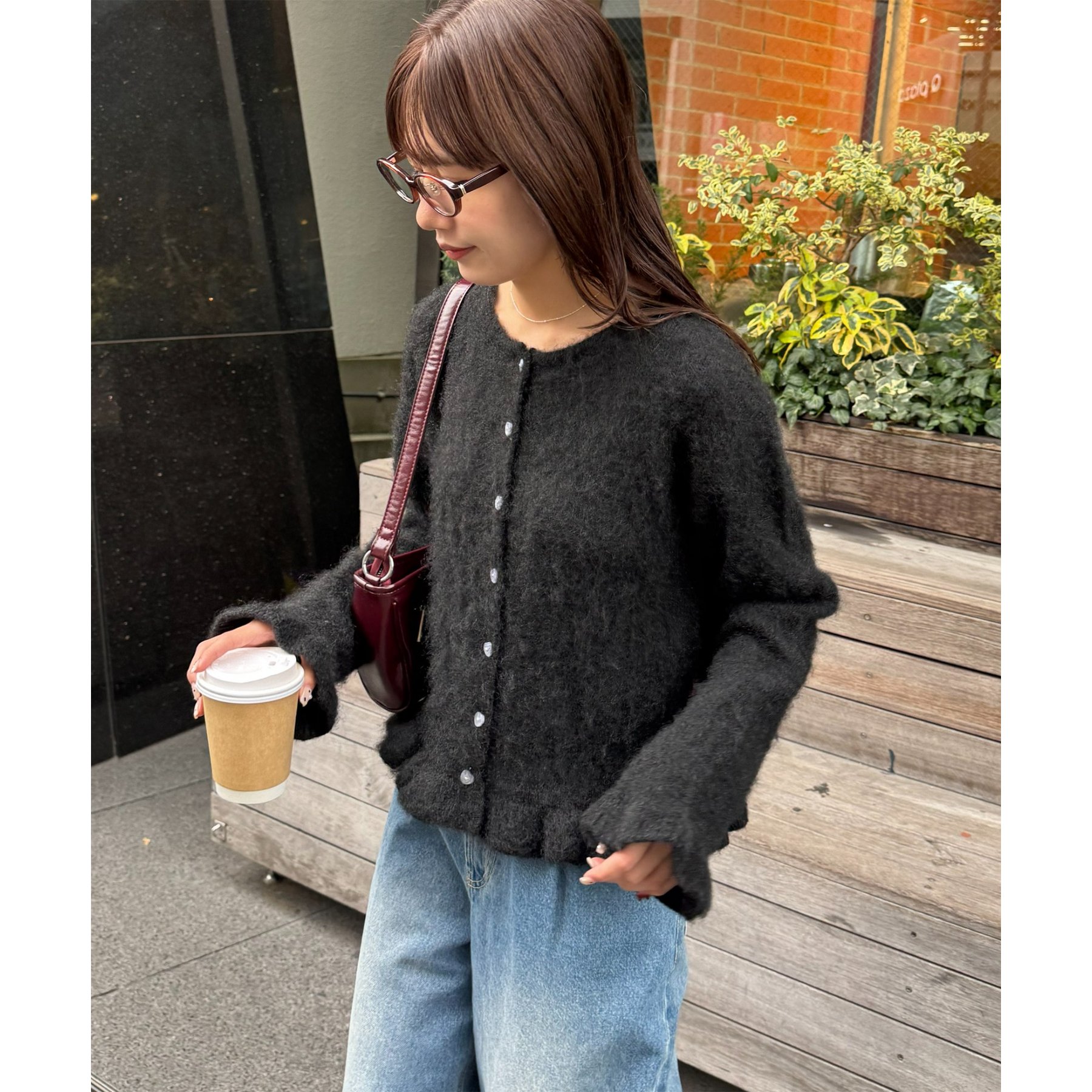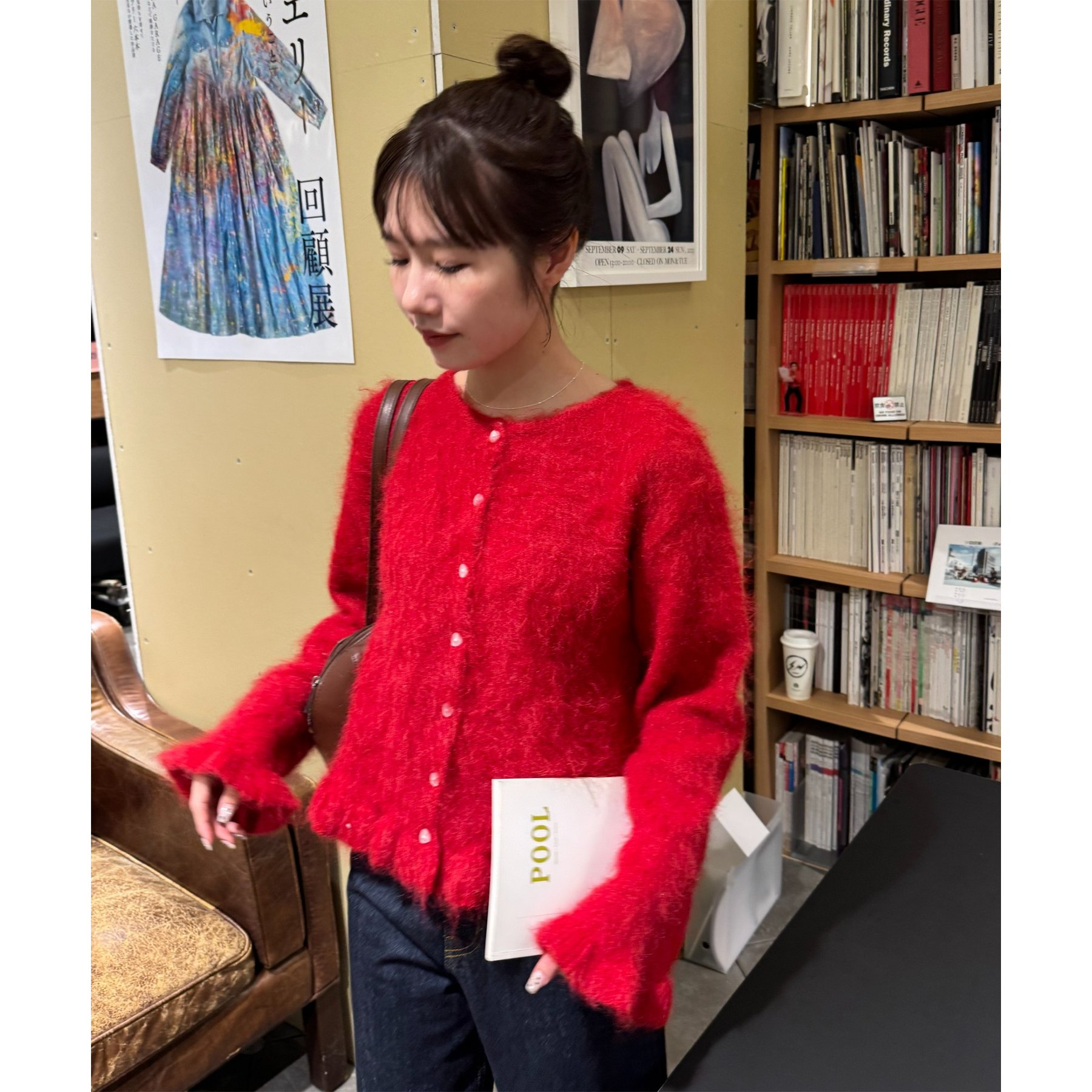157cmスタッフ:起毛感のある素材がやわらかく、見た目以上に軽い着心地。ハート釦やフリルデザインがさりげないアクセントになり、シンプルなボトムス合わせでも華やかになります。