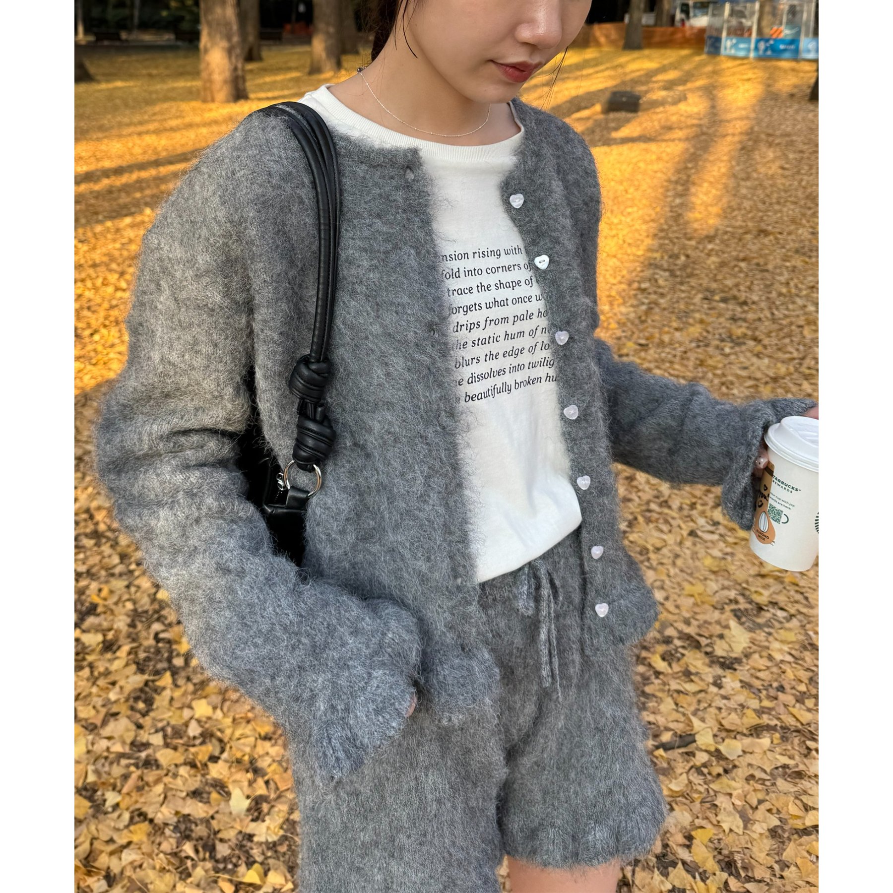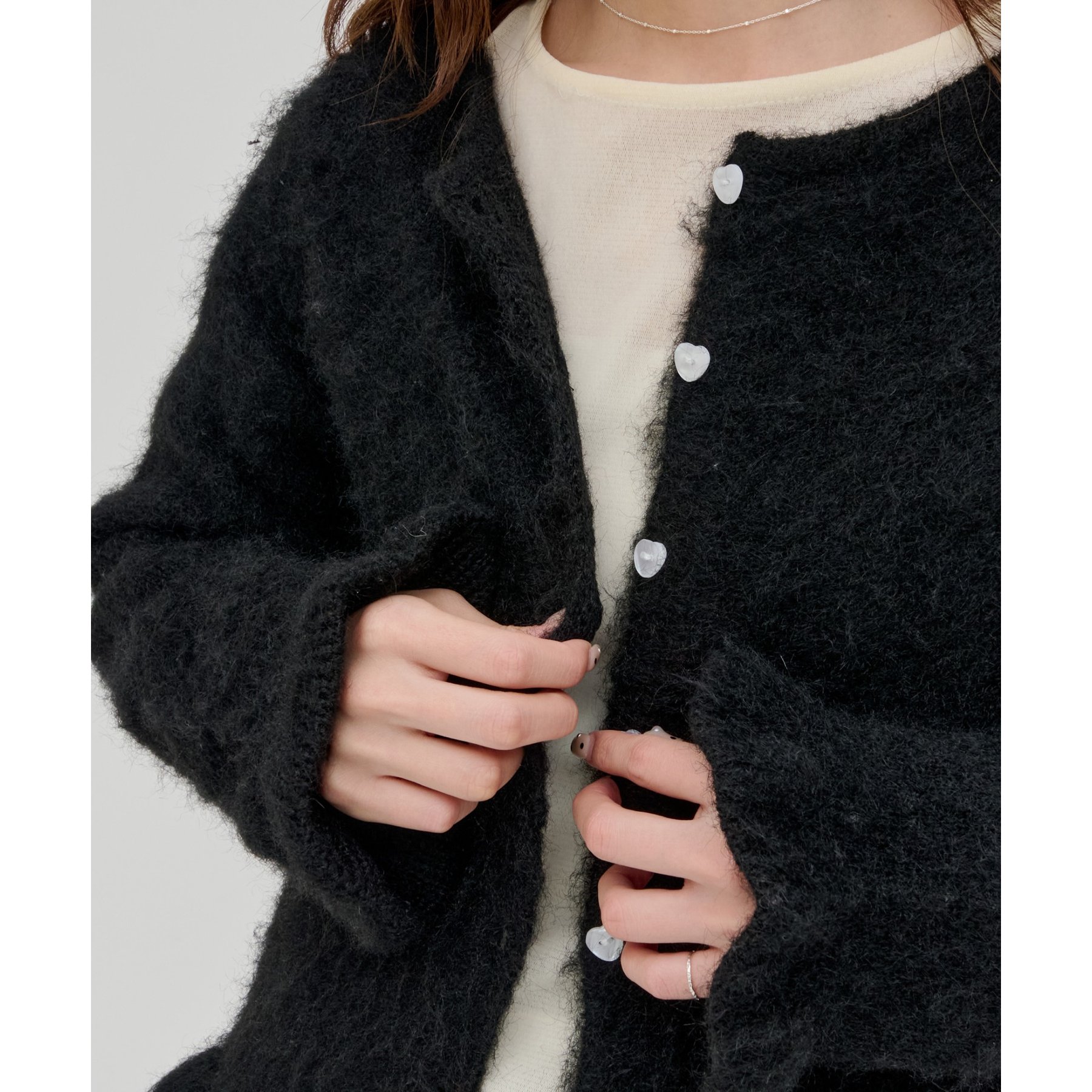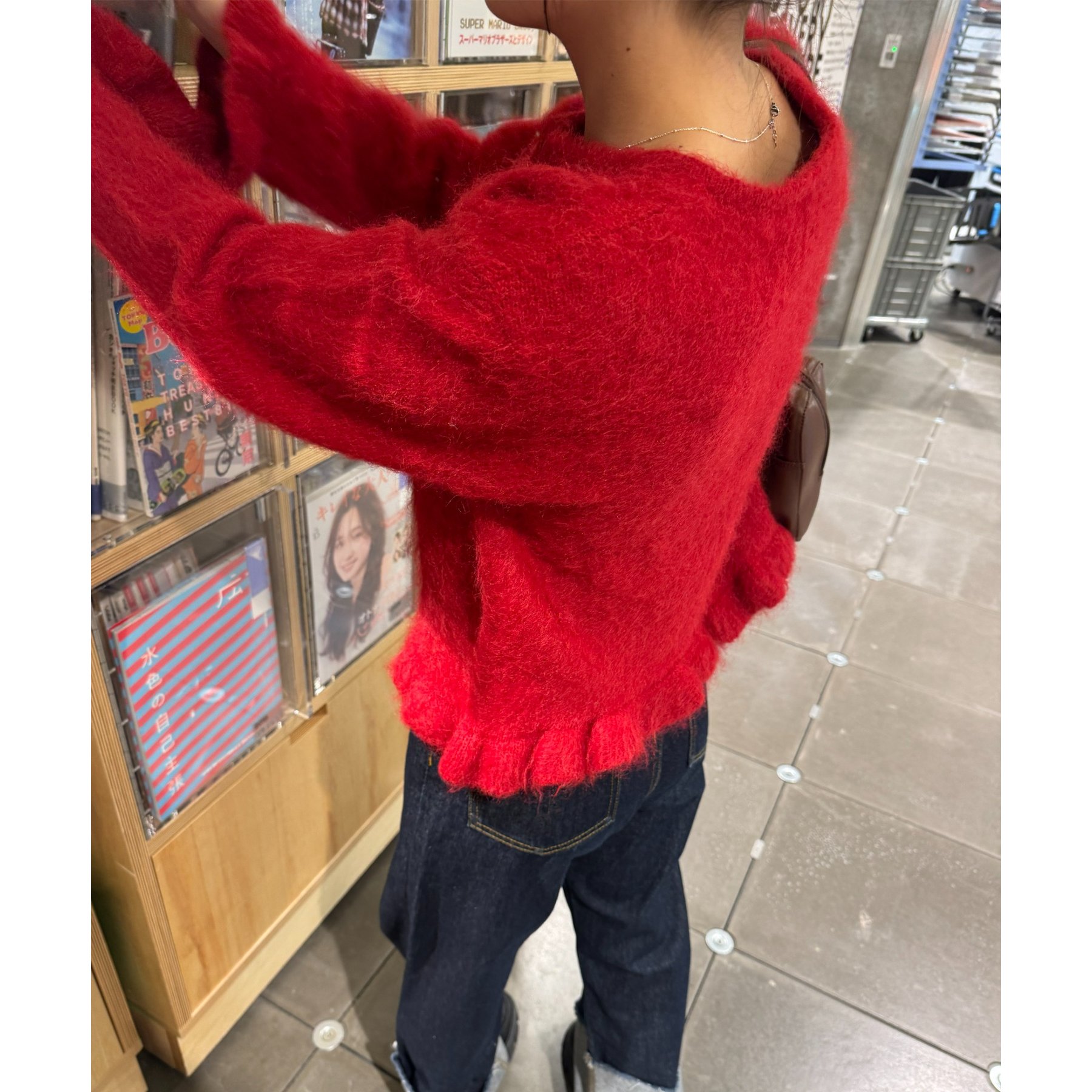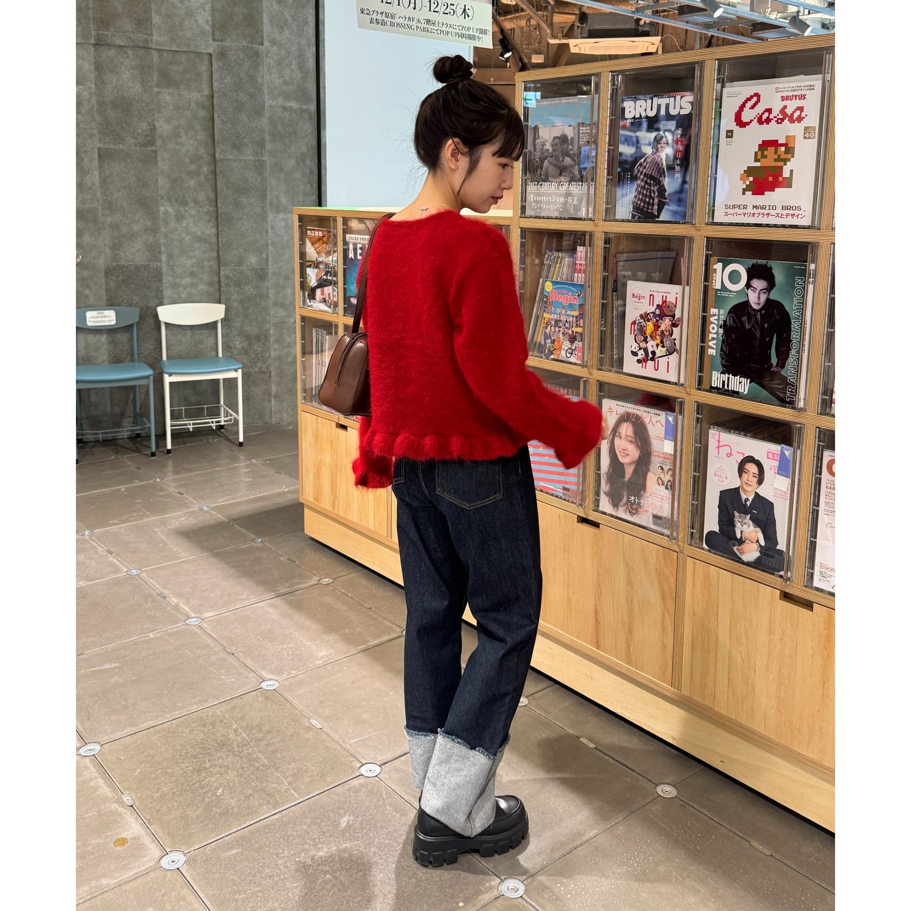 157cmスタッフ:起毛感のある素材がやわらかく、見た目以上に軽い着心地。ハート釦やフリルデザインがさりげないアクセントになり、シンプルなボトムス合わせでも華やかになります。